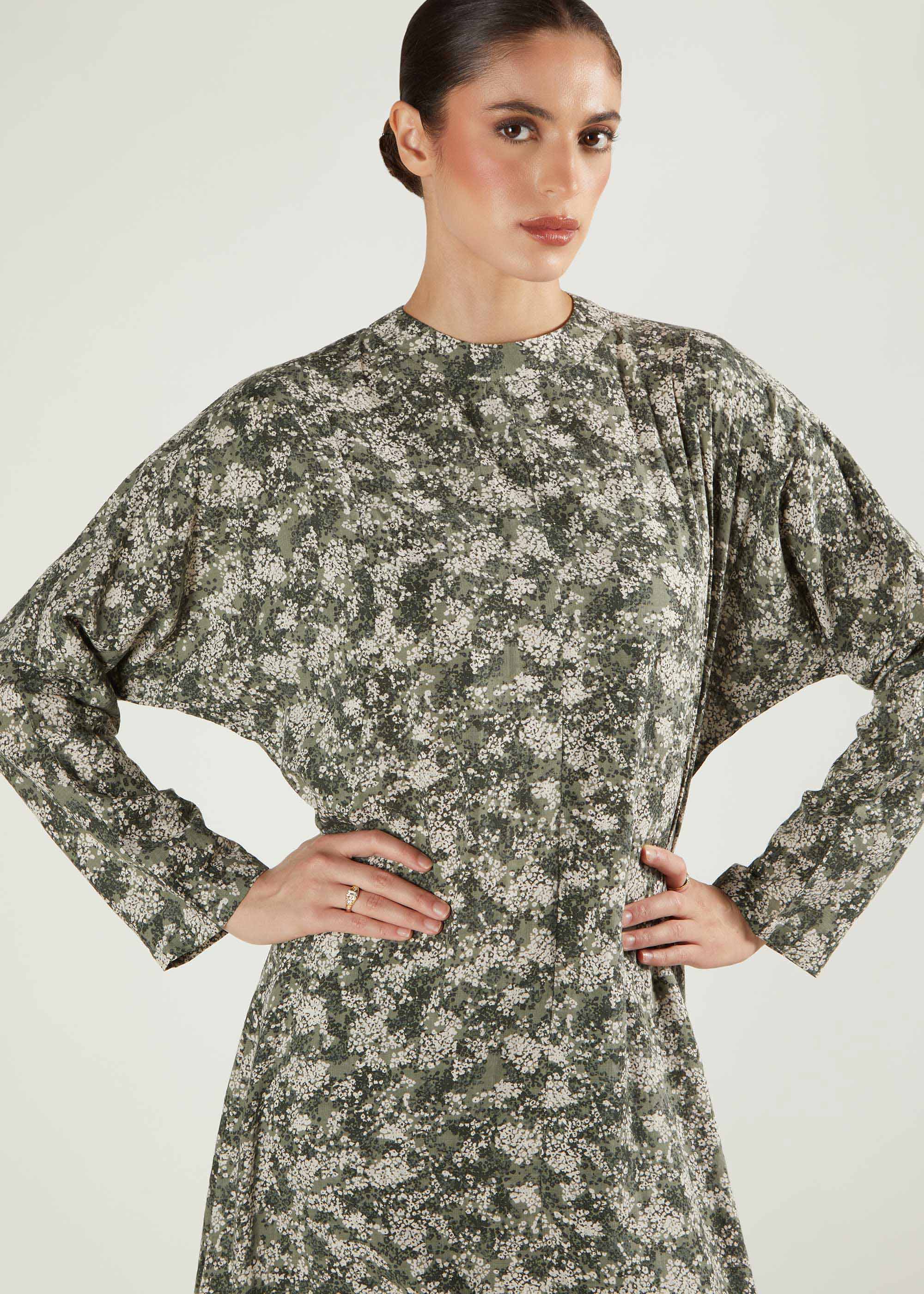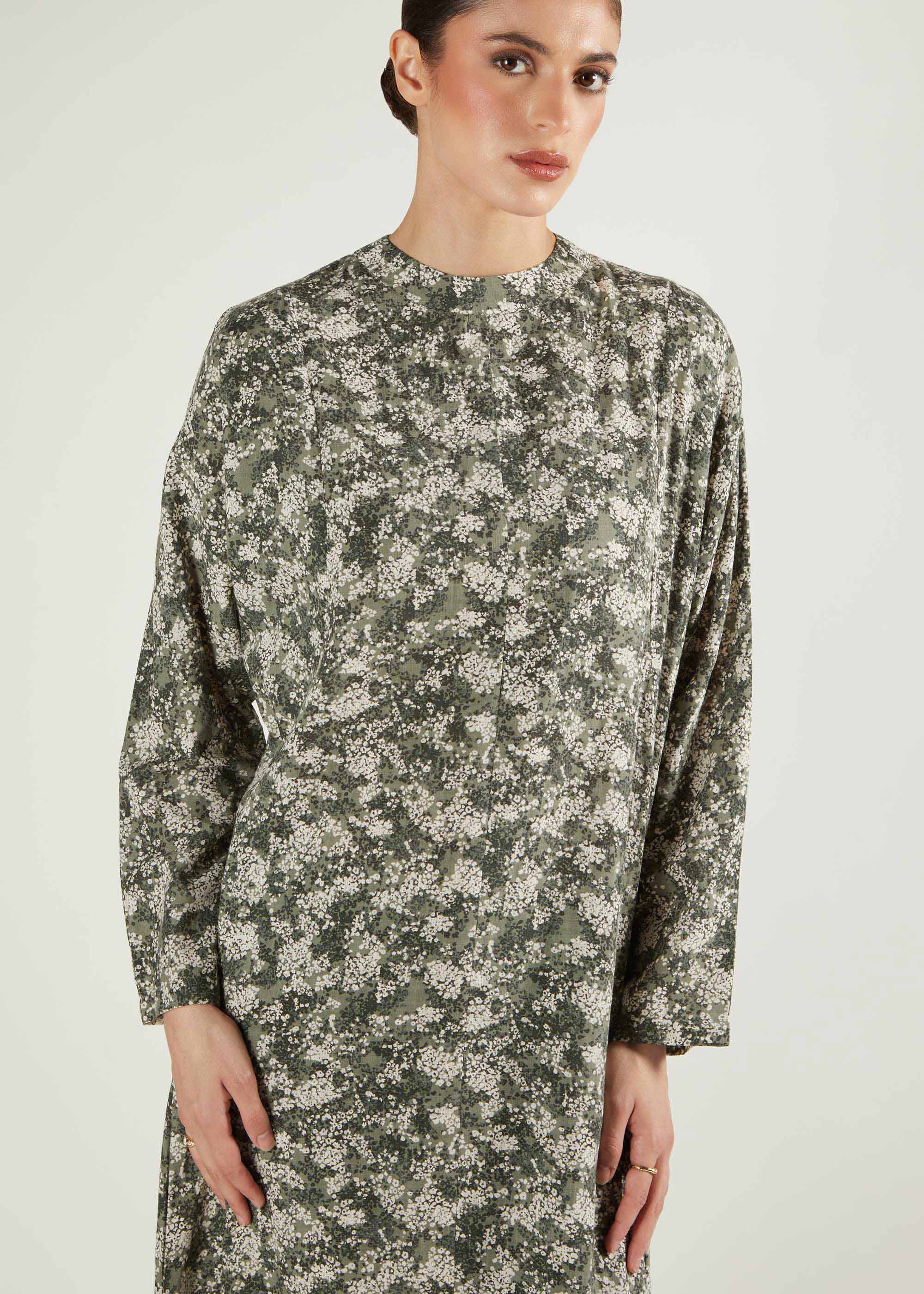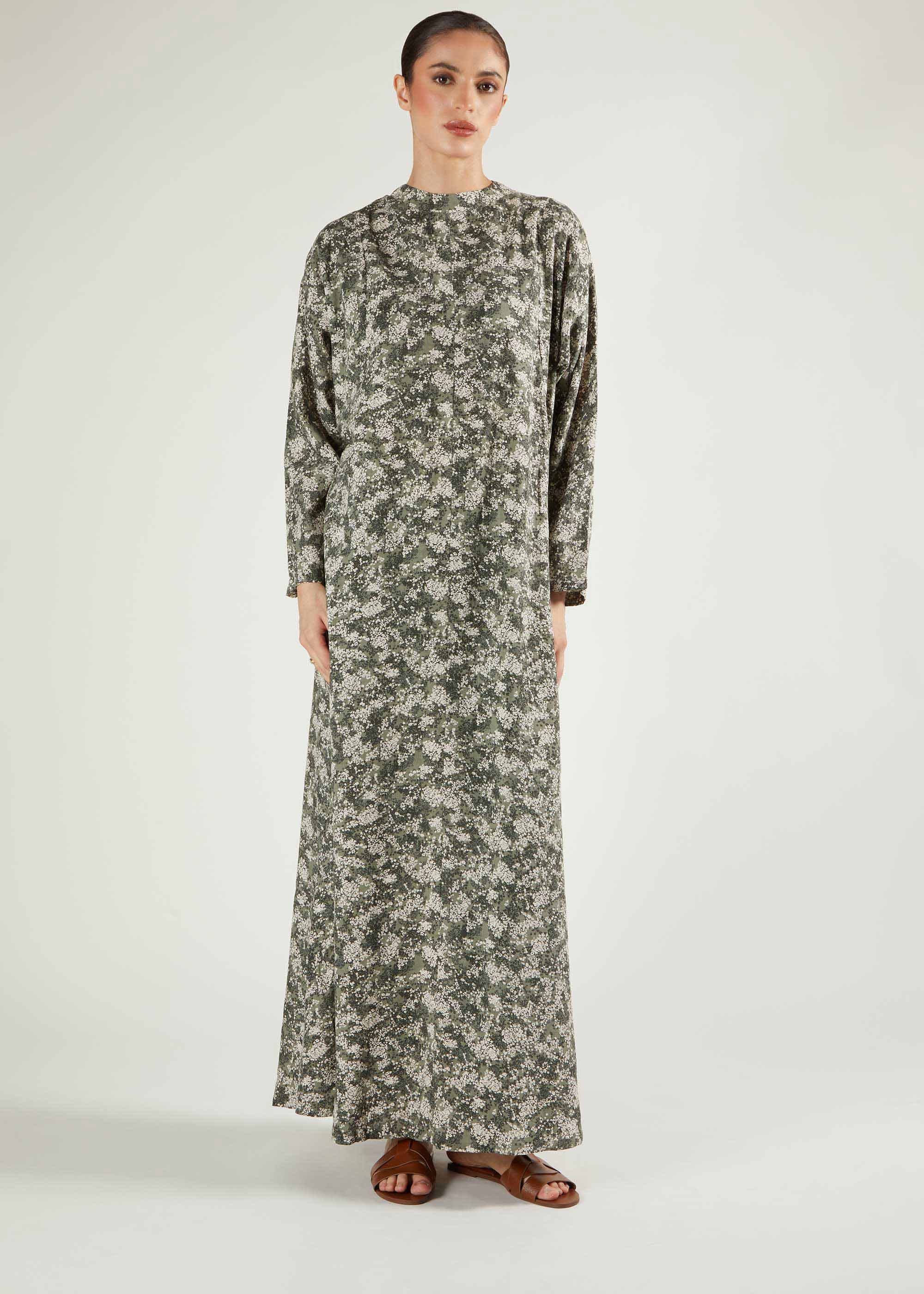 The Green Tea Abaya has an earthy green and white pattern made from cotton. Its modest batwing design complements every body type, while the breathable cotton fabric ensures comfort throughout the day.