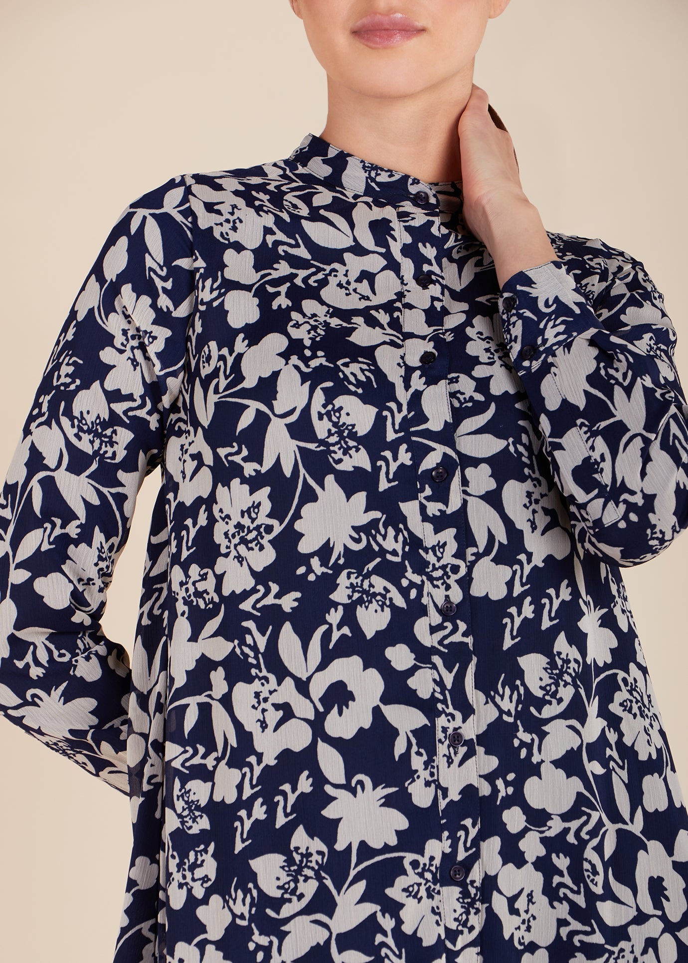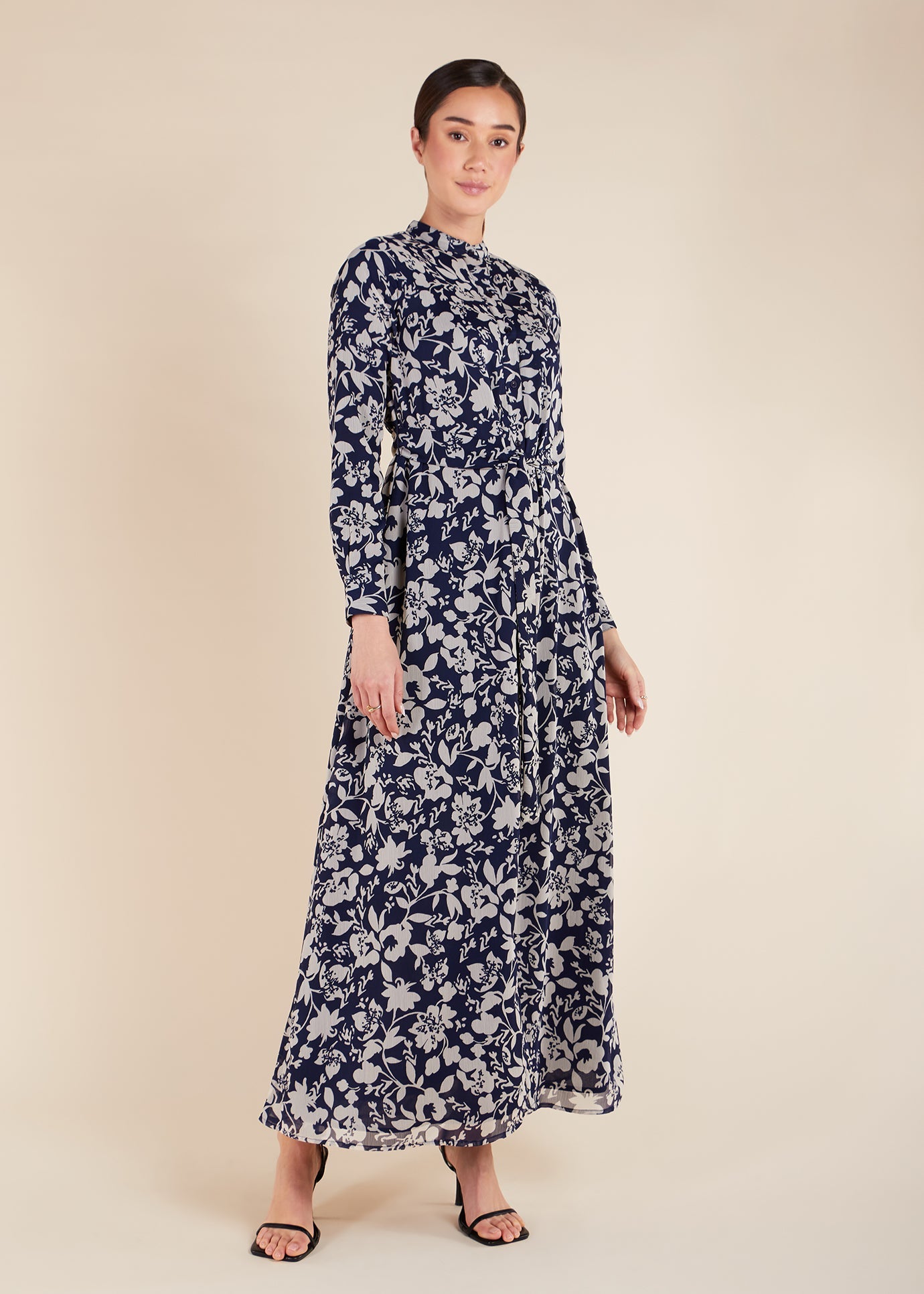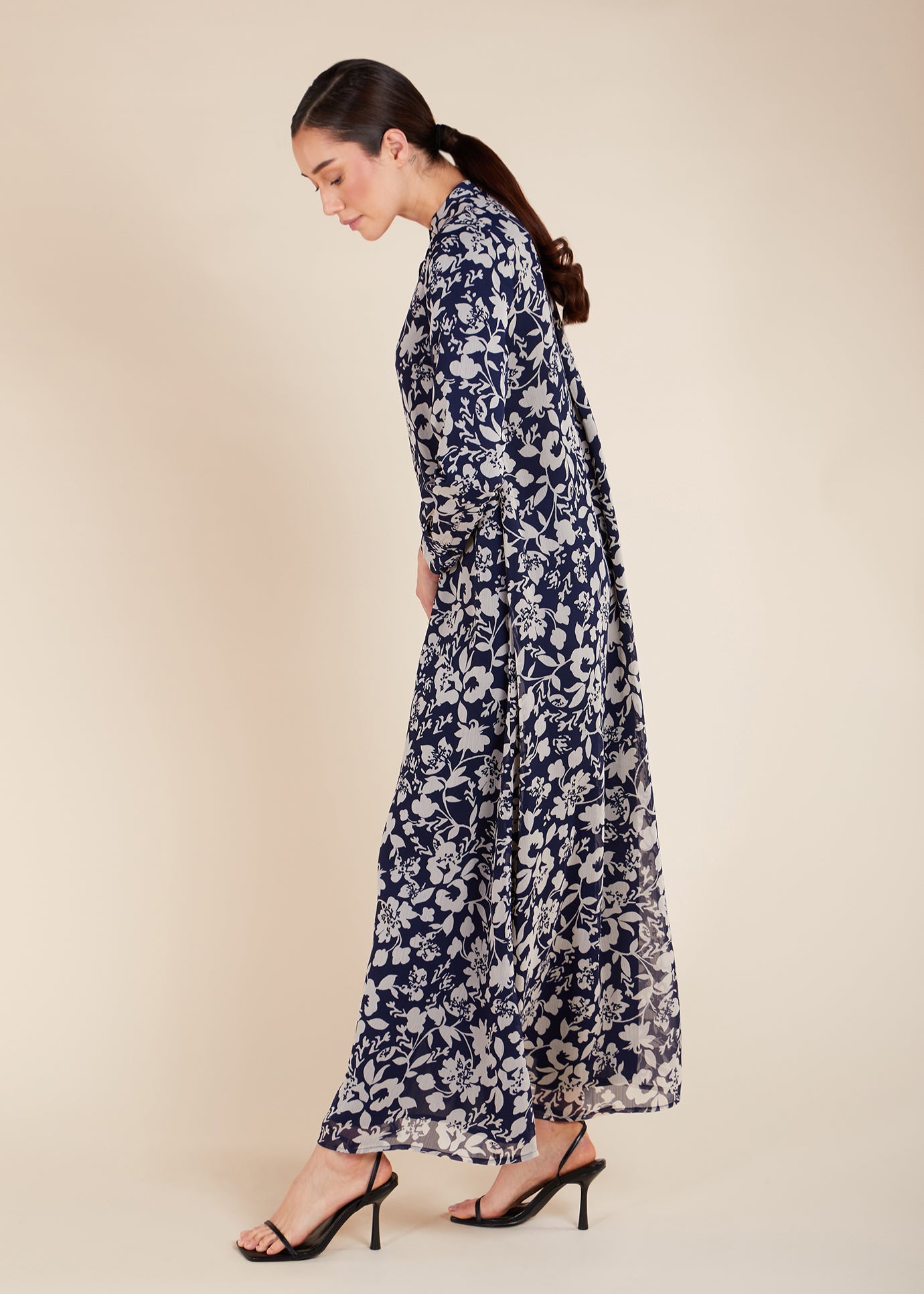 The Haboku Maxi has elegant floral designs against a dark navy background. With a button-up front, detachable belt, and hidden side pockets, this maxi dress also features a classic mandarin collar and a regular A-line cut. Perfect for any formal occasion.