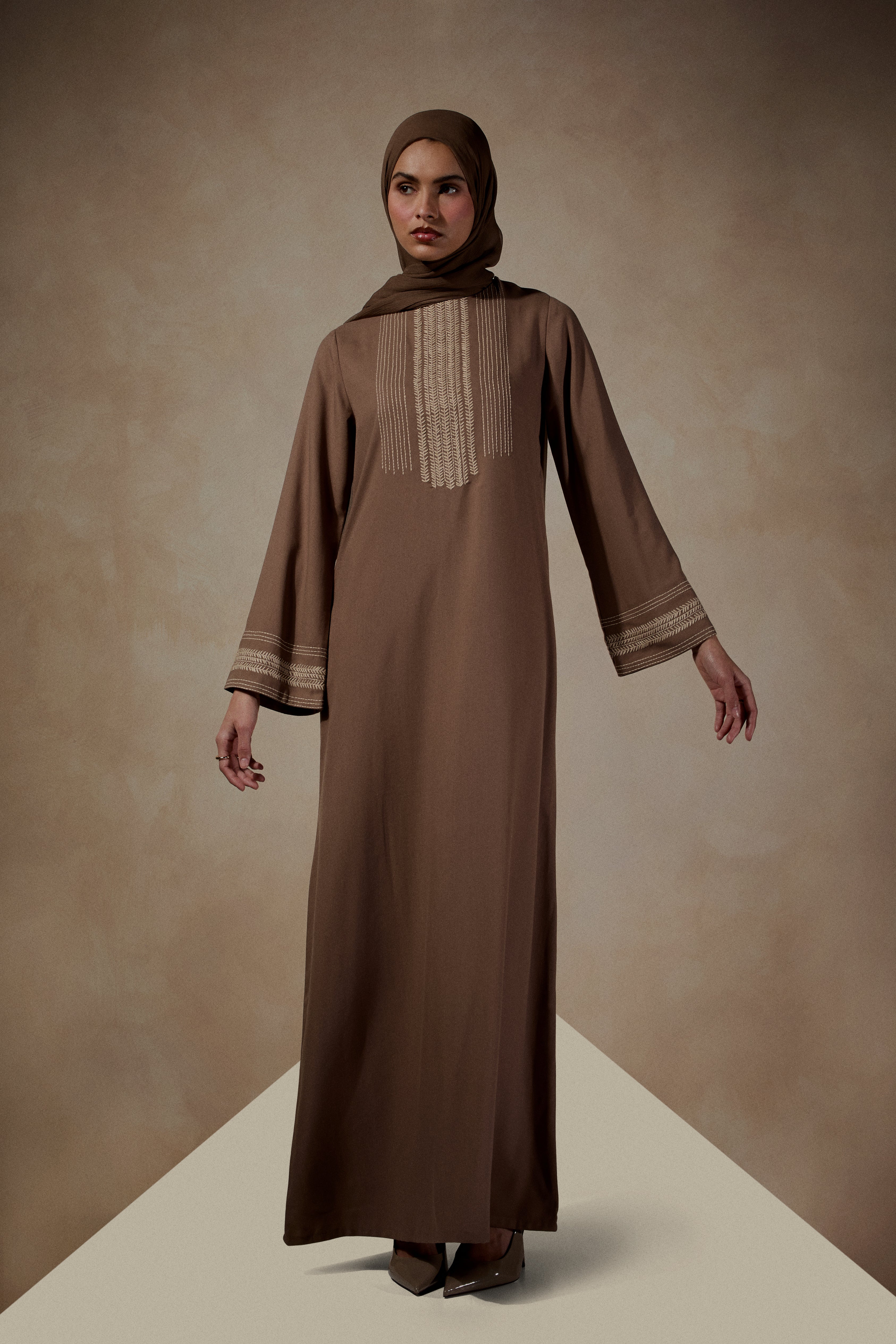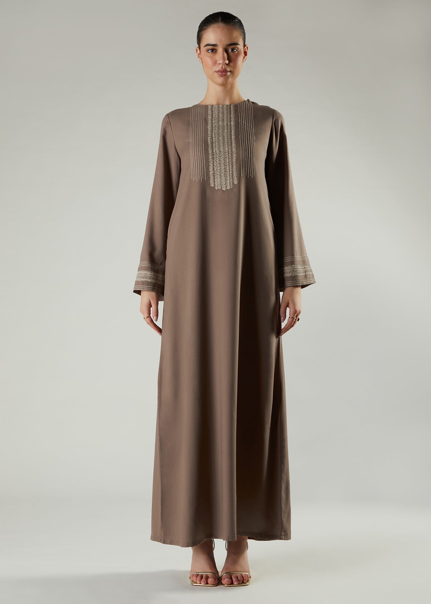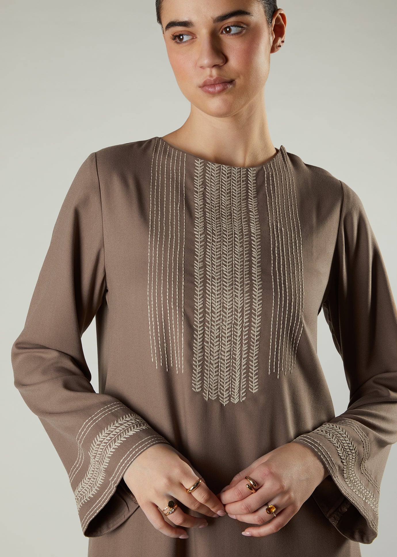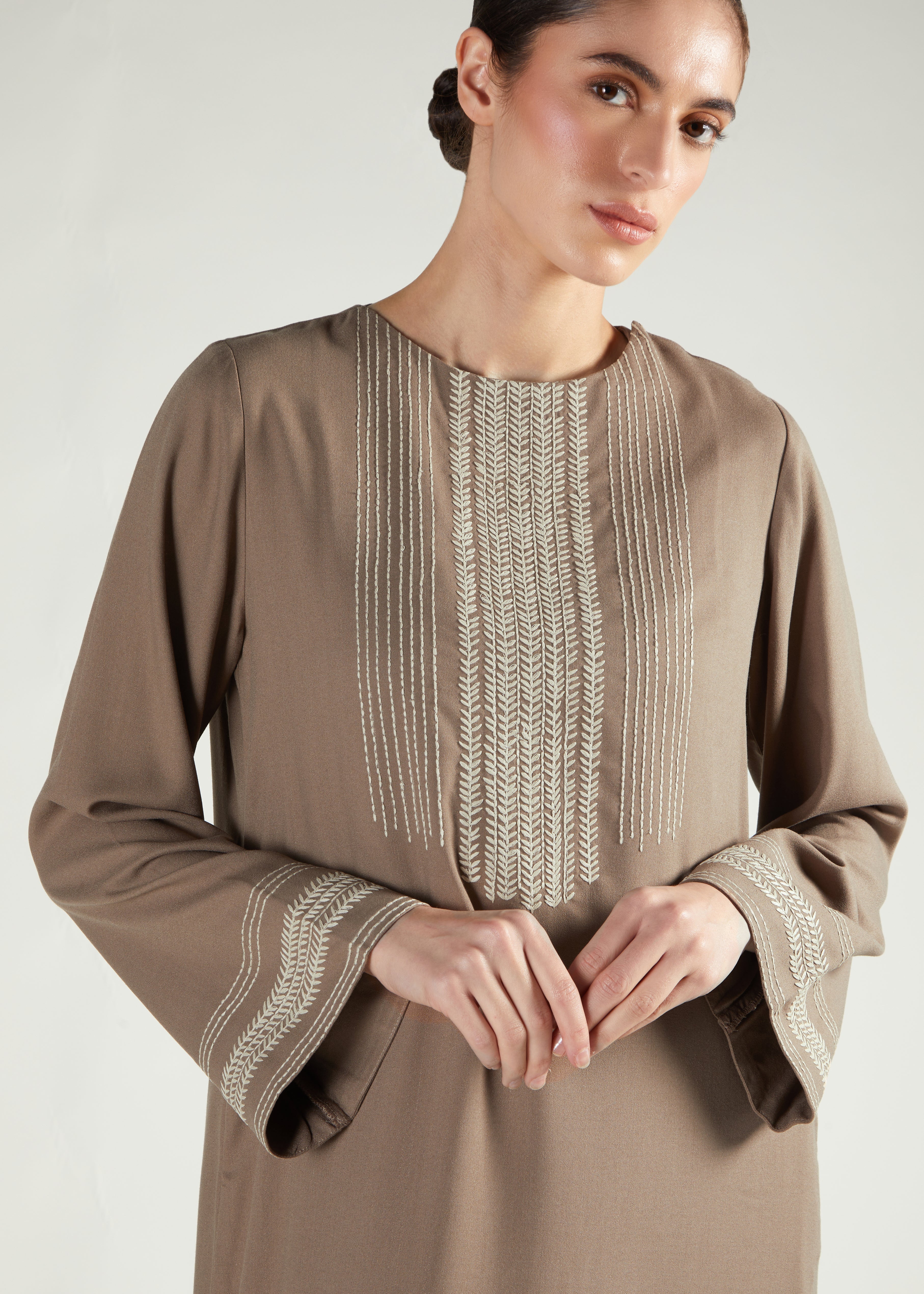 This abaya is designed with classic herringbone style embroidery in a bone white shade against a beautiful soft beige colour. Features an A-line silhouette with regal style embroidery on bodice and cuffs and features discreet side pockets too.