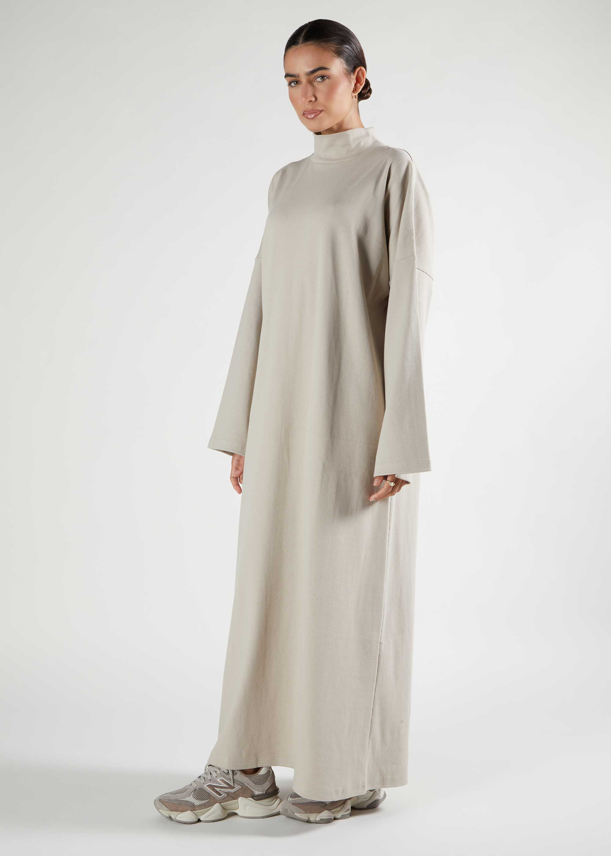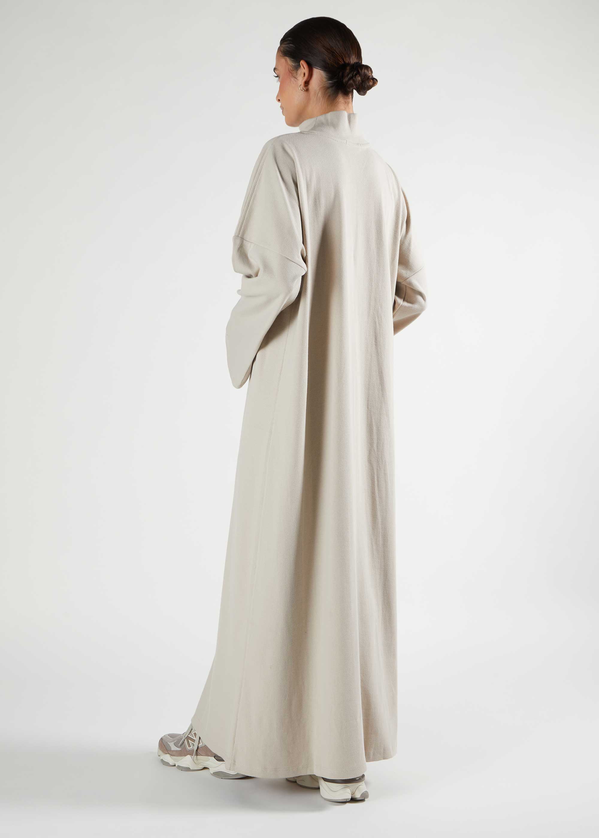 Made from fine ribbed fabric, this essential mid-weight abaya is perfect for layering with outerwear, providing warmth throughout the cooler seasons. Featuring a loose fit and subtly wider sleeves, it comes in three versatile neutral shades for effortless styling.