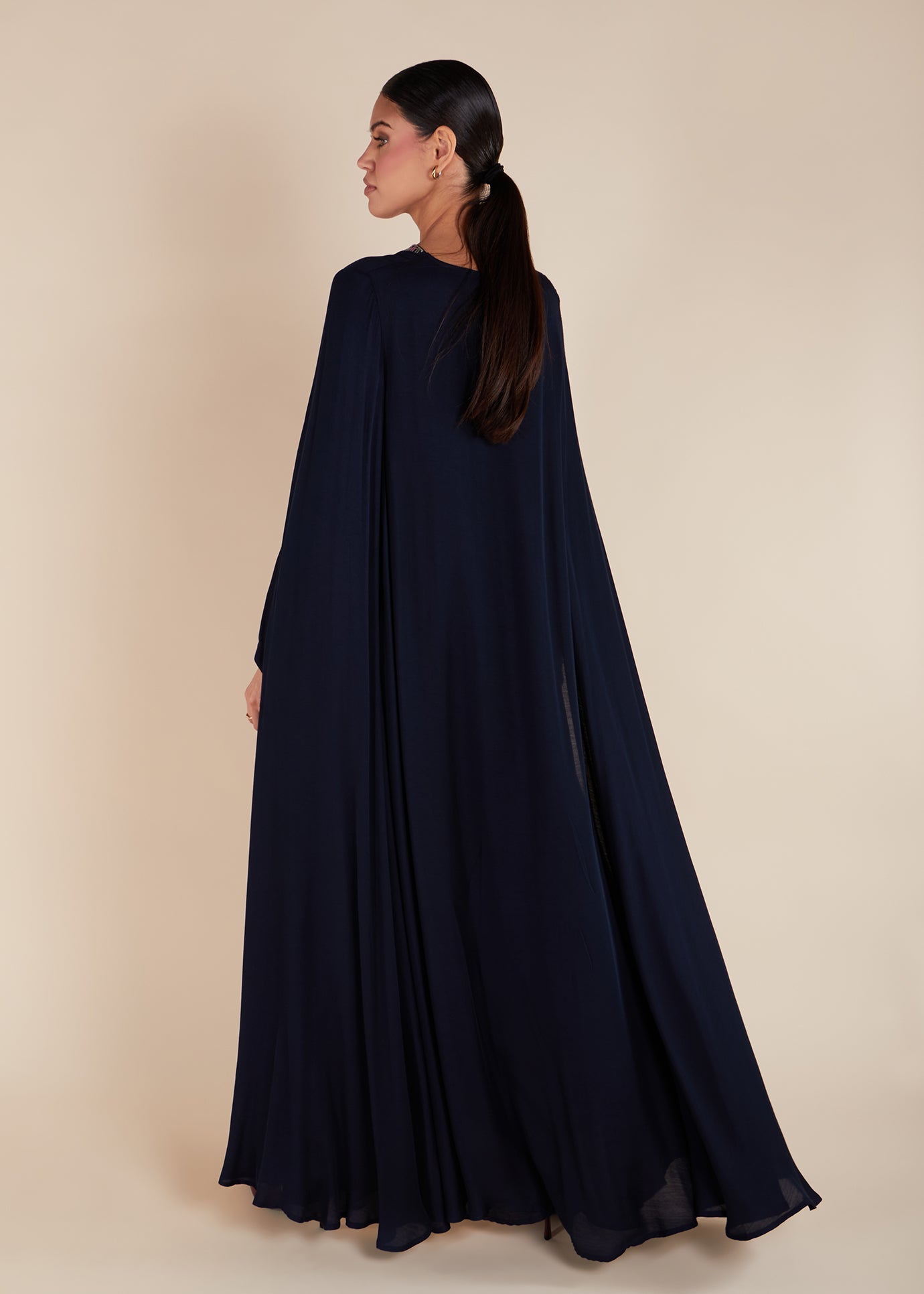 This showstopping limited edition Abaya features an attached cape that adds a touch of glamour to its flowing design. Its deep navy colour and fully lined inner piece make for a stunning combination. The bodice has intricate Tatreez embroidery, adding to its beauty and elegance.