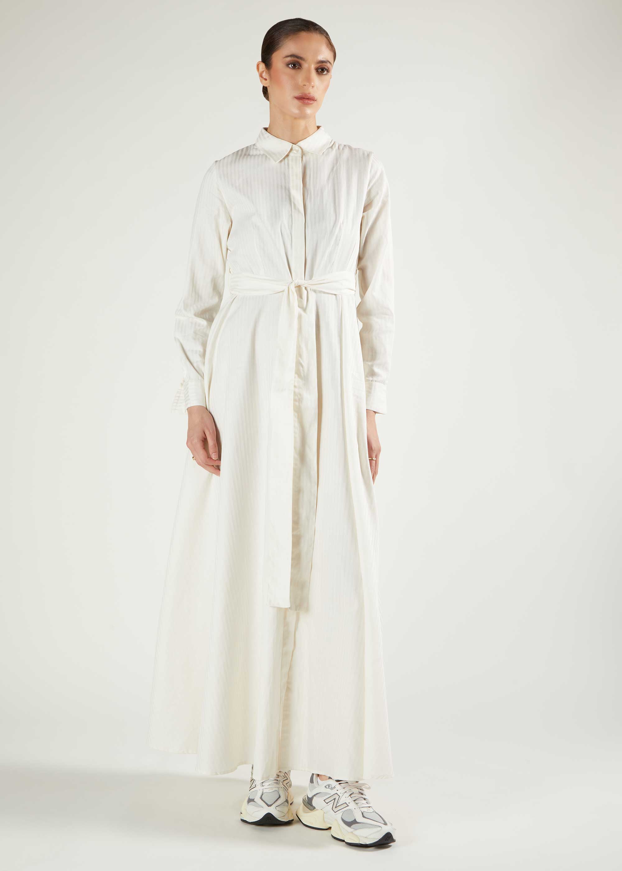 This maxi shirt showcases self-printed stripes in a timeless off-white shade. The fabric’s starched texture provides a crisp, structured appearance. Designed with collars, cuffs, hidden buttons, and an optional belt for waist definition, it combines classic tailoring with versatile styling options.