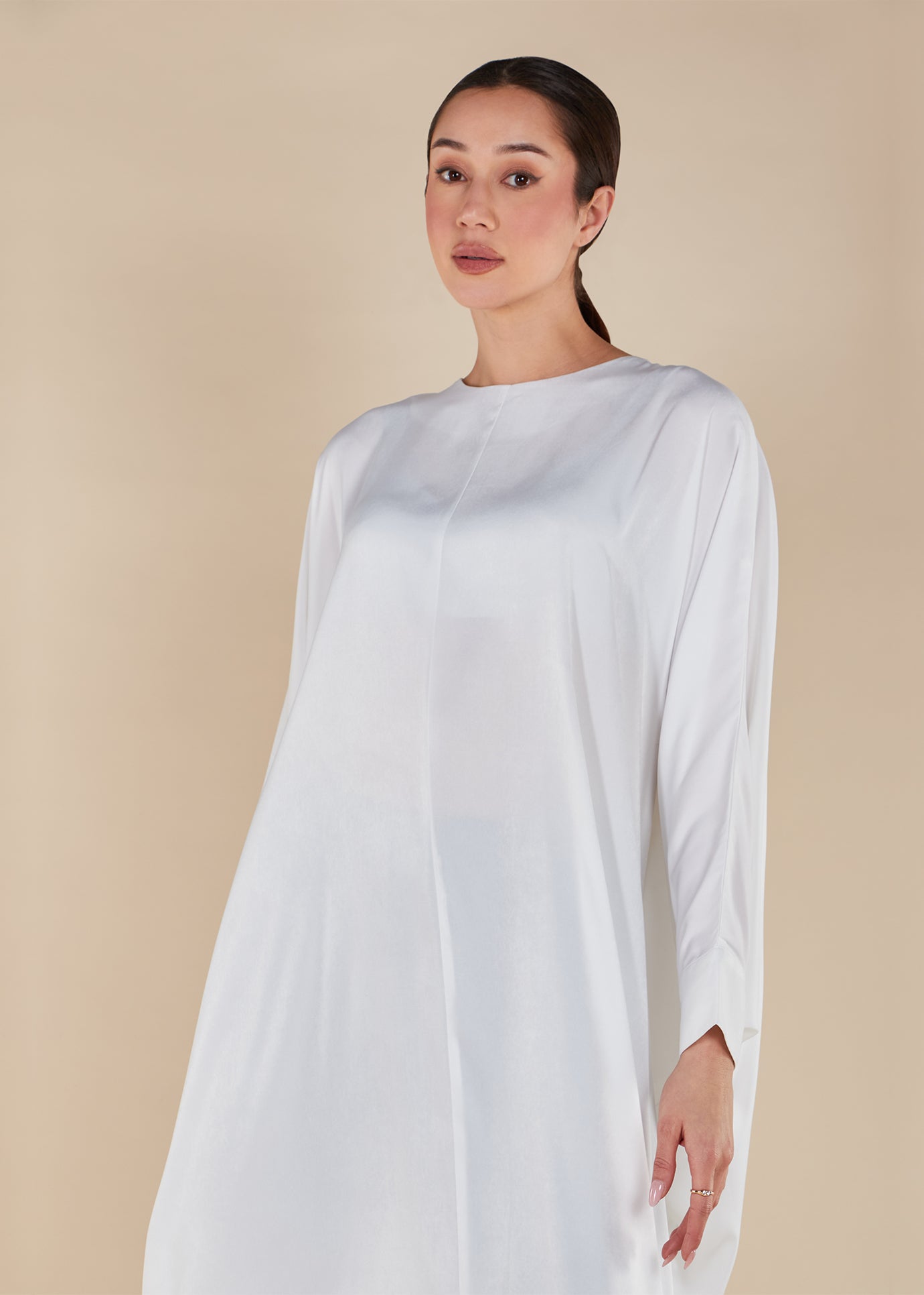 The kaftan abaya in white is fully lined and versatile, serving as both the ideal prayer outfit and a perfect option for summer dressing. Whether dressed up with accessories or worn simply, the beautiful flowy design is perfect for any occasion. To avoid any transparency, we recommend wearing a skin-coloured undergarment with the white kaftan.