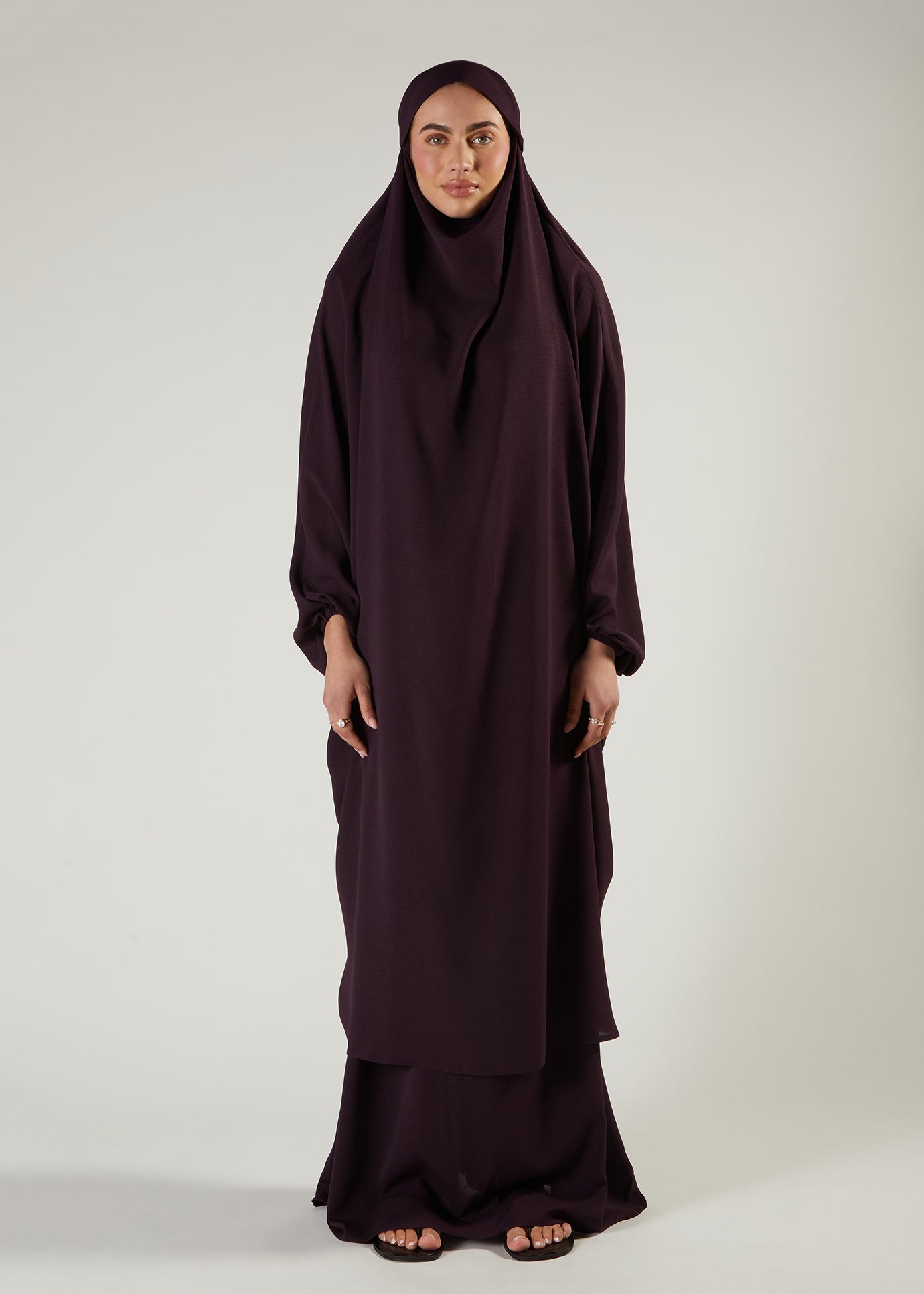 This is an easy to wear prayer outfit. A two-part set featuring a pull-on skirt and oversized tie back khimar. Made from a soft cheesecloth fabric.