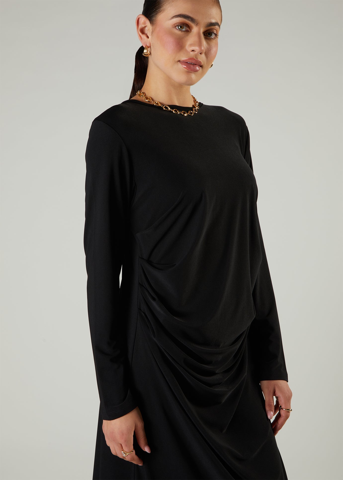 This maxi is made from a fluid stretchy fabric, featuring waterfall gathers down the front of the garment.