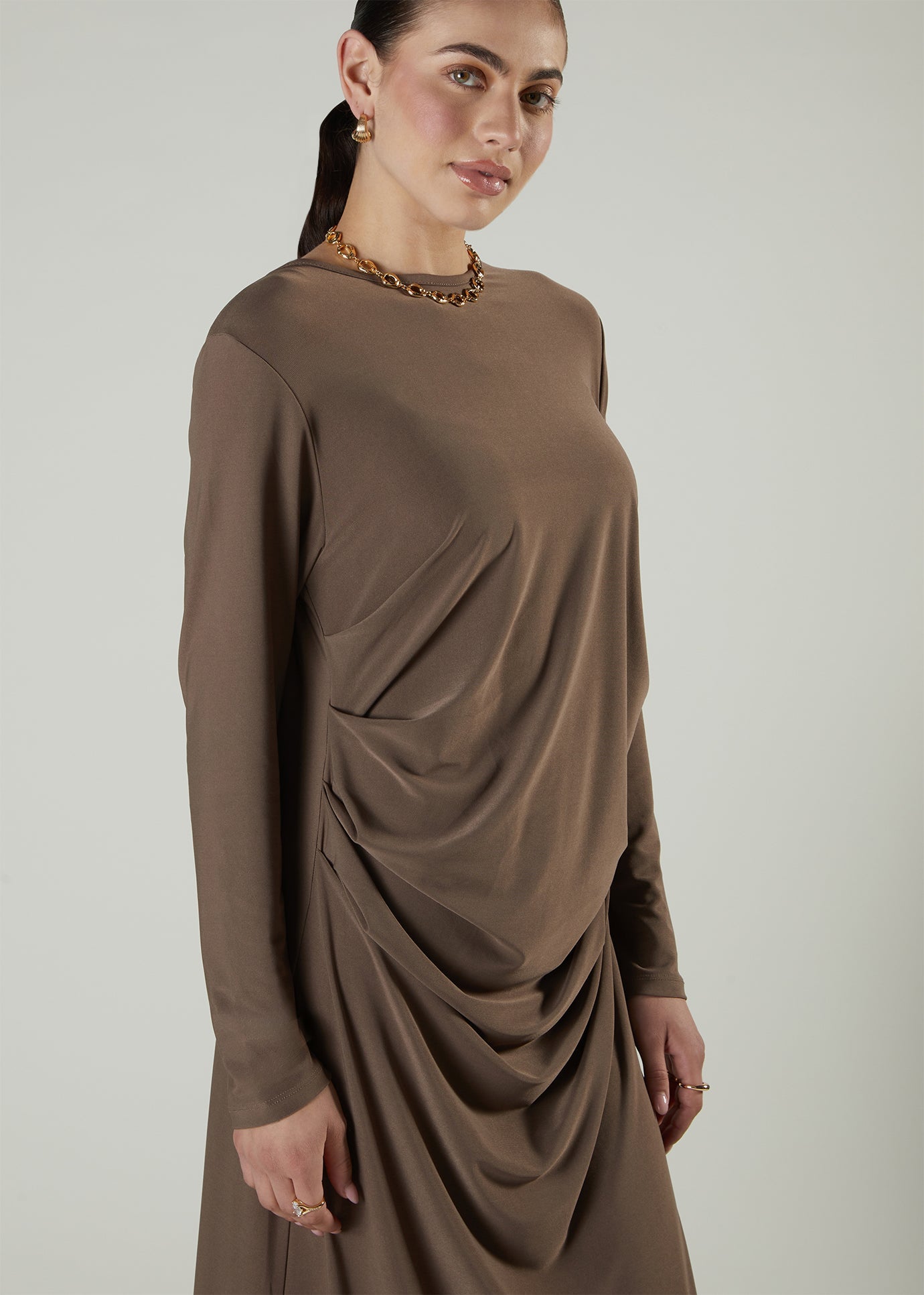 This maxi is made from a fluid stretchy fabric, featuring waterfall gathers down the front of the garment.