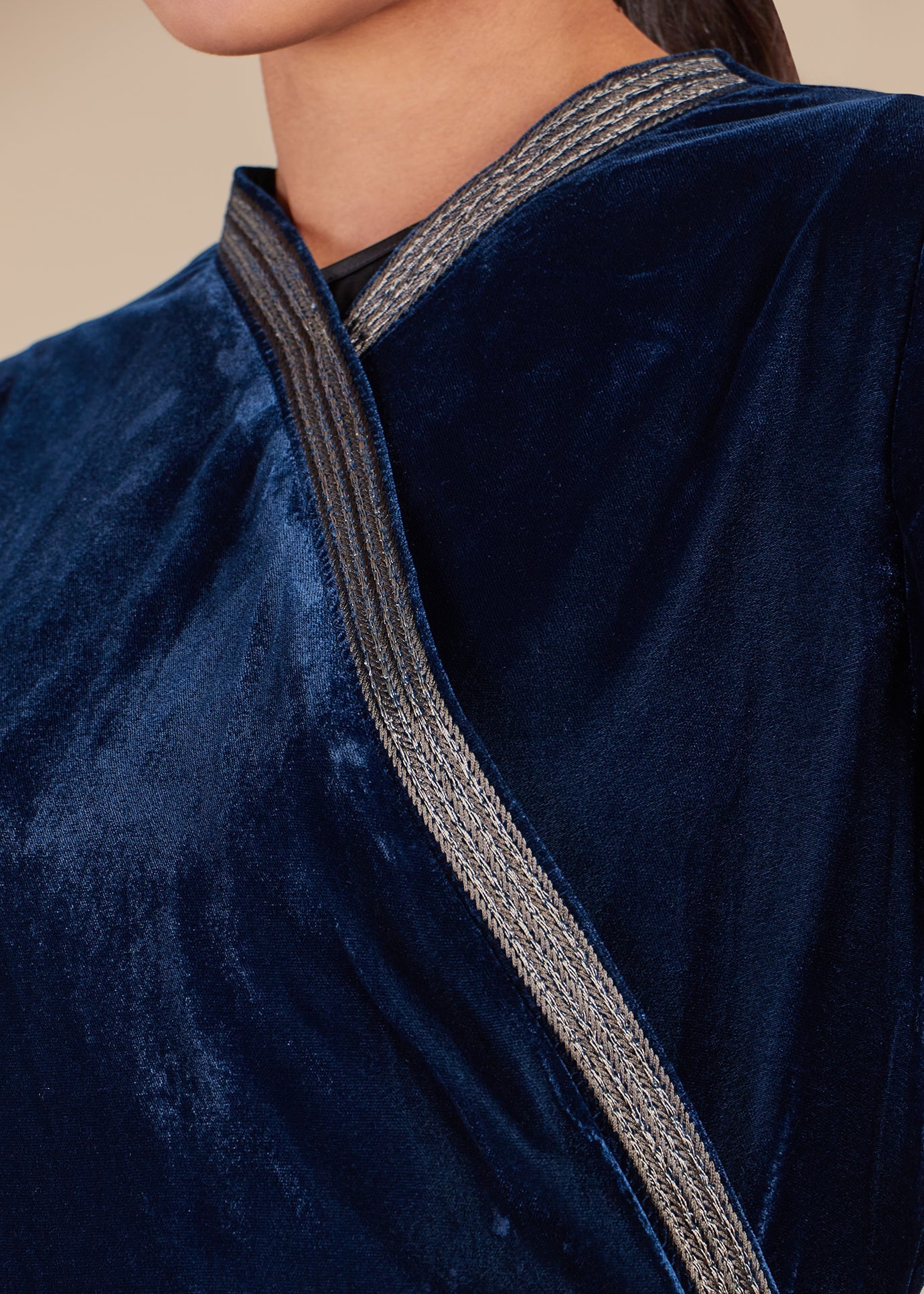 This floor-length abaya is crafted from navy blue velvet fabric, radiating sophistication and elegance. The abaya features a wrap-style silhouette with a delicate embroidered trim running diagonally across the front, adding a refined touch. The flowing, wide sleeves enhance its graceful movement, making it a timeless piece. A subtle inner fastening ensures a secure fit while maintaining a seamless look.