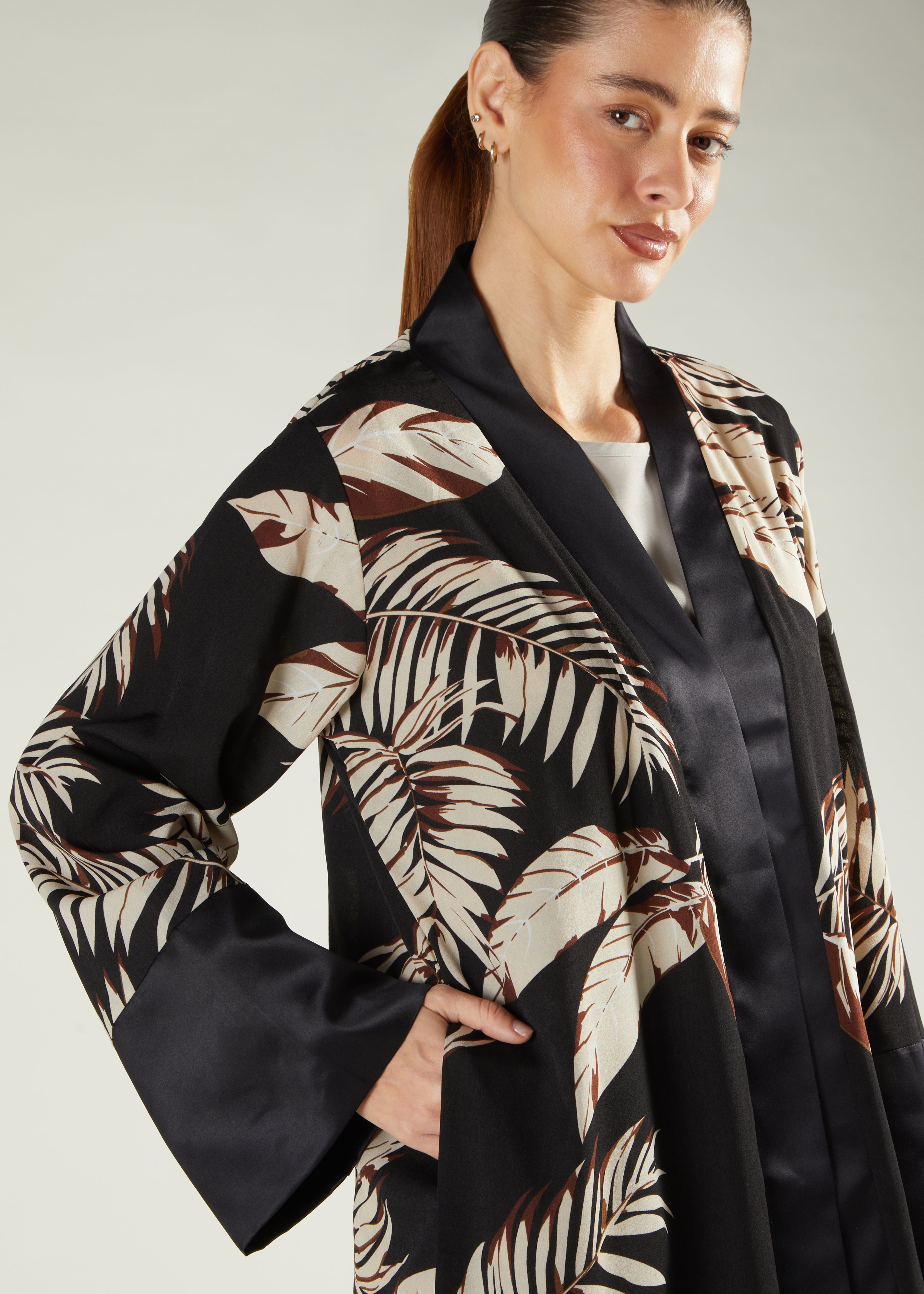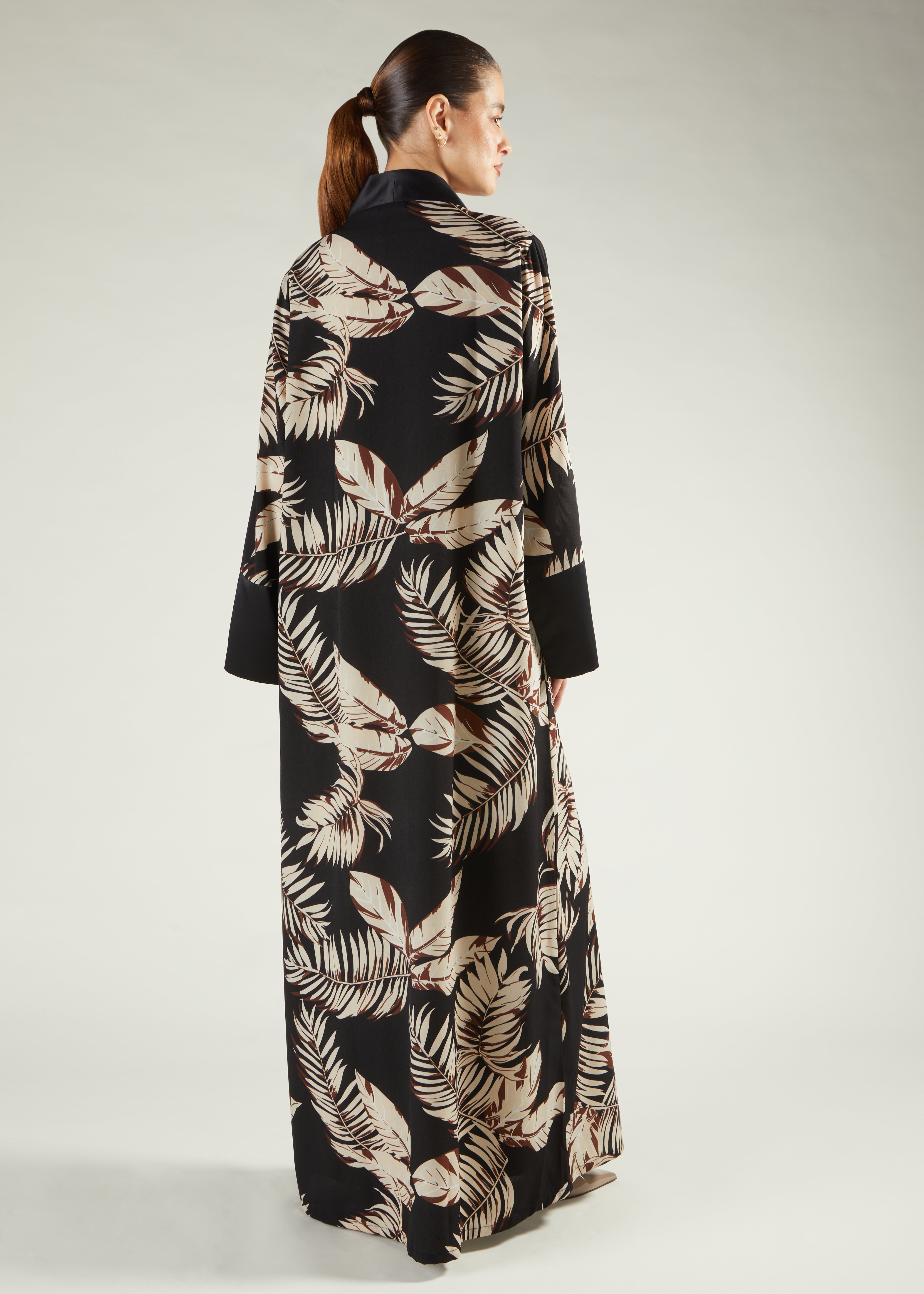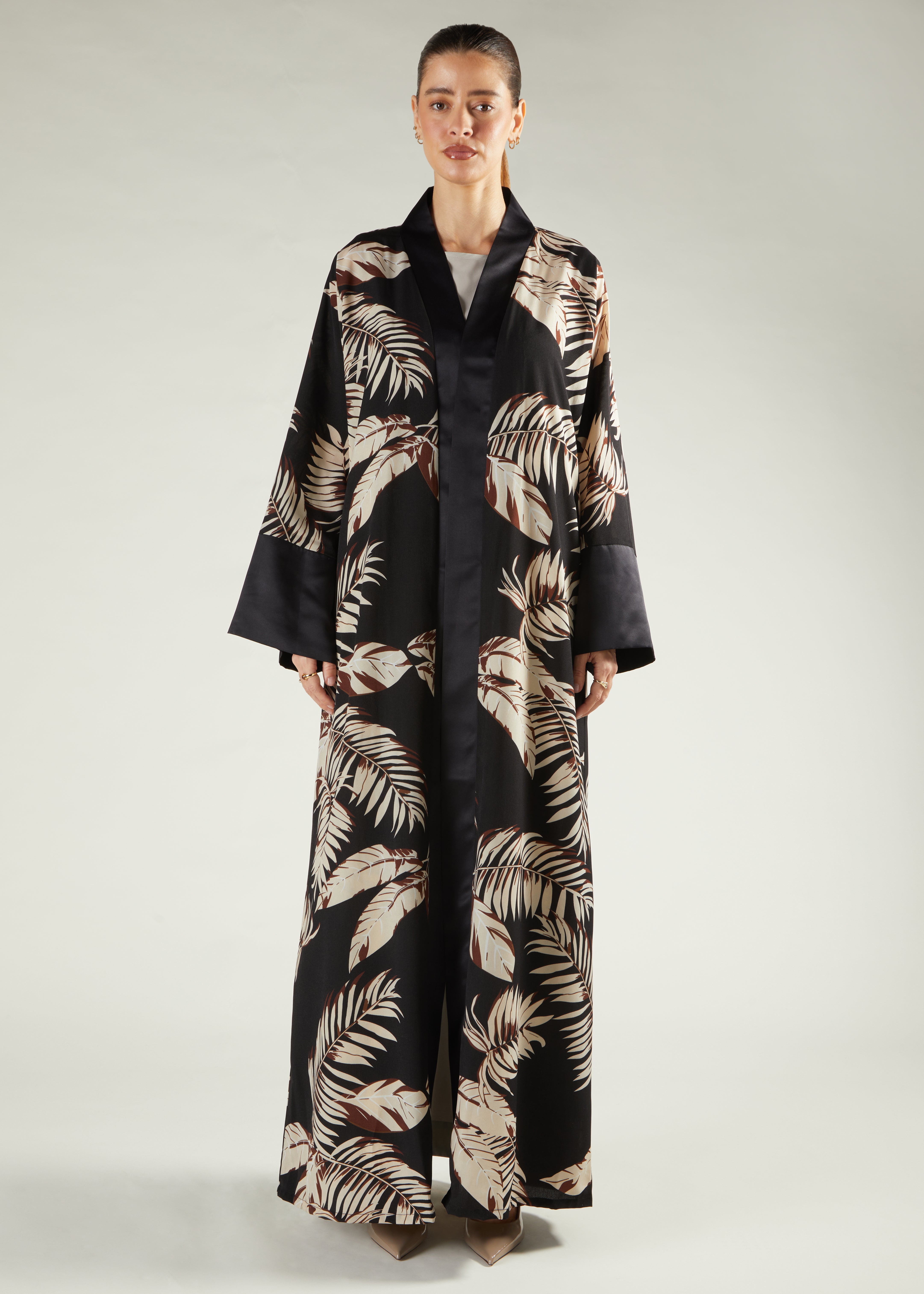 Bold print Open Abaya, featuring a satin placket to add a touch of elegance, has a slightly looser fit silhouette