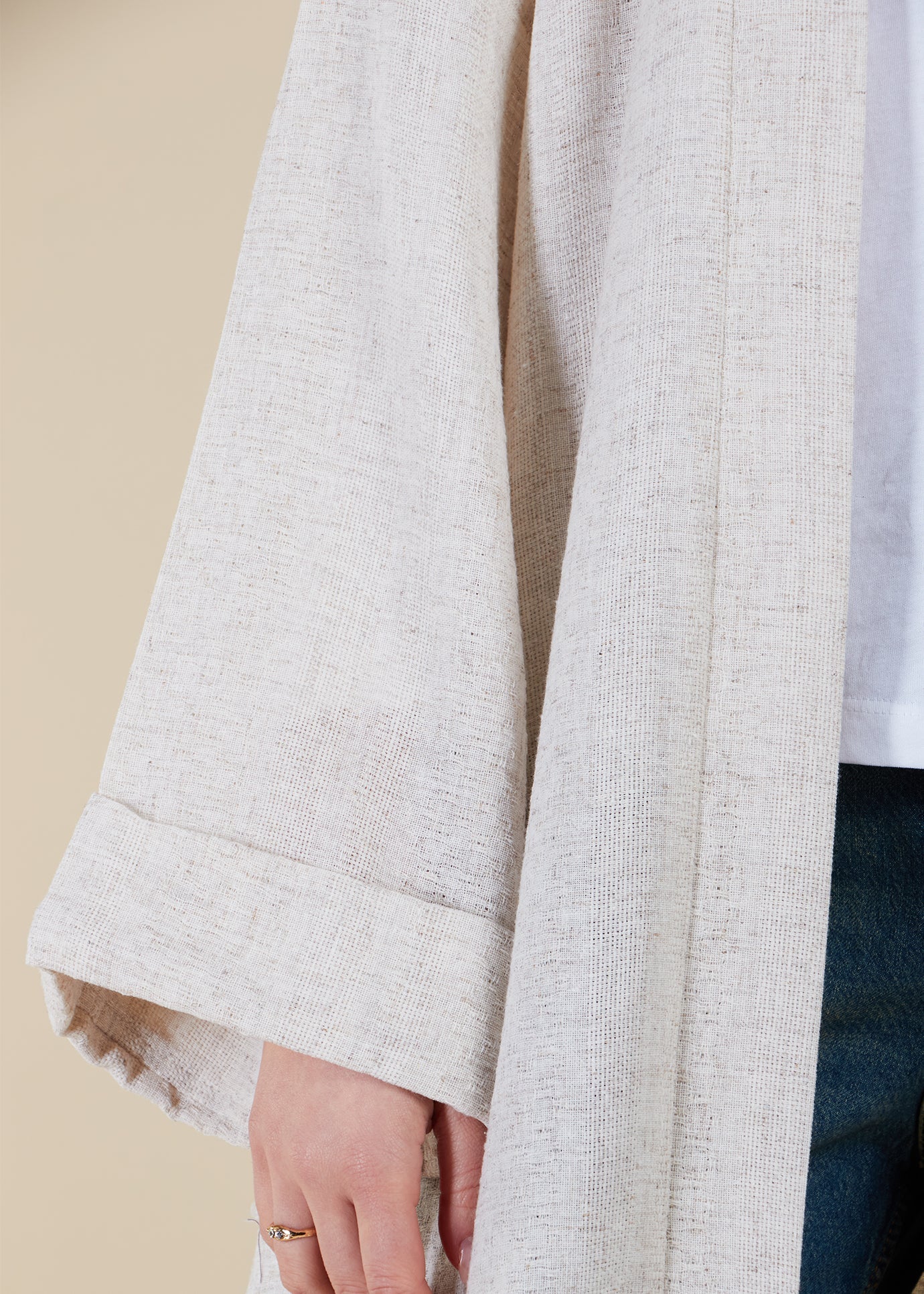 This open jacket features a loose fit and is made from a soft fabric with a linen weave-like look and feel. Its light and airy composition makes it ideal for the spring and summer seasons. Pair with our slip dresses or your jeans for a complete look.