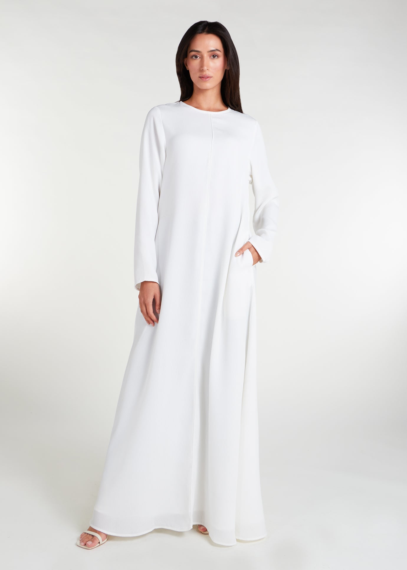Elevate your wardrobe with the timeless elegance of this Long Line Abaya in Classic White, featuring a flattering silhouette that effortlessly complements your style. Experience comfort and sophistication in every step with this must-have addition to your modest collection.