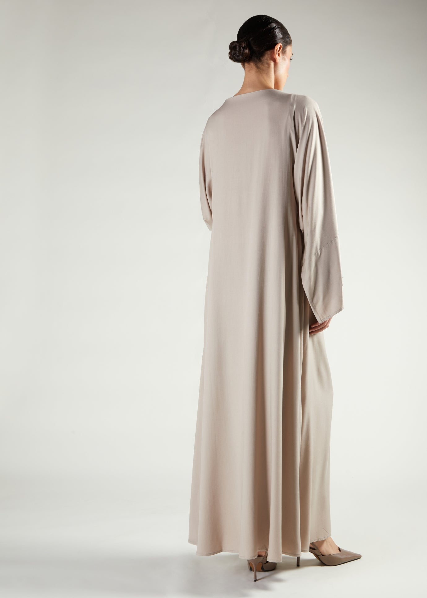 Loose fit kaftan style abaya that has loose fitting sleeves and a semi boat neckline. Perfect for wearing over a turtleneck during the colder months, made from a soft fluid crepe fabric.