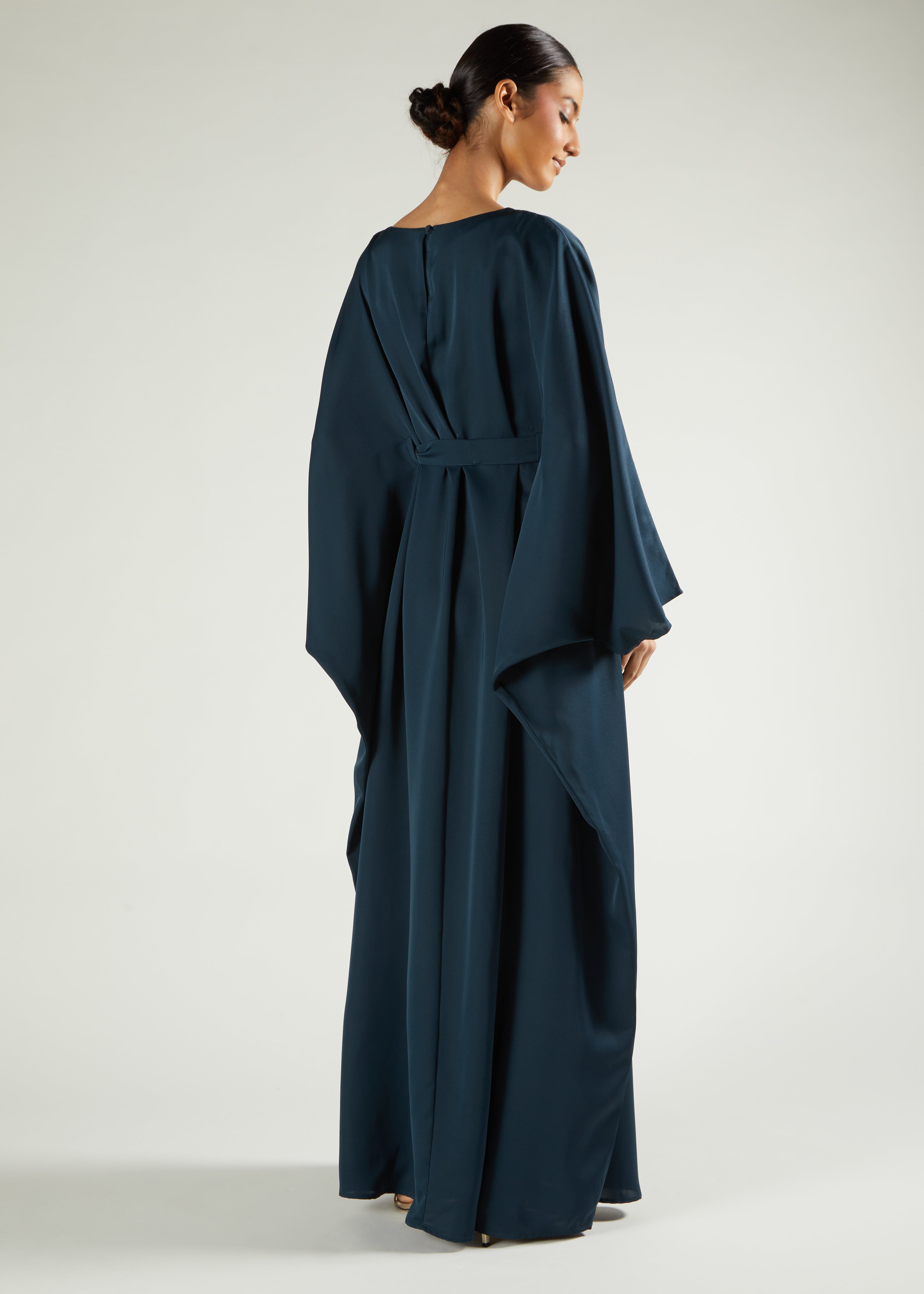This loose-fit abaya, made from a fluid, drapey fabric, offers a modest silhouette that can be tailored with a belt to create shape. Featuring a rich charcoal green hue, it is suitable for prayer or special occasions. The crease-resistant fabric ensures a polished look throughout the day.