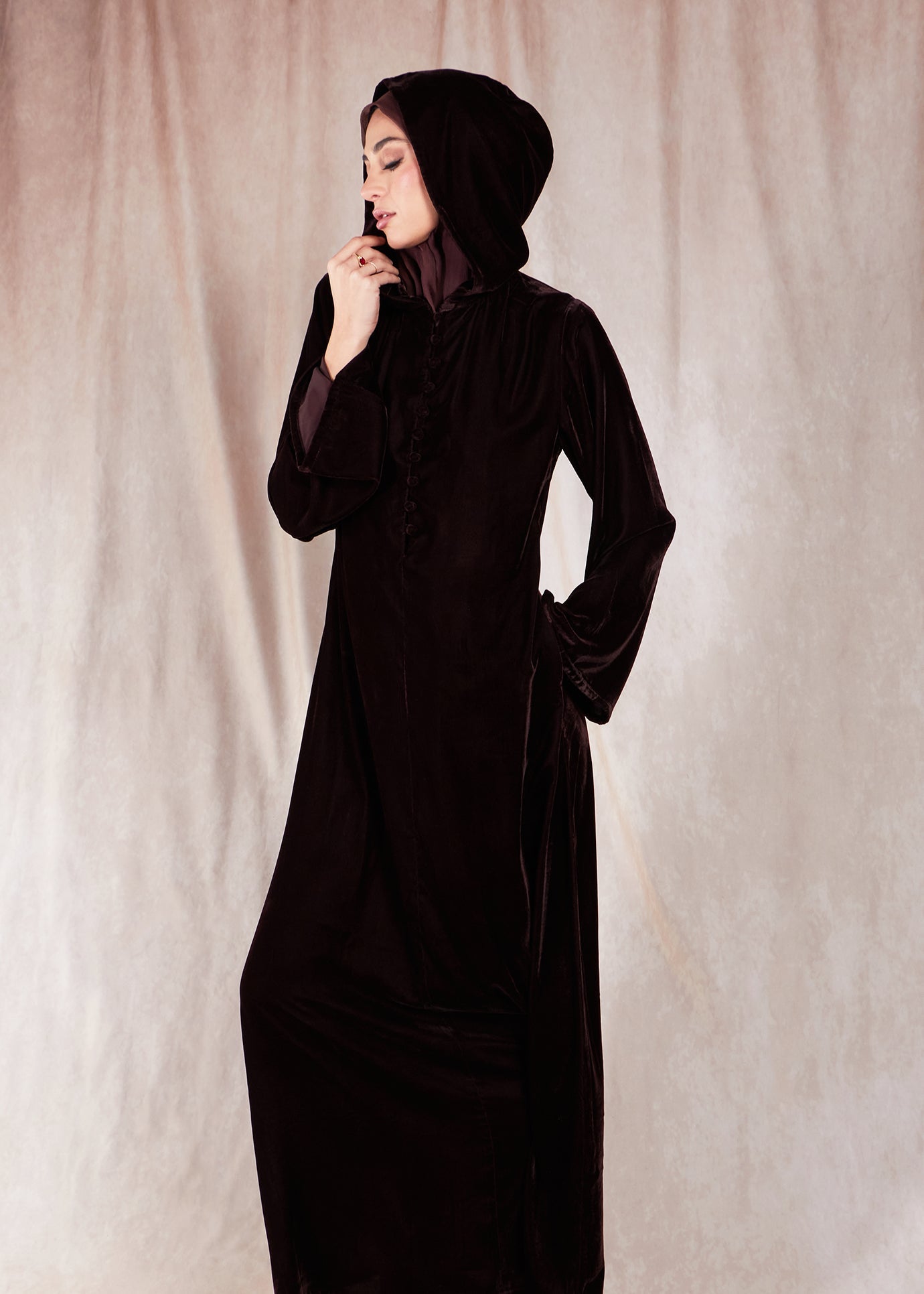 This elegant, full-length abaya is crafted from rich brown velvet, exuding sophistication and subtle luxury. The abaya features a front closure with velvet-covered buttons that run from the neckline giving the design a sleek and polished aesthetic. The addition of a functional hood adds a modern yet modest touch, while discreetly integrated side pockets provide practical convenience.
