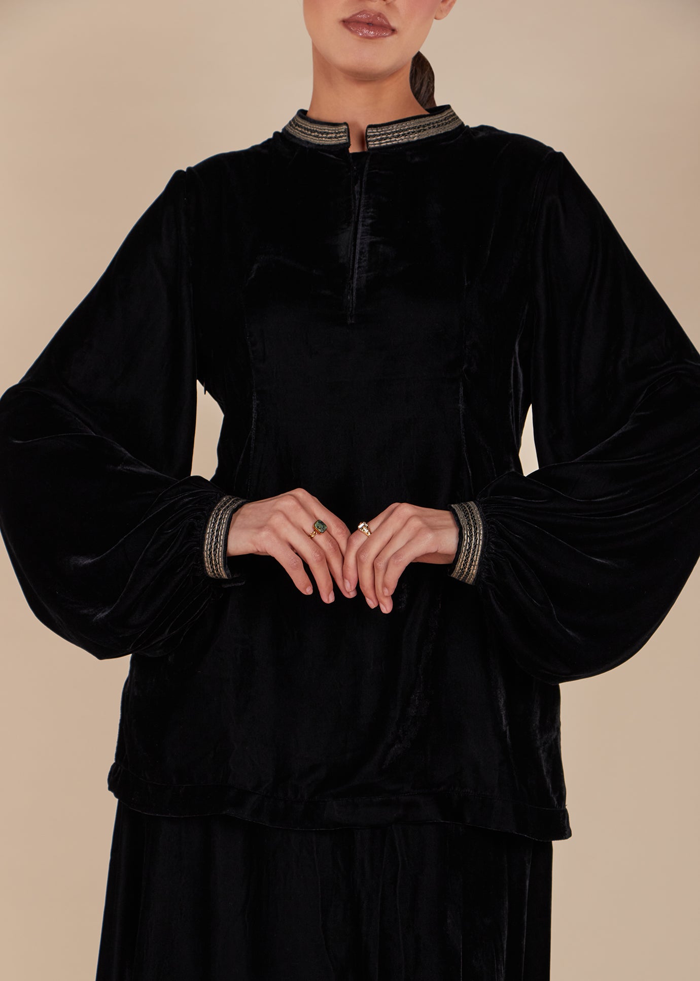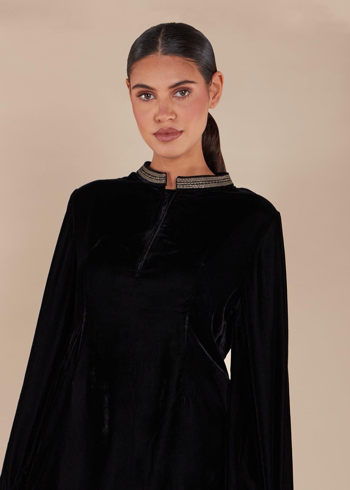 This is a sophisticated black velvet co-ord set featuring a tunic-style top and matching skirt. The ensemble is designed with delicate embroidered detailing at the neckline and sleeve cuffs, adding a subtle shimmer that enhances the richness of the velvet fabric. Its soft, flowing silhouette offers both comfort and timeless elegance, making it perfect for formal events and evening occasions.