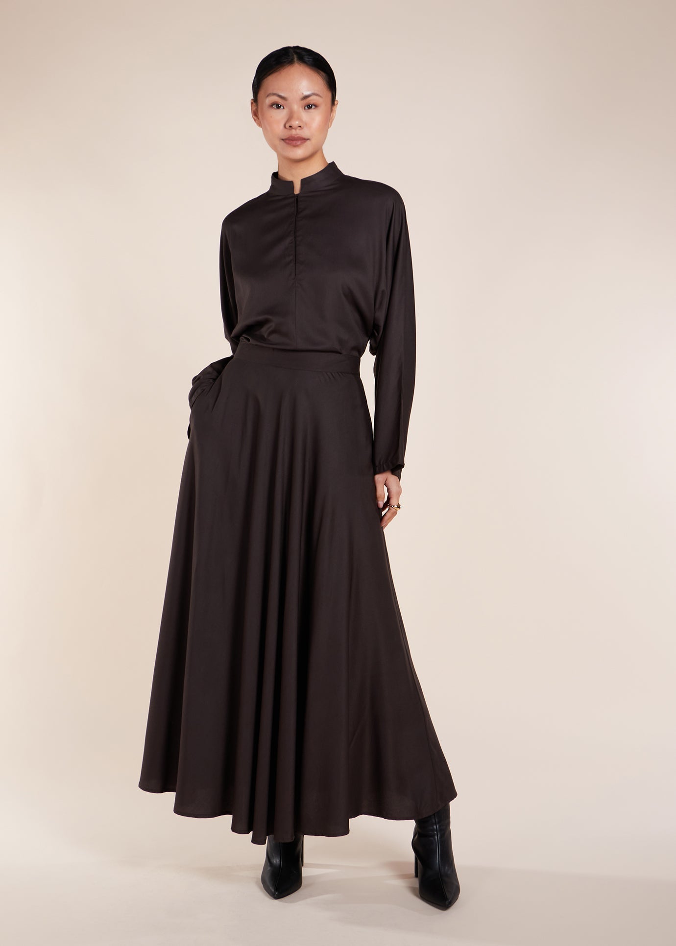 Designed from luxurious twill, this mandarin collar top has a comfortable feel and pairs perfectly with the coordinating skirt. It also complements flared trousers for a stylish addition to any wardrobe. The regular fit ensures a flattering silhouette.