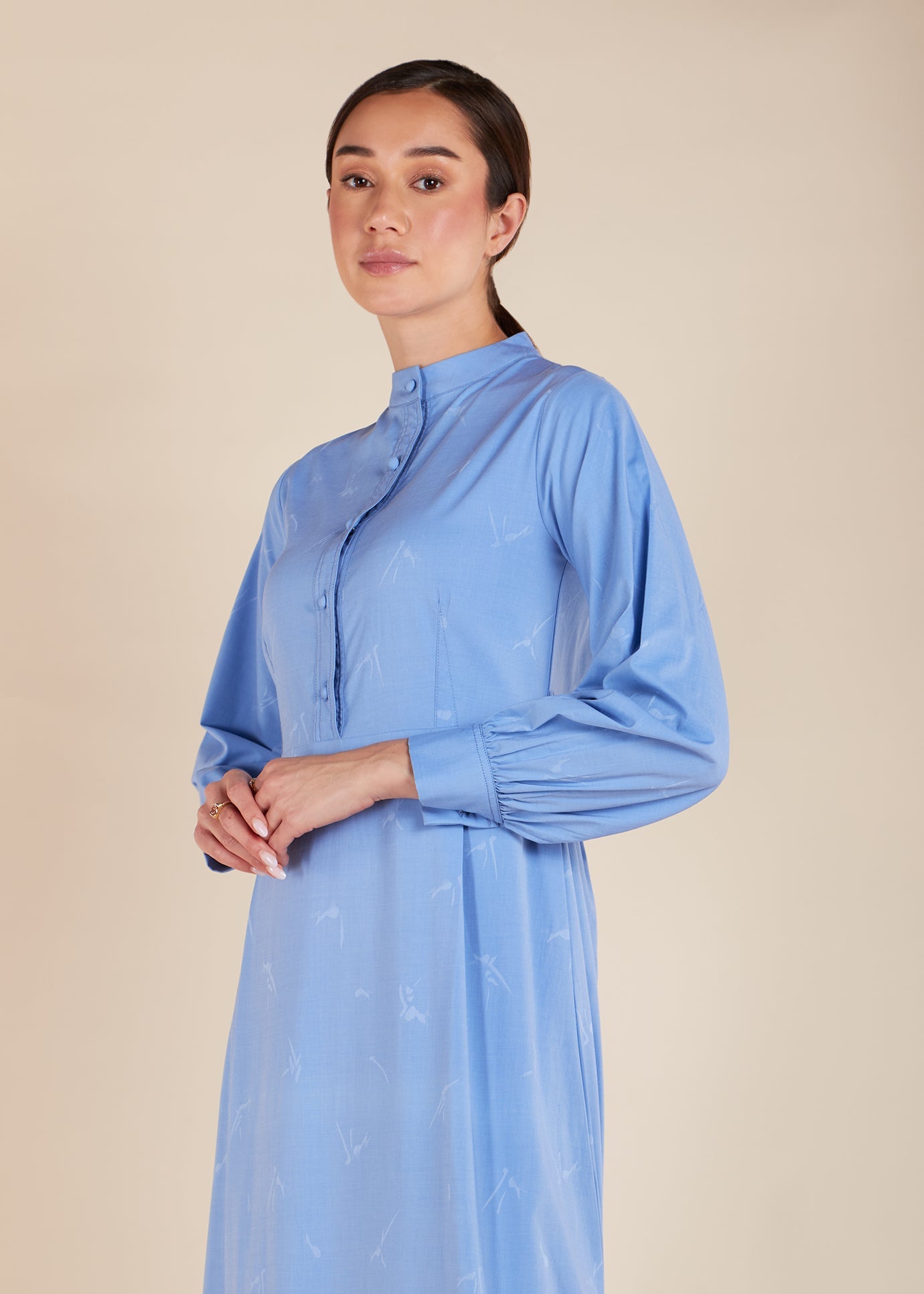 This Pale Sky Blue Maxi features a subtle white cloud-like print, a self-fabric belt with a silver D buckle, a Mandarin neckline, and self-fabric buttons on the bodice. Perfect for spring, this maxi also includes discreet side pockets.