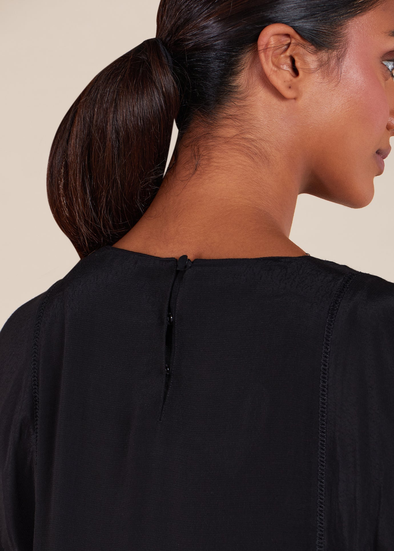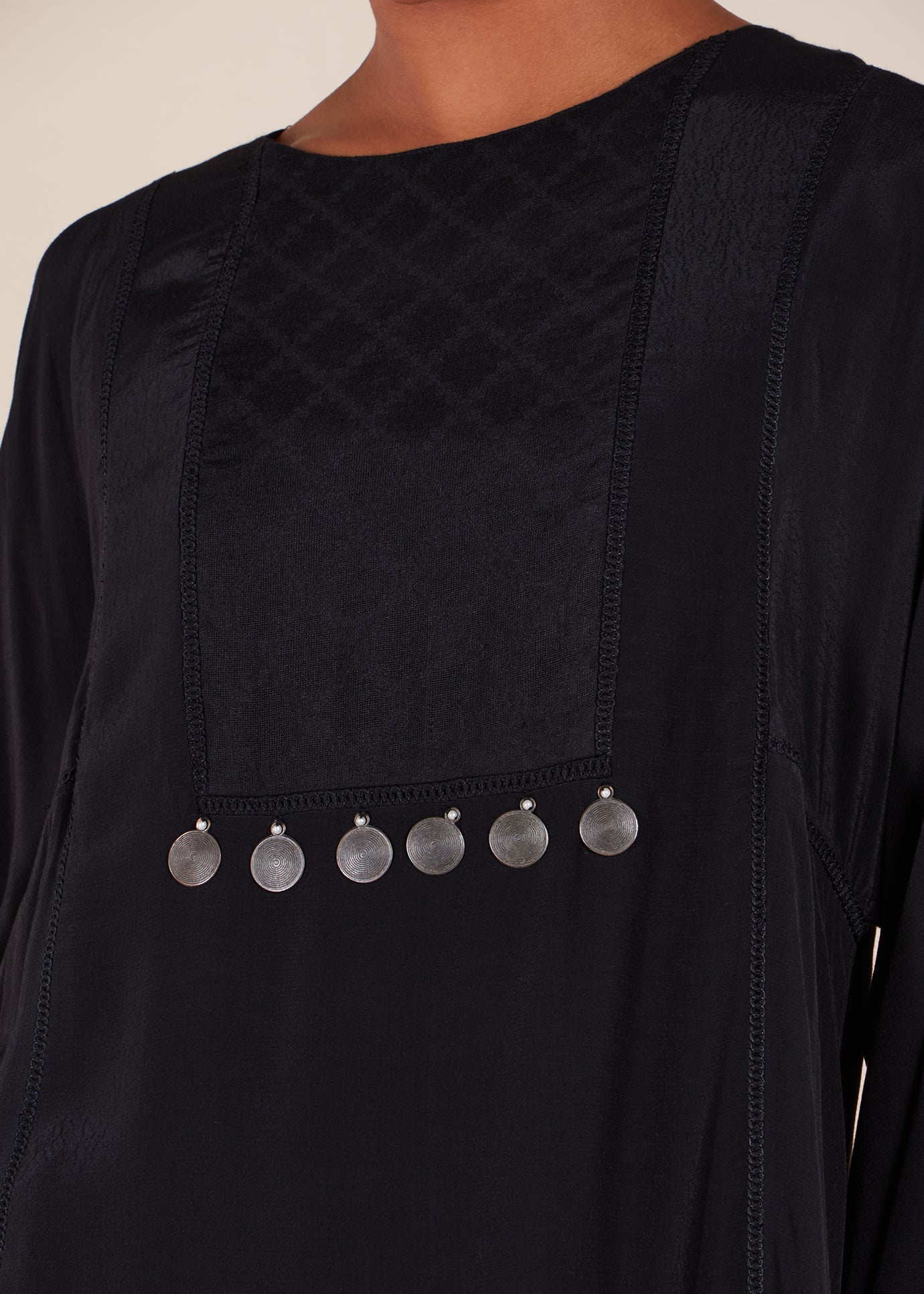 This elegant black Abaya has a woven patterned fabric on the bodice embellished with tribal coins. The wide cuffs also feature the geometric weave, enhanced by delicate ladder lace detailing. Ladder lace accents run along the bodice, sleeves, and full length of the Abaya, emphasising the seams. A subtle button closure at the back ensures a seamless fit. Ideal for evening events and formal gatherings.