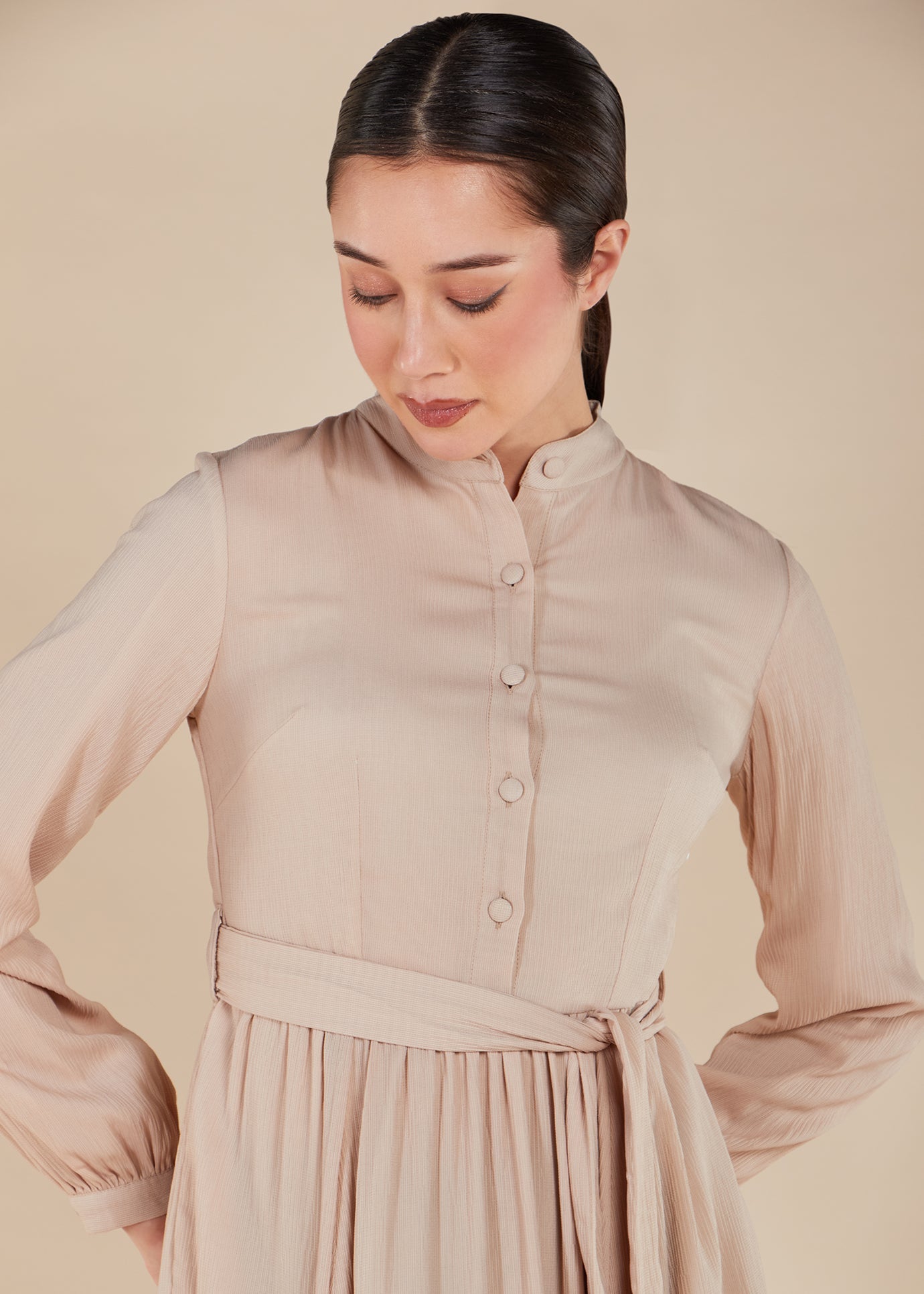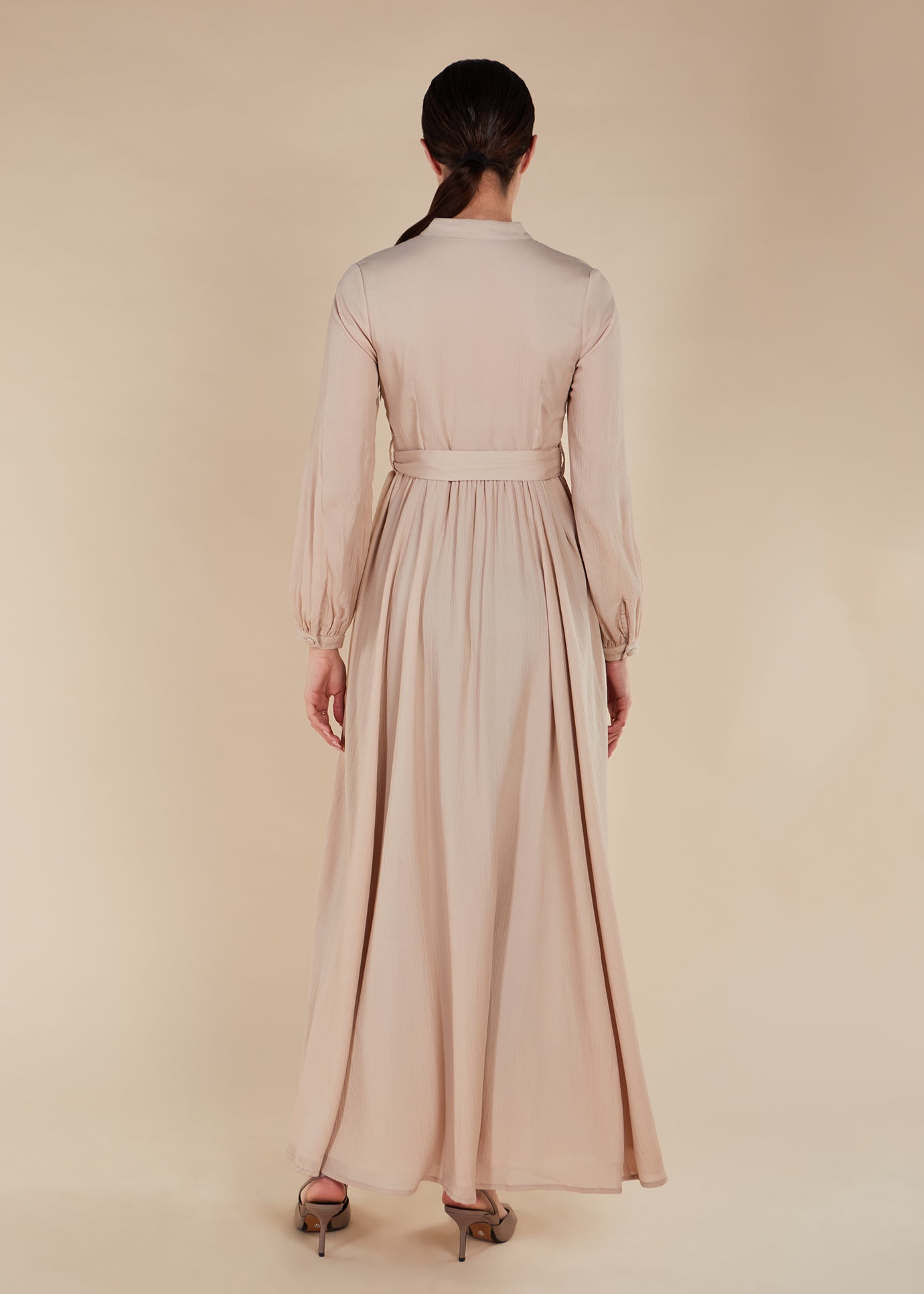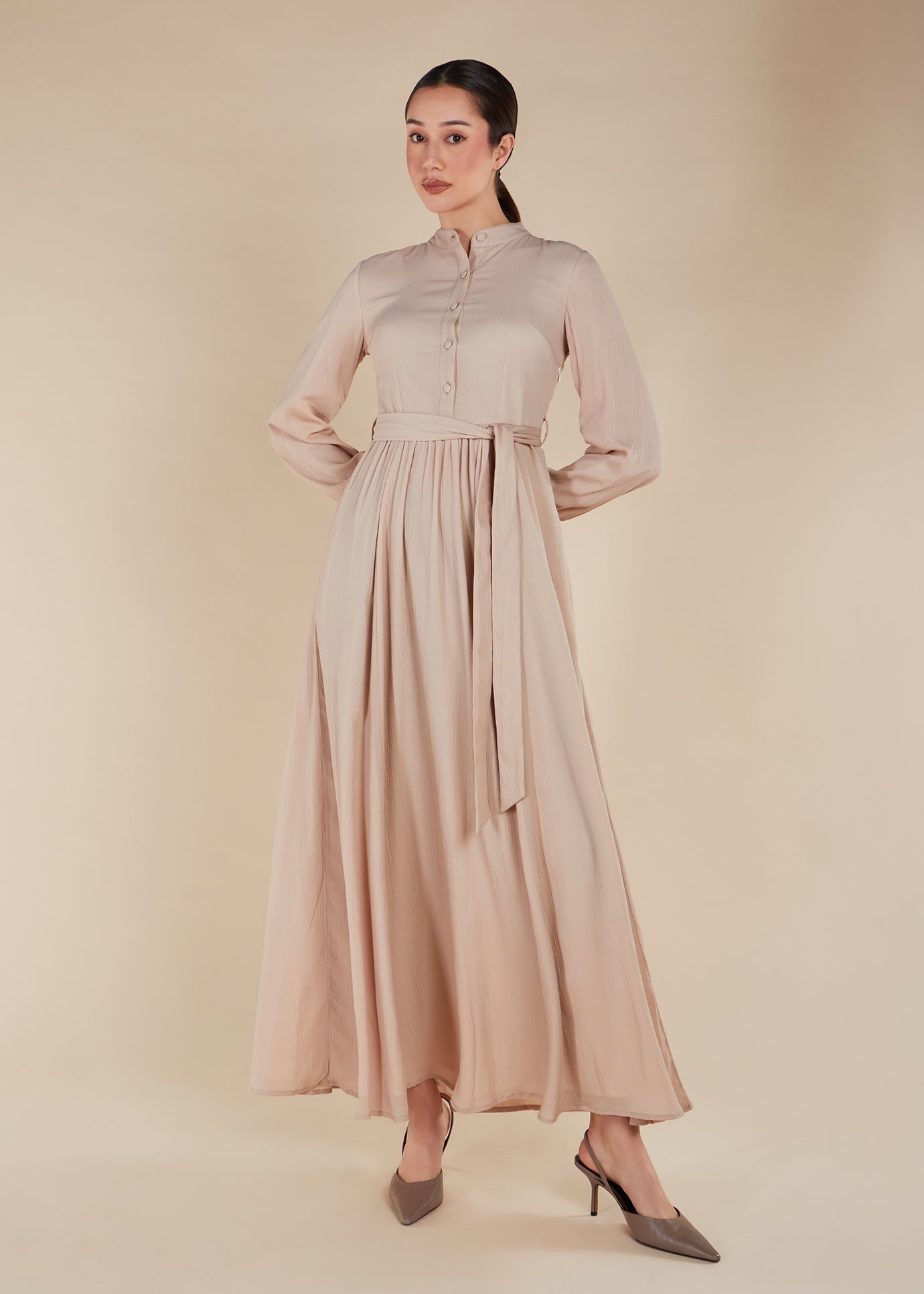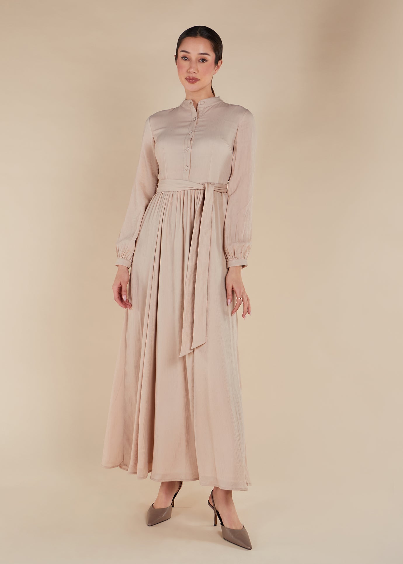 Made from a lightweight mesh-like material, this maxi dress is fully lined in a soft nude hue. The bodice fit stays true to size and gracefully flares from the waist down. Complete the look with the included self-fabric belt or accessorise with your own. Convenient side pockets are also discreetly featured.