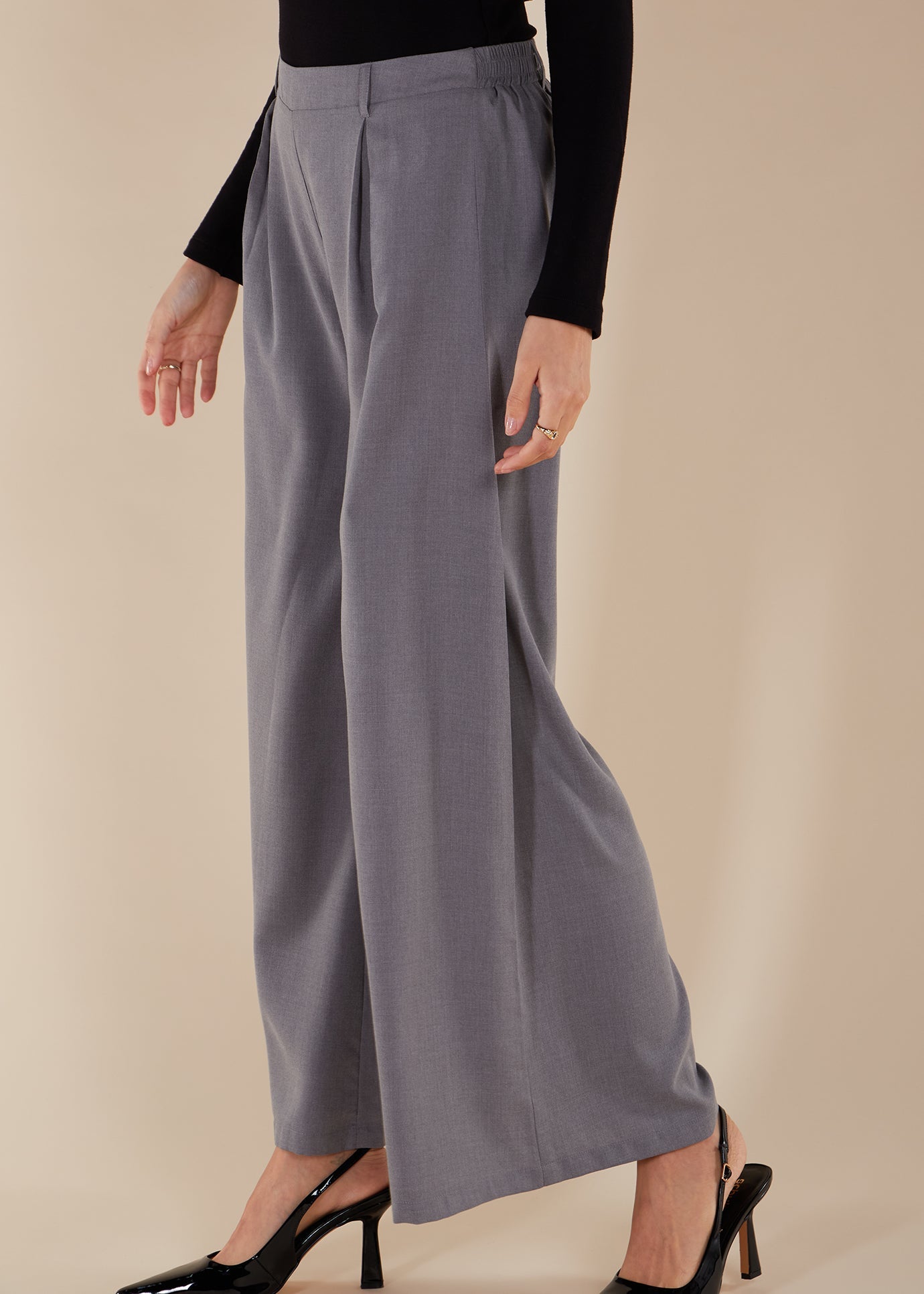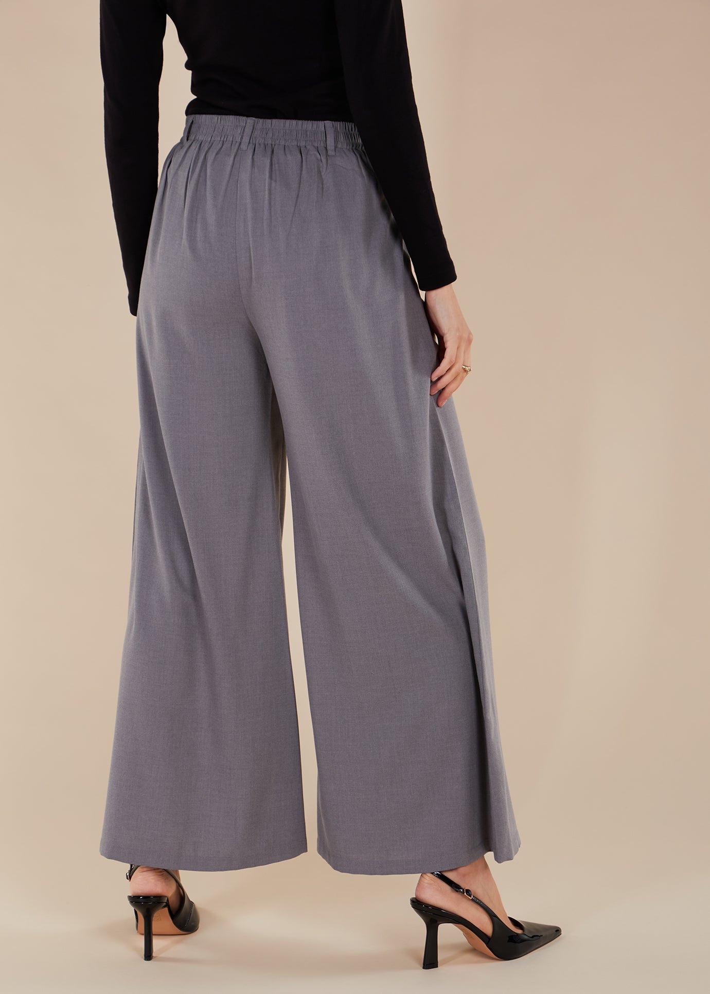 The Mid Flare Trouser in a light grey shade is perfect for pairing with a simple seam midi or casual tops. It features a loose and modest fit, with an elasticated waistband for ultimate comfort.