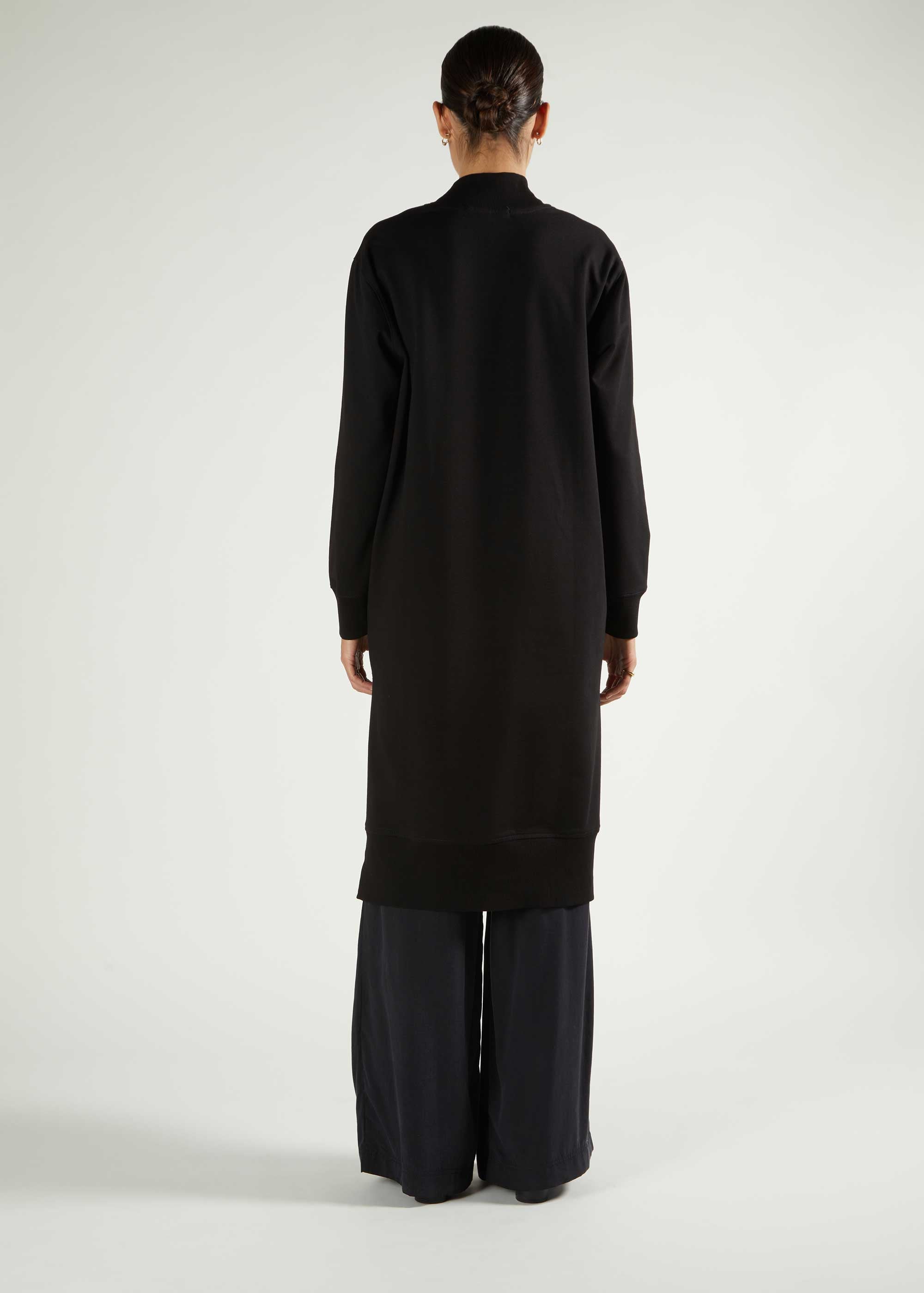 This mid-length jumper dress is made to be layered over trousers, dresses, or skirts. Its moderate weight makes it ideal for adding warmth to your daily wardrobe. Featuring a higher neckline and ribbed cuffs, it effectively shields you from the cold while maintaining a refined, modest silhouette.