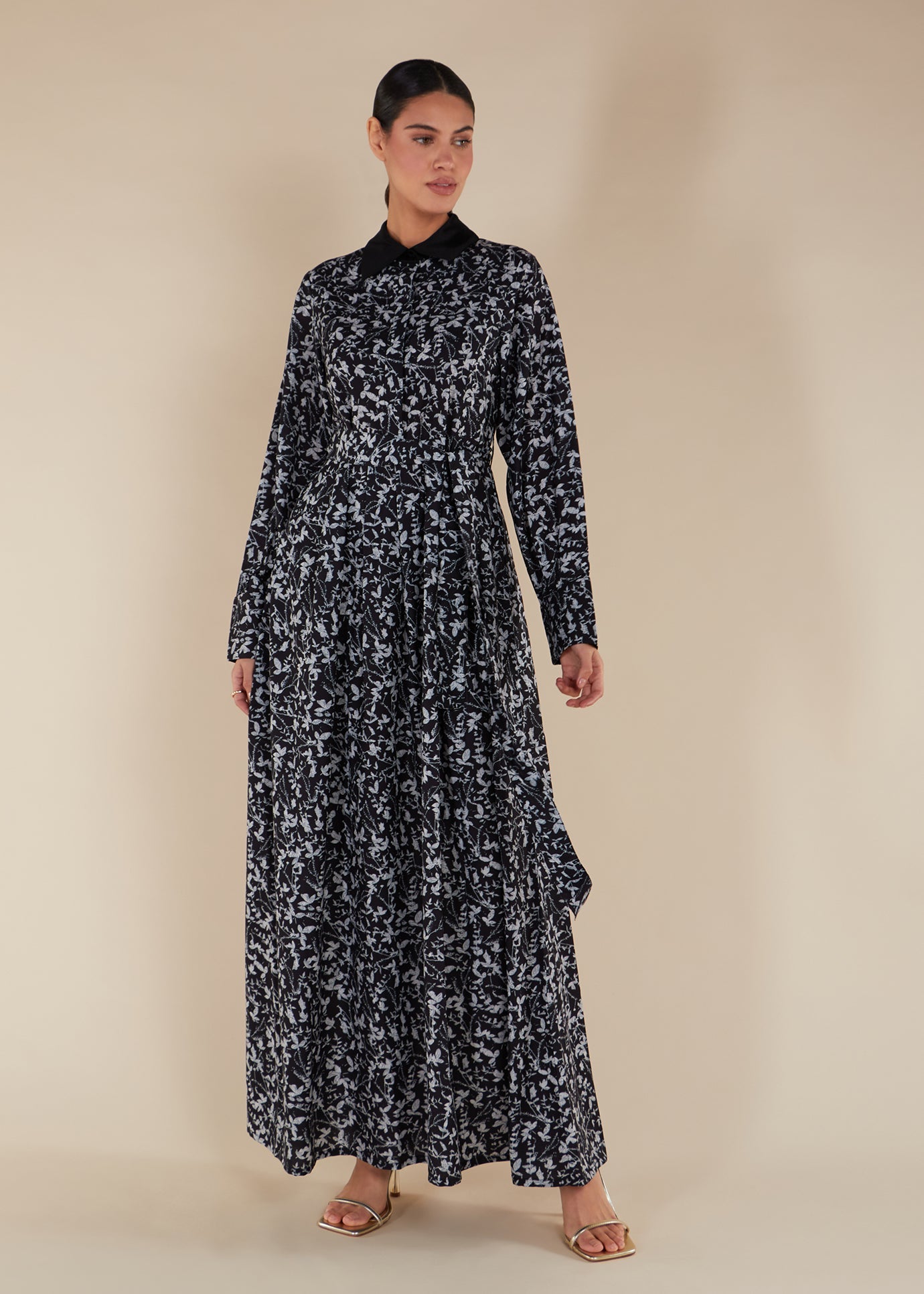 Elevate your everyday look with this lightweight and airy Floral Monochrome Print Maxi. The front features a discreetly hidden button opening, designed to maintain a sleek silhouette. This dress also features black satin collars for a touch of elegance.