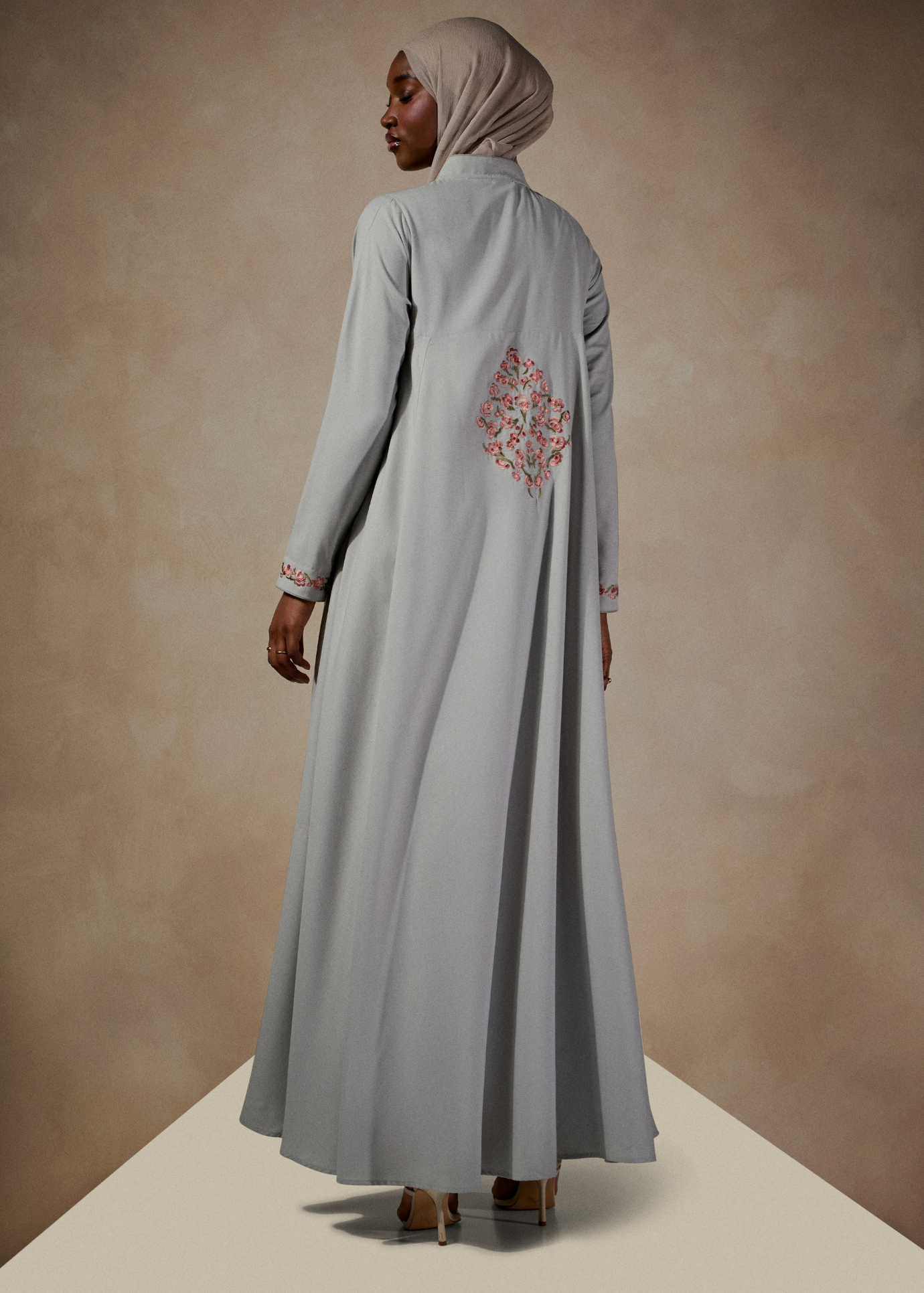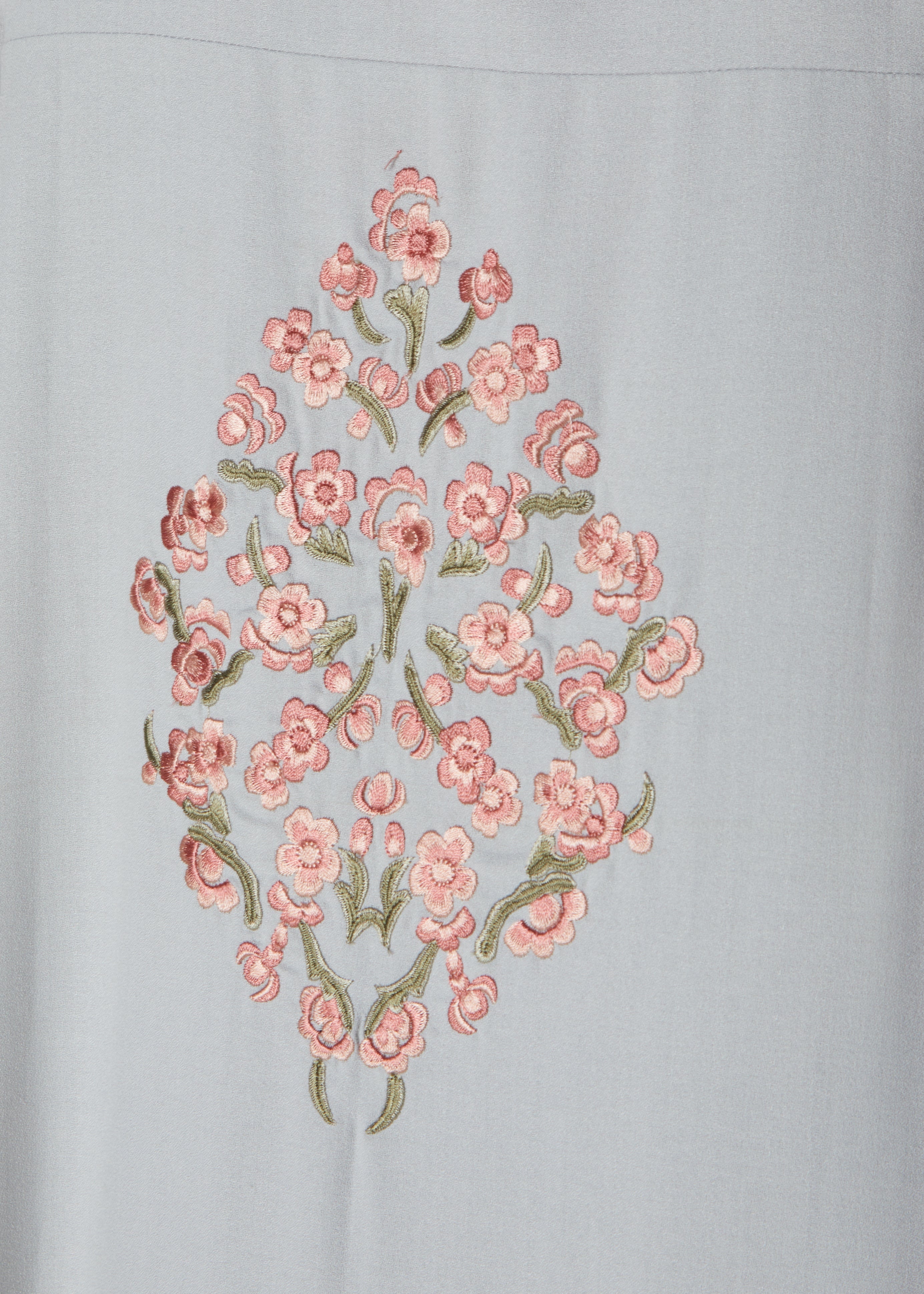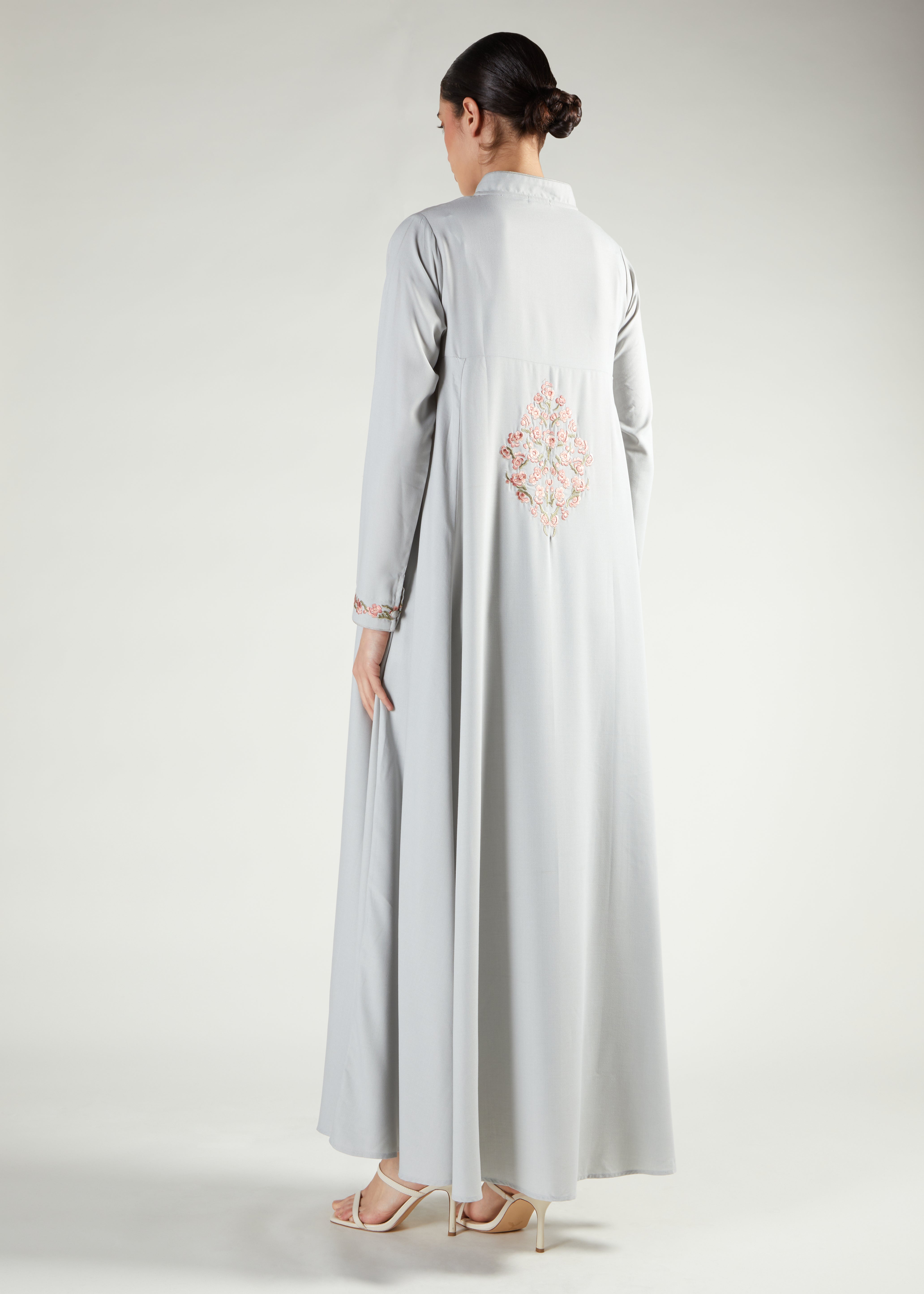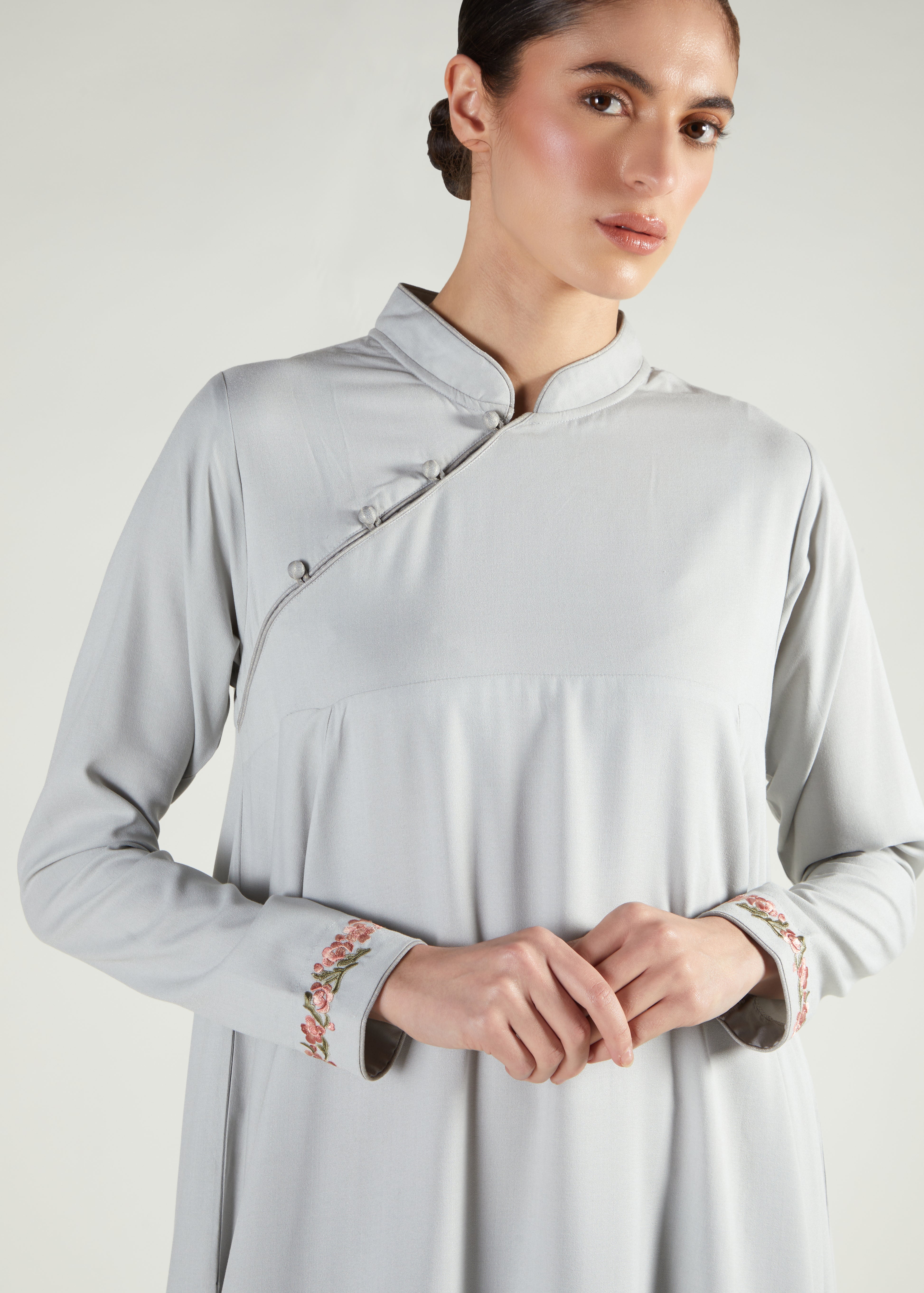 An elegant Abaya in a soft sage tone, the fluid fabric has a flattering drape. Features an embroidered motif on the back and edge of the sleeves with oriental inspired buttons on the neckline.