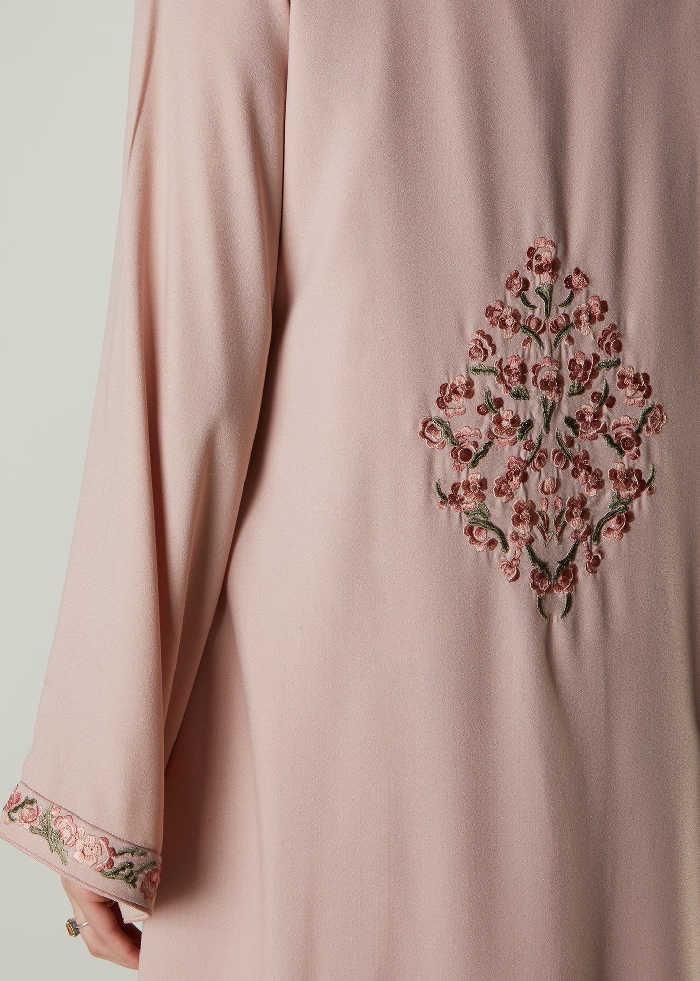 An elegant Kimono in a soft blush tone, fluid fabric that has a flattering fall. The Kimono features an embroidered motif on the back and edge of the sleeves.