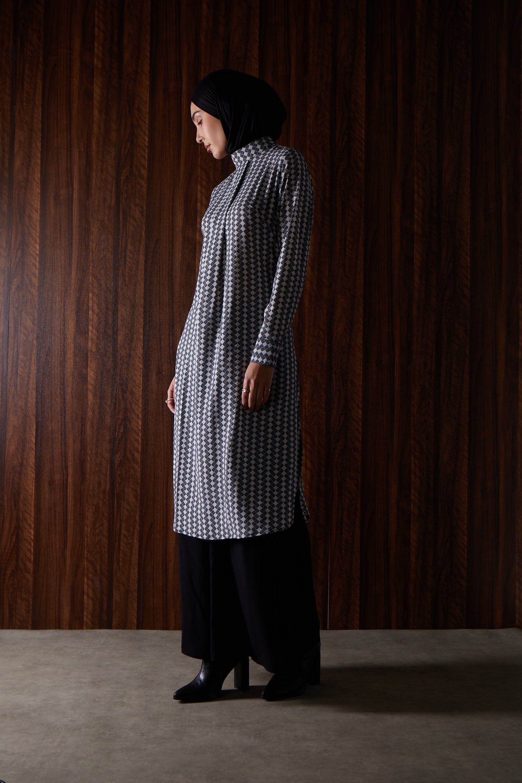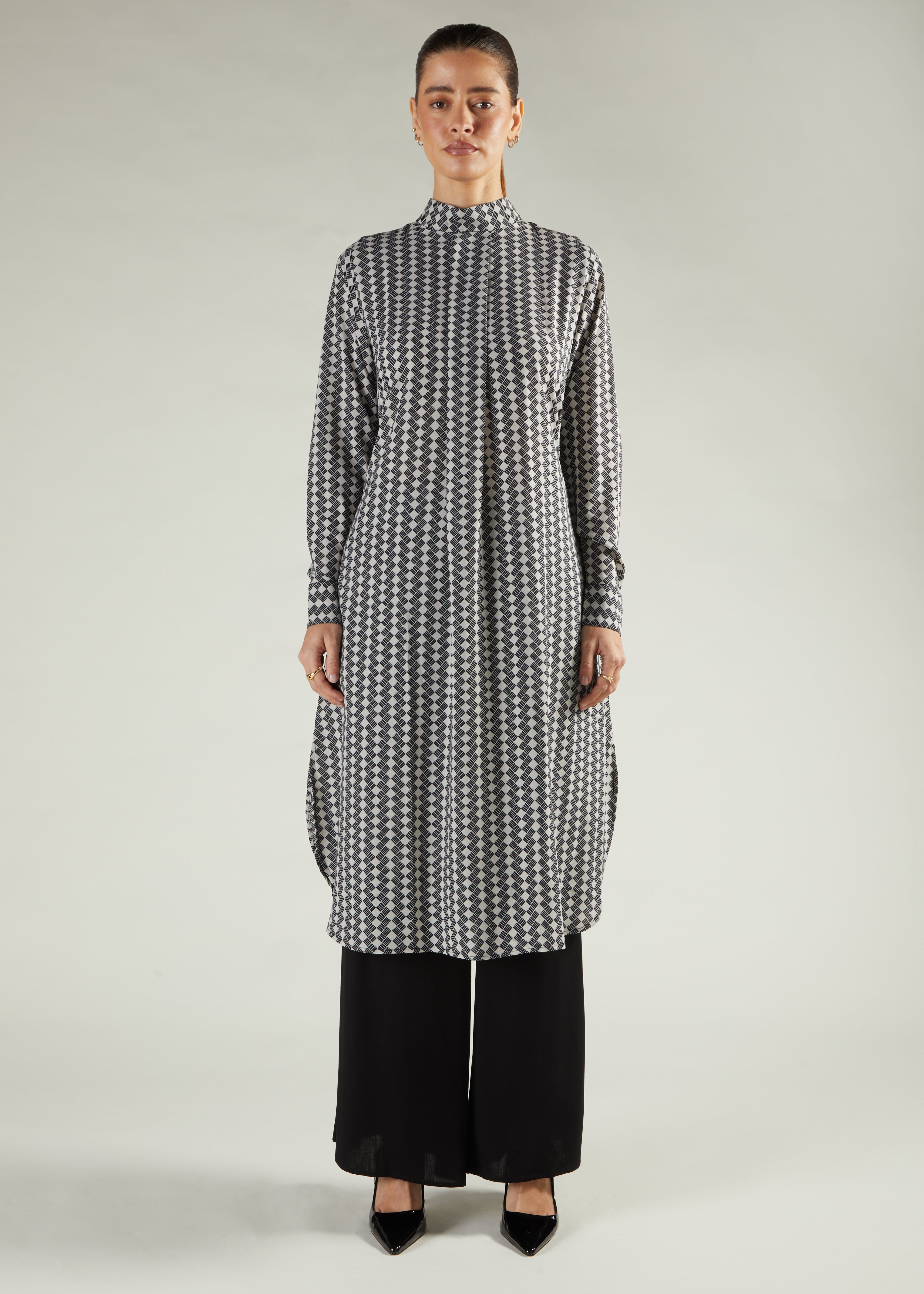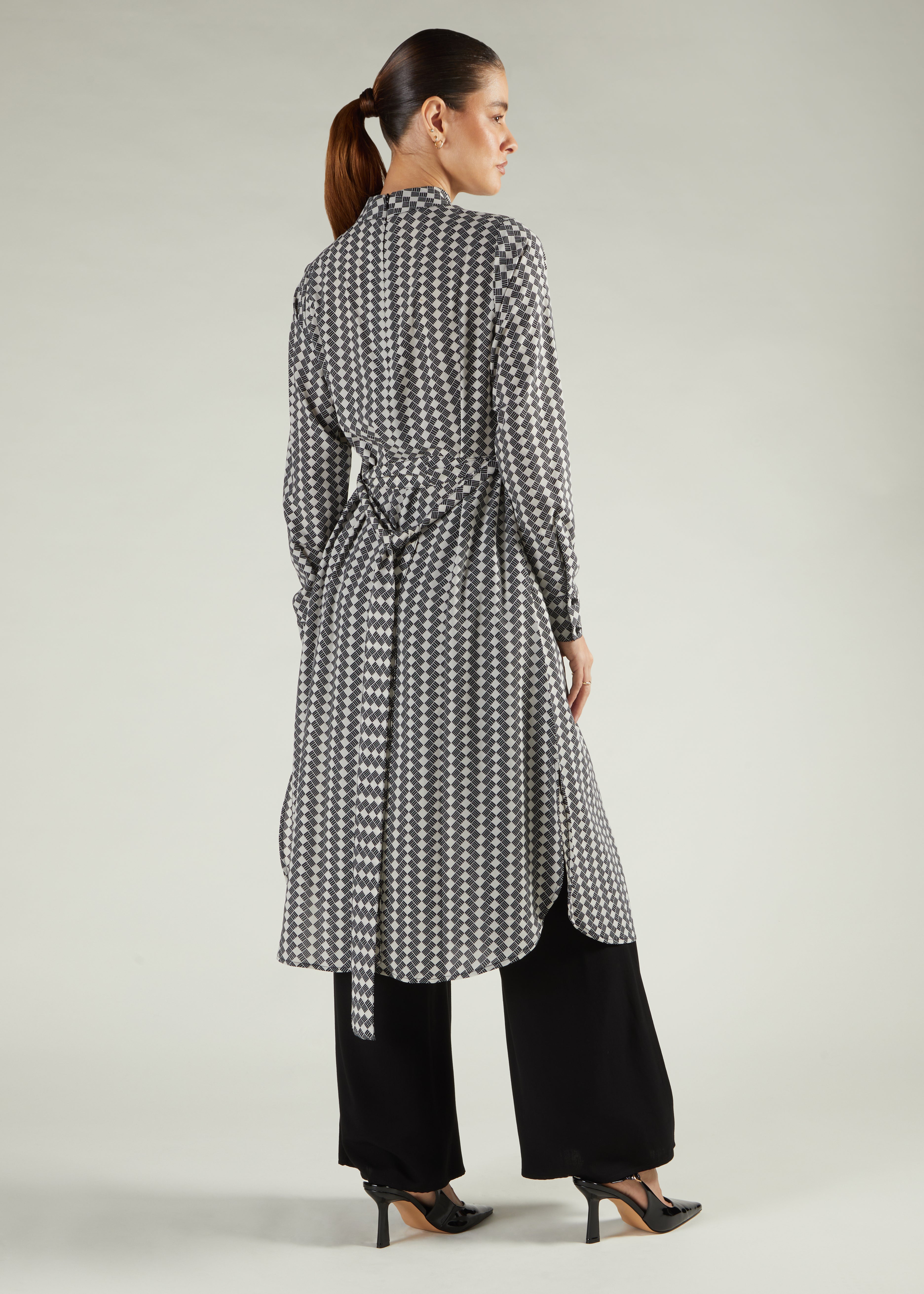 Mono Midi dress with a striking geometric print in monochrome tones. The fluid fabric resists creasing, while a box pleat adds shape. Comes with a detachable belt, hidden side pockets, and a high neckline with cuffs for a polished finish.