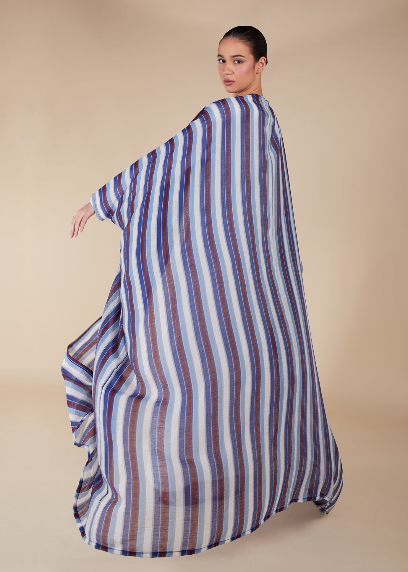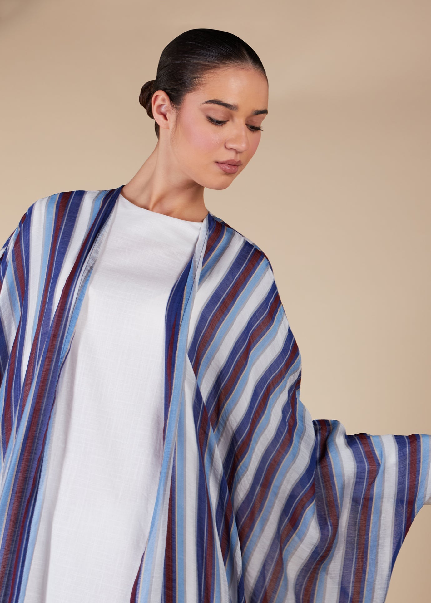 Made with lightweight cotton and tonal blue stripes, this loose-fitting kimono is a must-have for any summer wardrobe. Whether at home or abroad, it's the perfect piece for effortless style. For a complete look, pair it with one of our slip dresses.