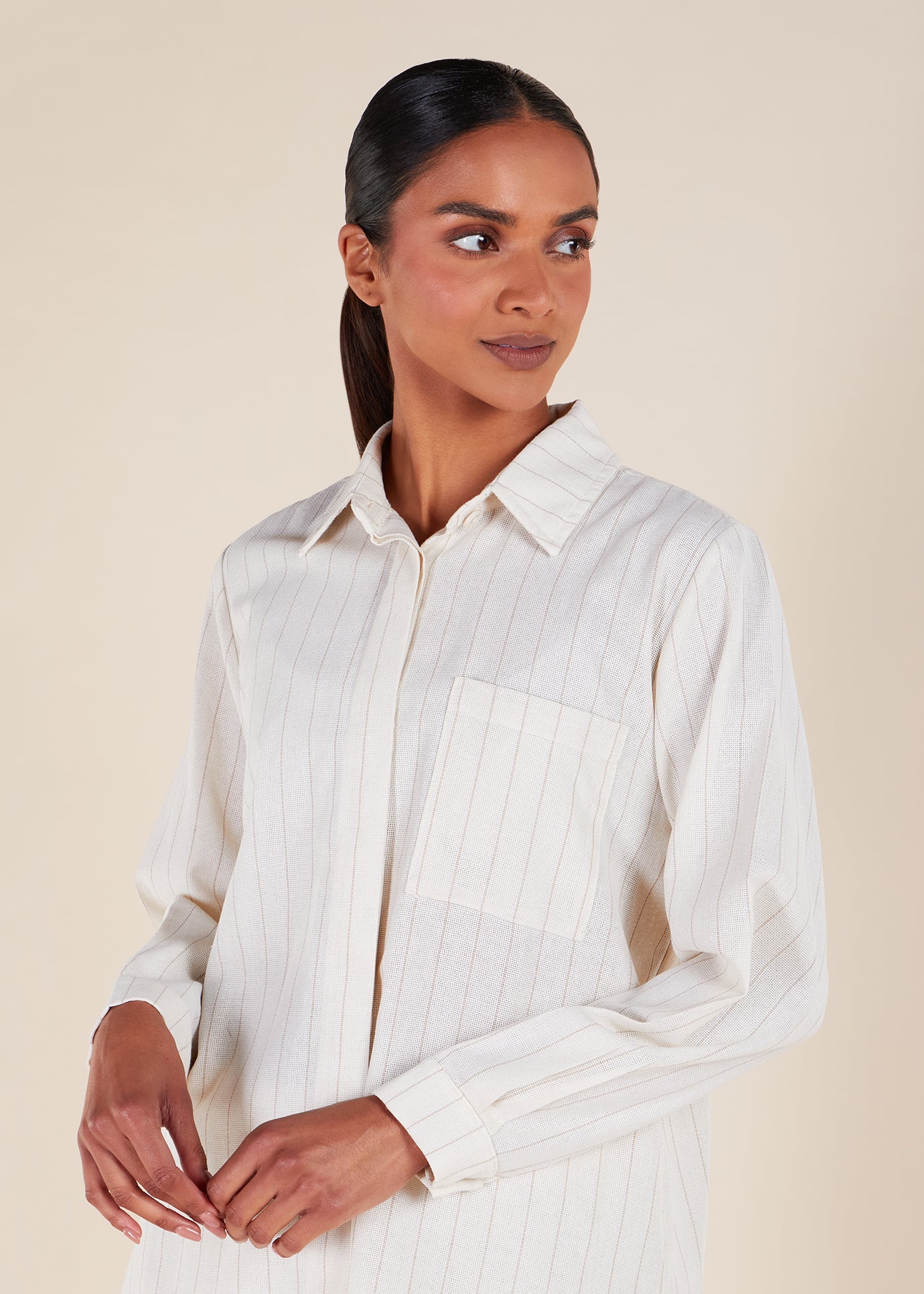 This Co-Ord Set includes a shorter length shirt paired with coordinating trousers, made from a linen-like fabric that offers the aesthetic of linen without the heavy creasing. Its lightweight construction makes it a perfect addition to your summer collection. To avoid any transparency, we recommend wearing a skin-coloured undergarment.