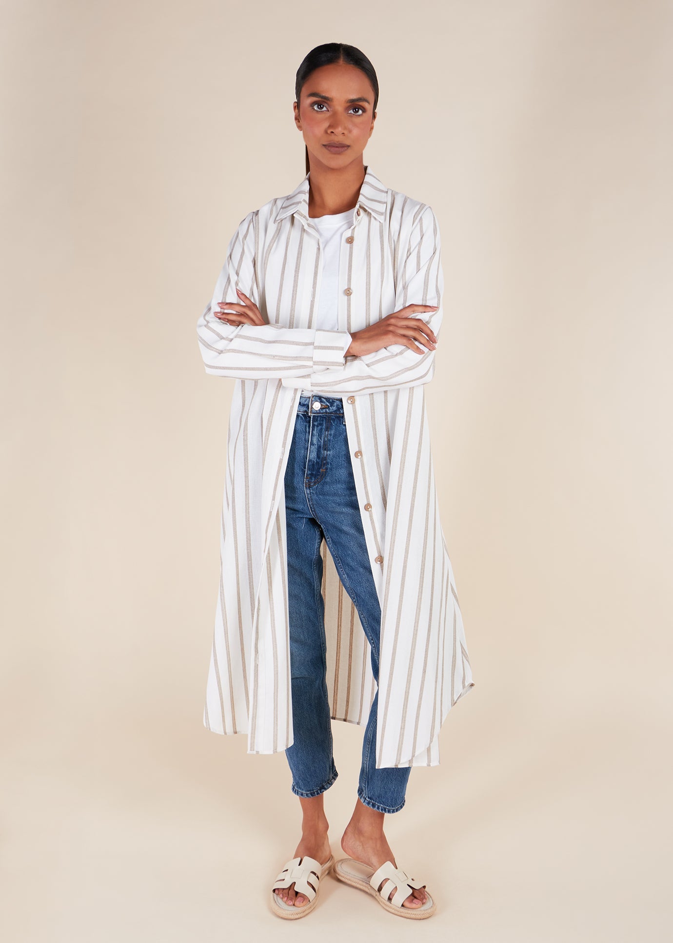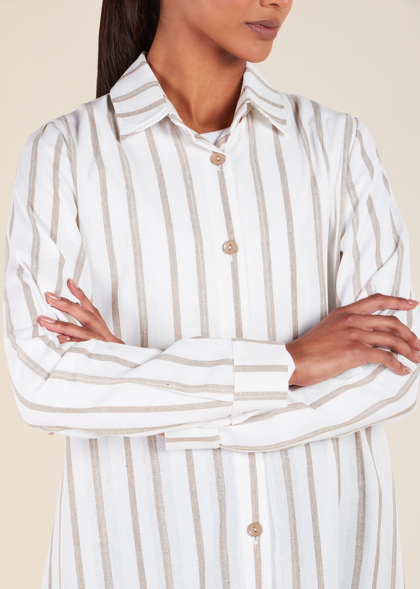 Made from a linen-like fabric, this Shirt Dress has a striped design that visually lengthens the silhouette. With its modest, extended length, it’s ideal for summer wear. Designed for versatility, it can be styled either buttoned up or worn open, providing multiple outfit possibilities.