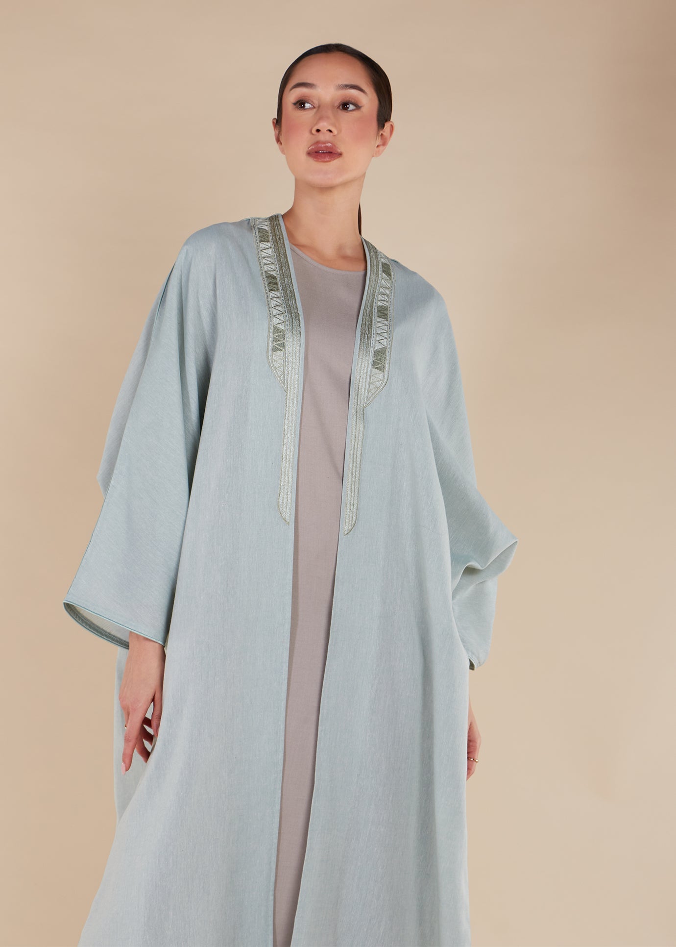 Made with a soft cotton blend fabric in a gentle sage tone, this Naenae Open Abaya has tonal sage embroidery on the placket. The garment's cut is accentuated with satin piping, emphasising its elegant design. Complete your look by pairing with our slips.