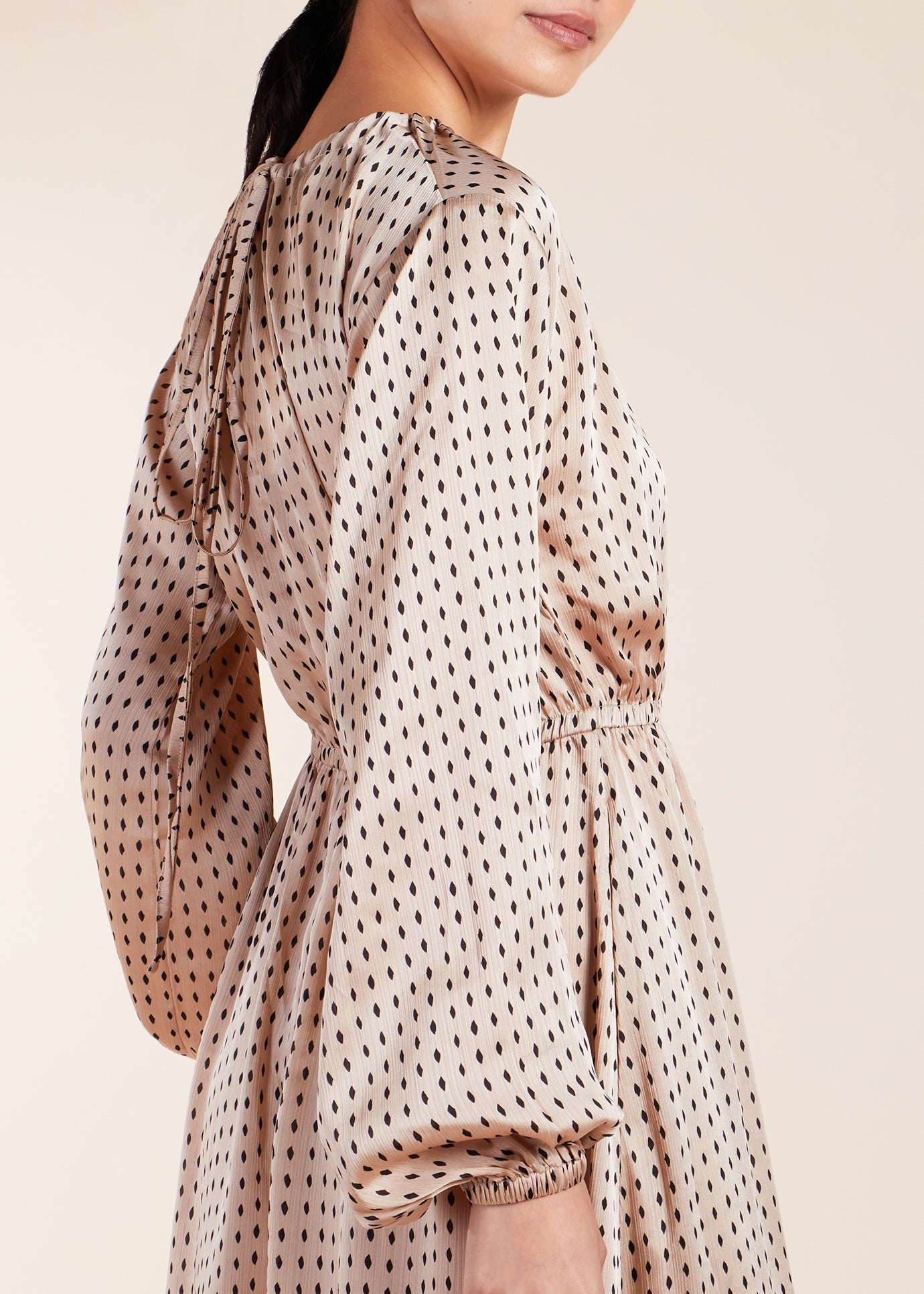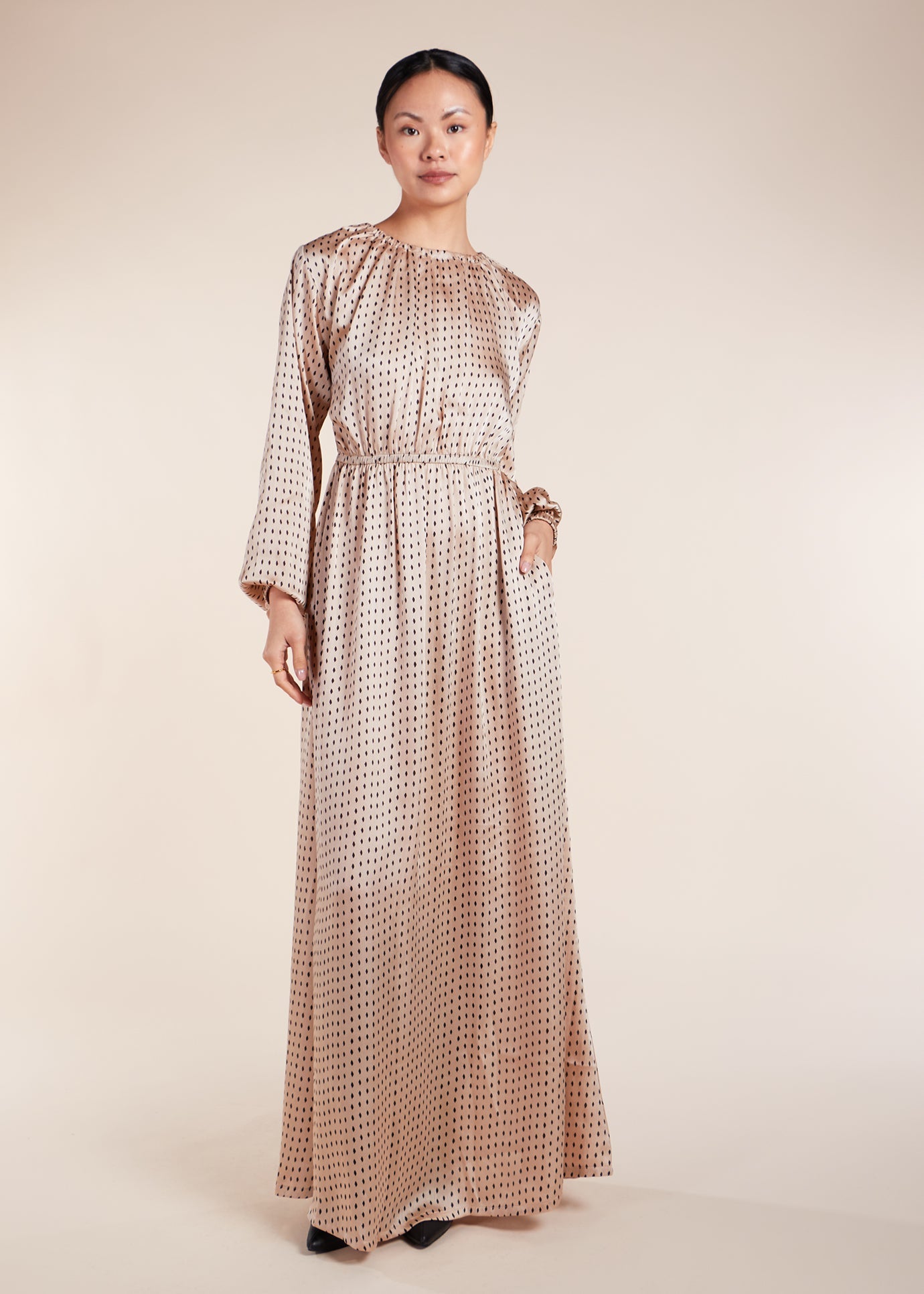 This maxi dress features a delicate print and a versatile design that makes it perfect for any evening event or vacation outfit. The neckline can be adjusted with a drawstring and the sleeves have a balloon style with elasticated cuffs.