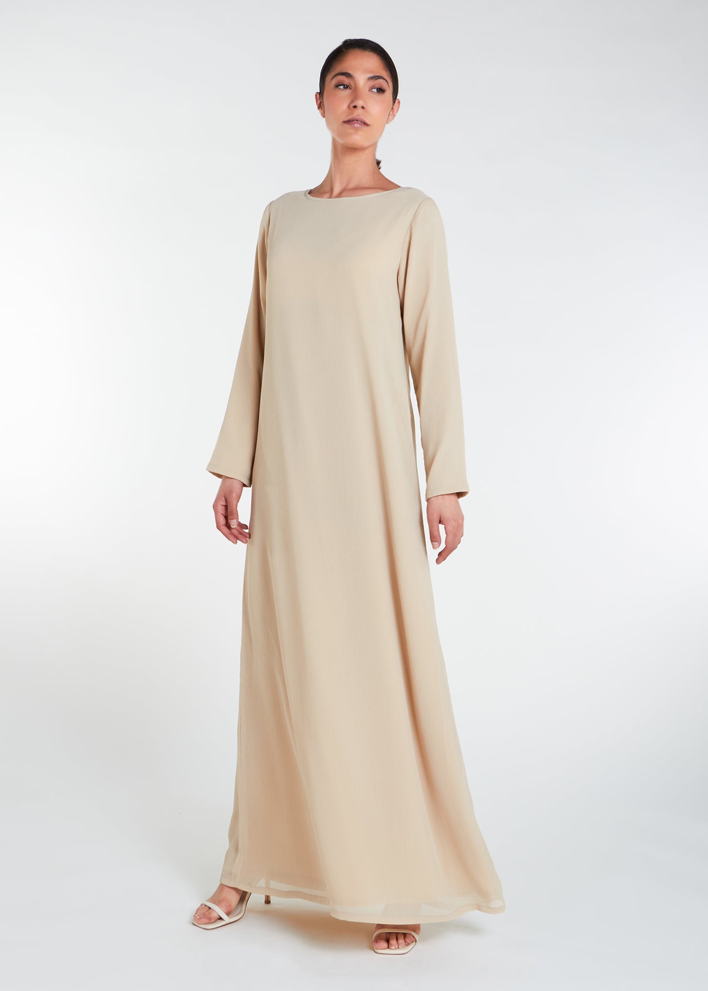 This slip features a fully lined outer shell made from soft crinkle chiffon, creating a light and airy feel. It also includes pockets and pairs perfectly with the Jasmine Open Abaya.