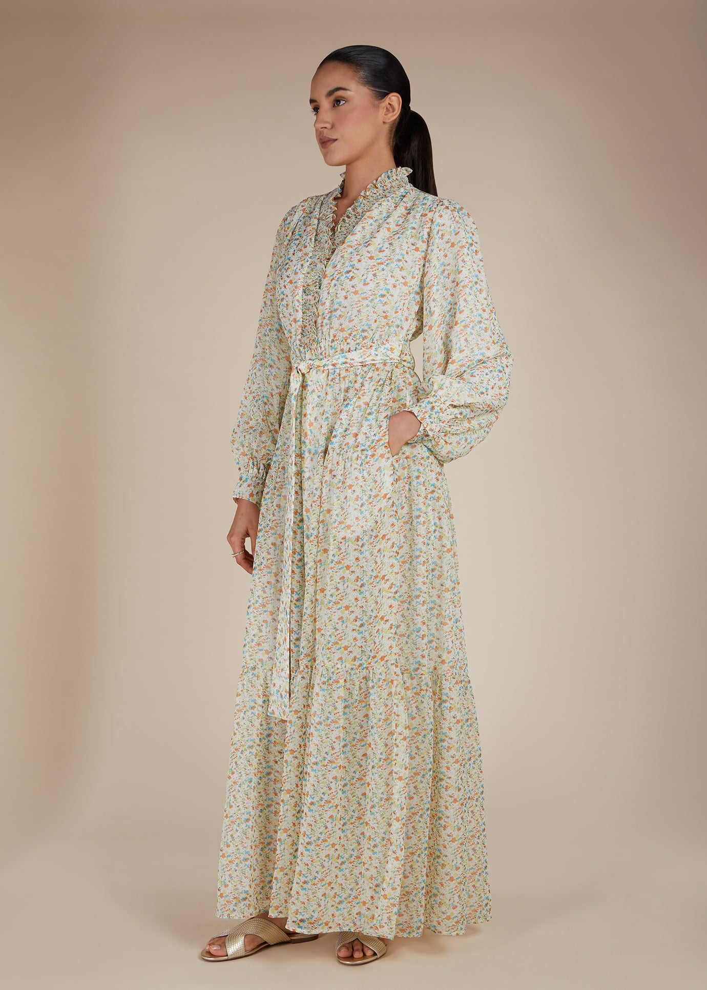 This soft floaty maxi has a fun floral print on a creamy base. Fully lined and designed with feminine tiers and ruffles, the maxi can be cinched at the waist with the self-fabric belt or paired with your own belt for a versatile look. Its loose cut silhouette accommodates the tiers, and we suggest ordering your usual size for the perfect fit. However, if you prefer a more fitted look, you may want to consider sizing down.