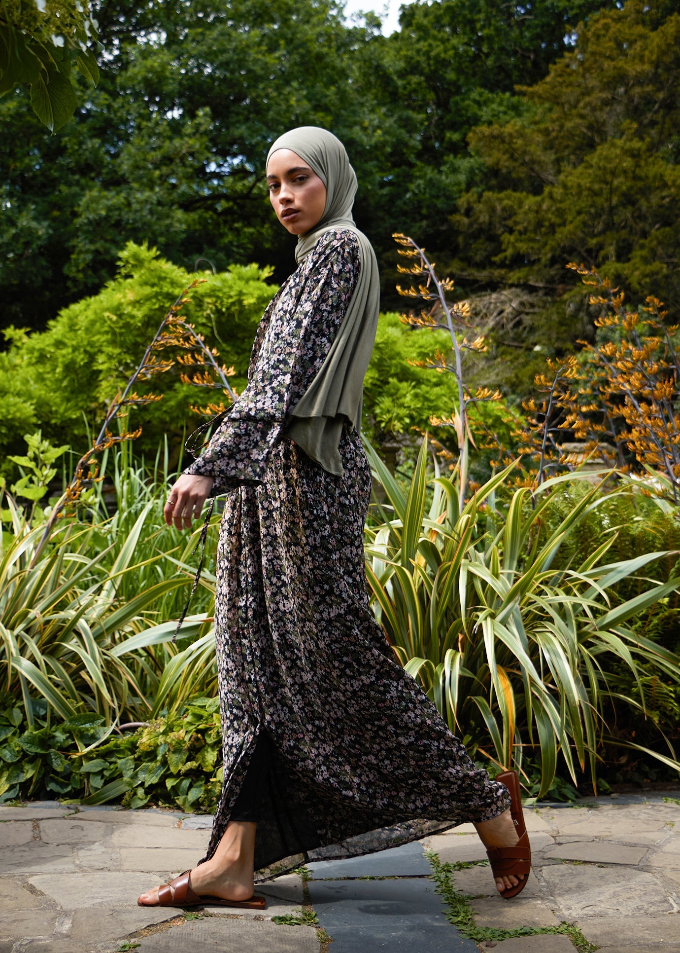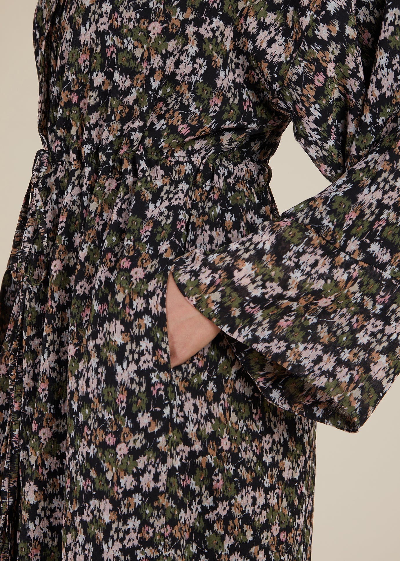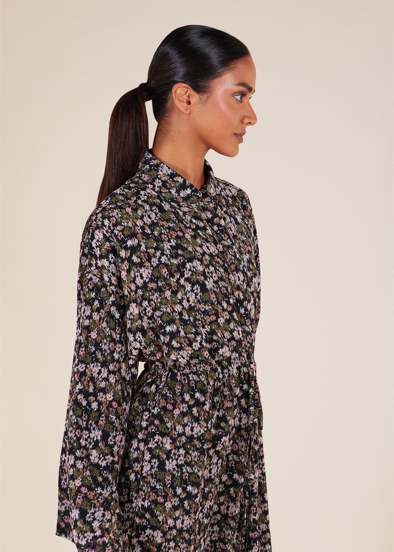 Featuring an innovative graphic camouflage design with delicate floral patterns against a camo green background, this Pastel Camo Maxi offers versatile styling. The boxy silhouette includes an integrated drawstring for customisable fit adjustment according to preference. Complemented by classic collar detailing and functional side pockets that maintain the garment's clean aesthetic.