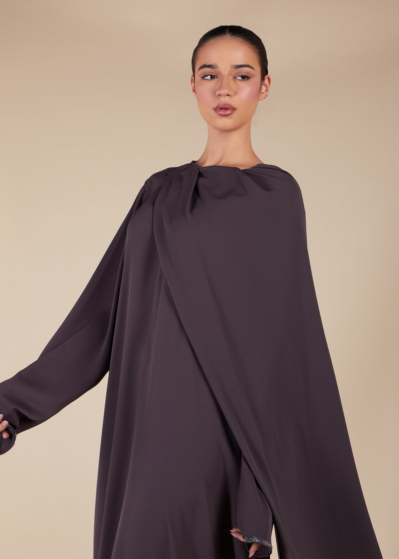 Enhance your Ramadan wardrobe with our Pave Trim Abaya in Mauve. This fluid garment includes an attached scarf with embellishment on the sleeves and end of scarf, adding just the right amount of glamour. Perfect for all your iftars and Tarawih as an all-in-one garment, the attached hijab can be secured with our easy-to-use magnets. Choose from four colours.