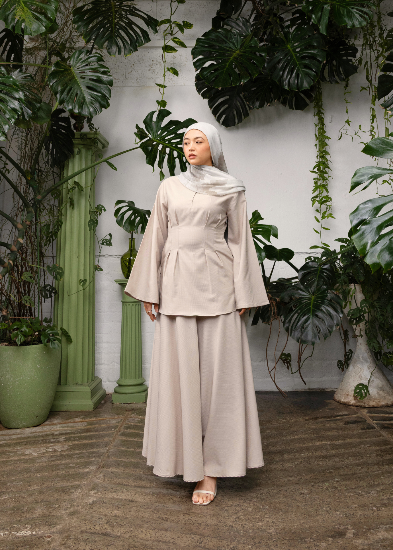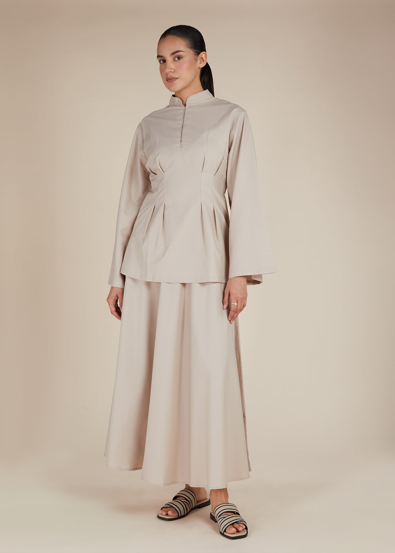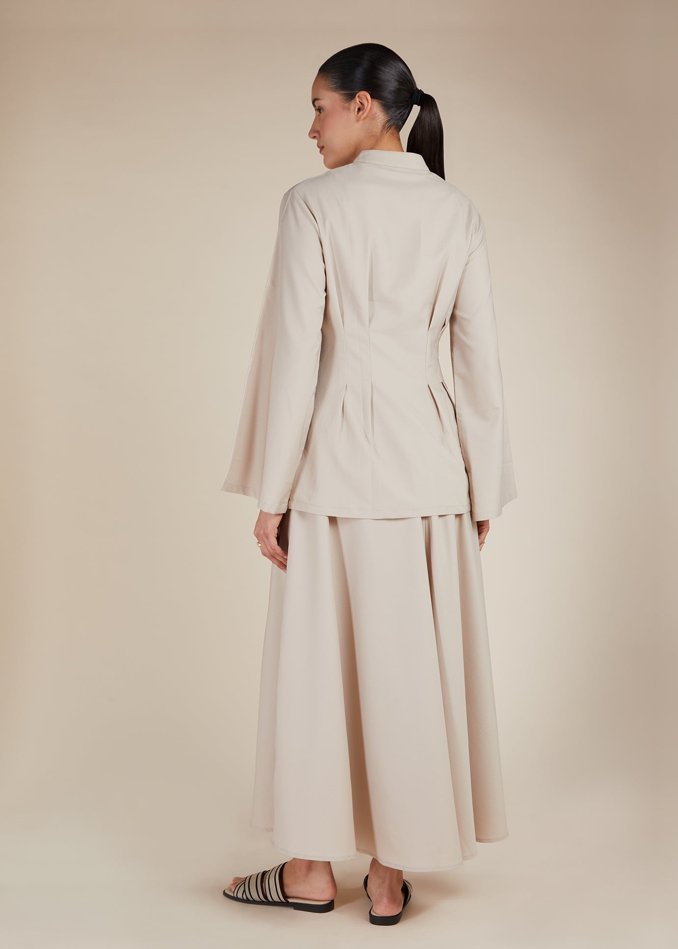 This sophisticated garment blends modesty with modern tailoring. The structured top features pleated detailing for a flattering shape. Designed for comfort and elegance, it’s perfect for formal events, workwear, or special occasions. Pair with our Self-Print Skirt.
