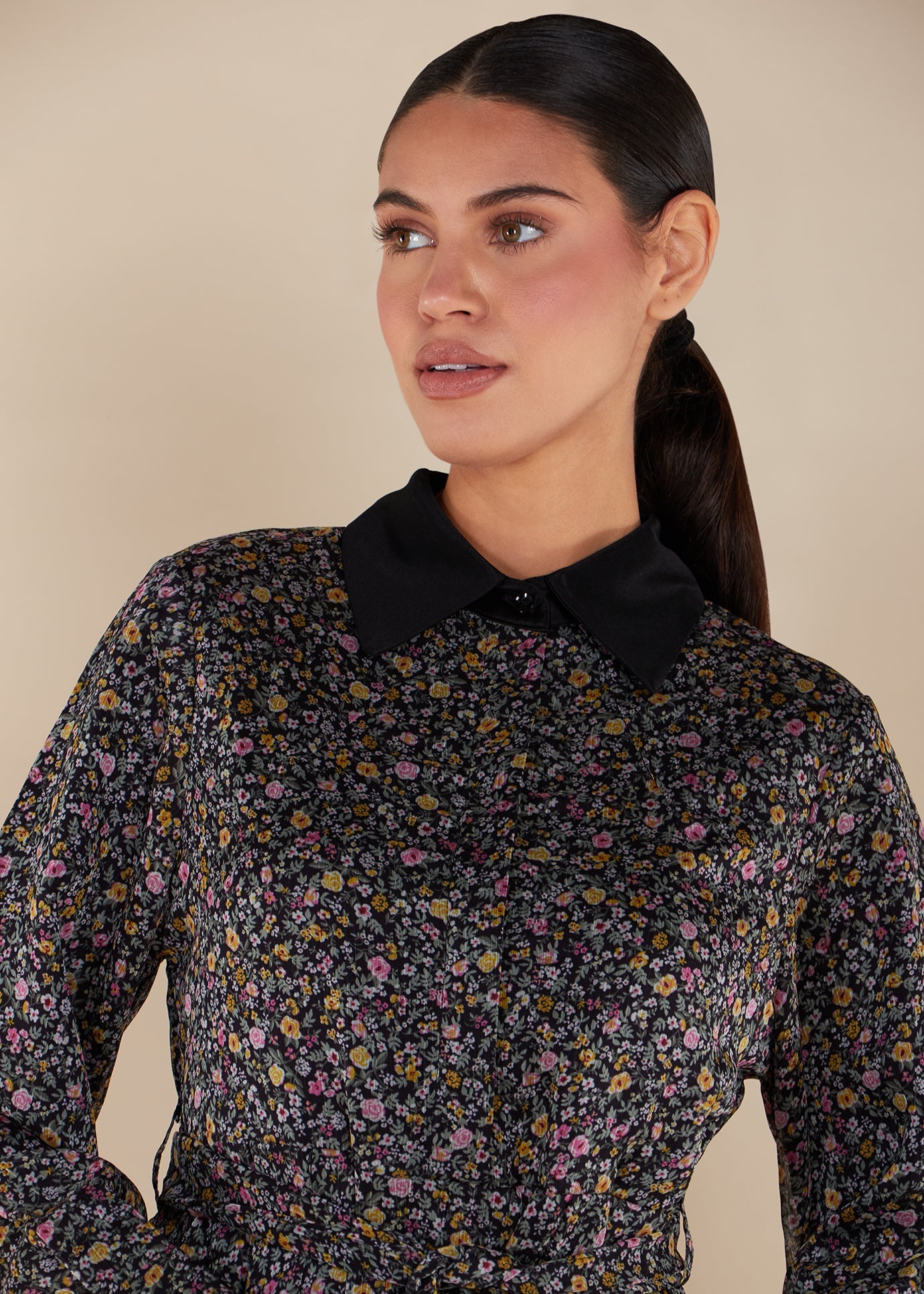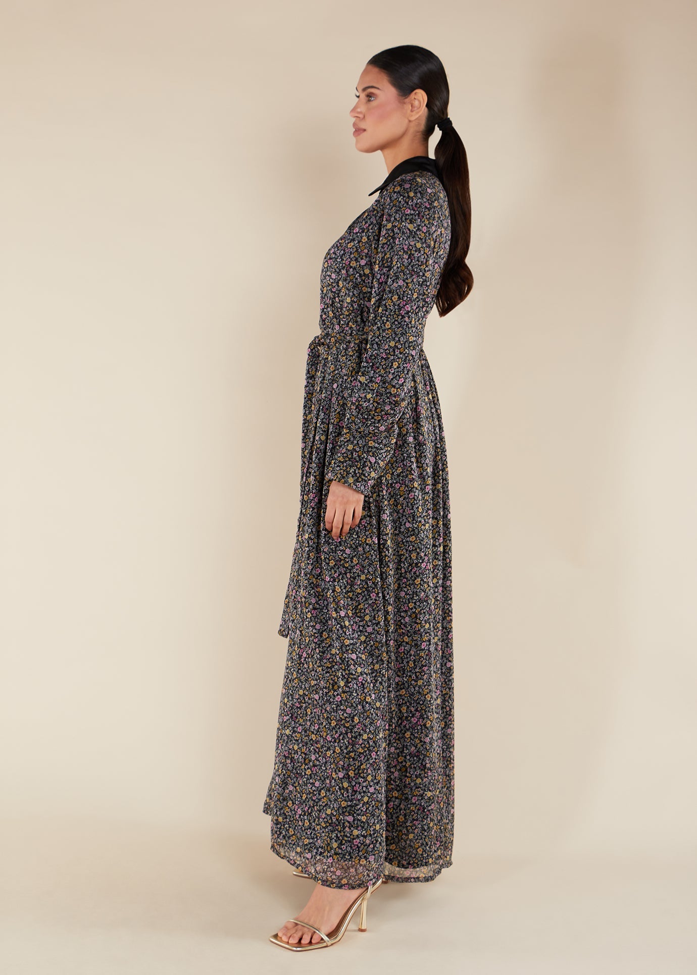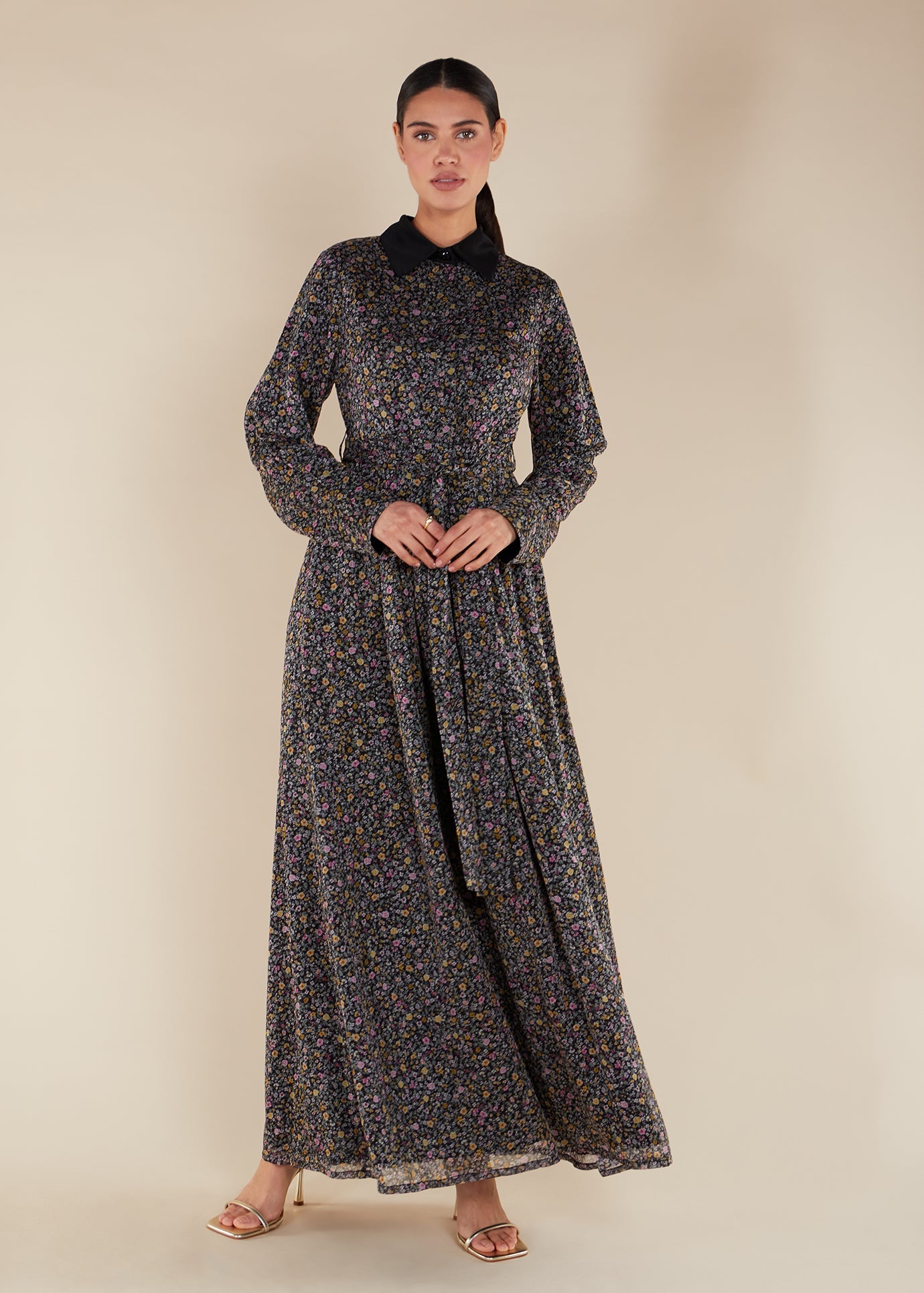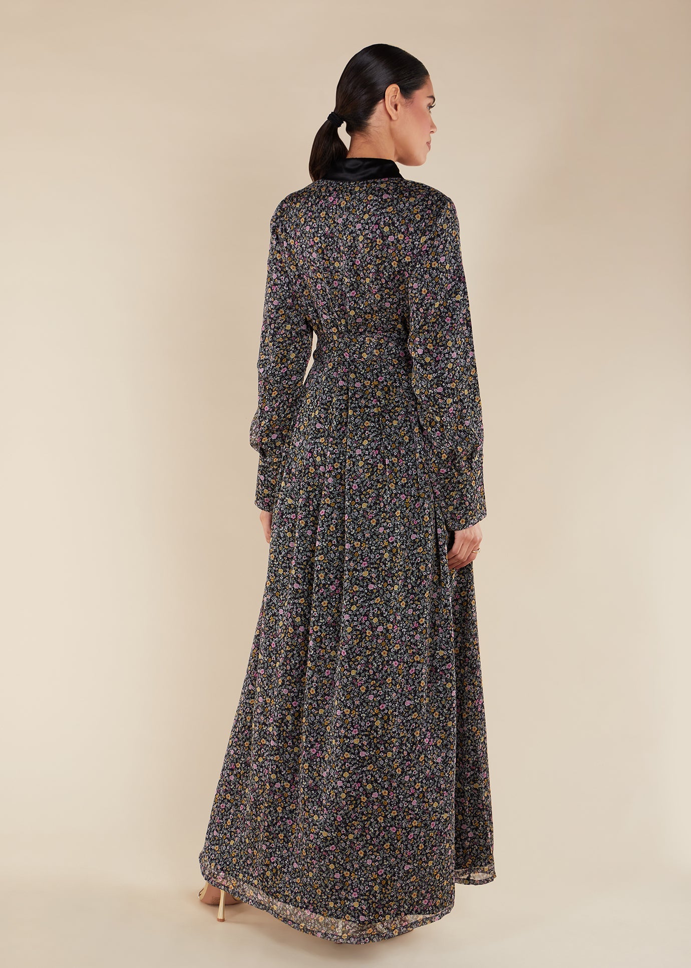 Made from a lightweight crepe fabric, this maxi dress has a delicate and sophisticated floral print that effortlessly transitions from casual to formal with the addition of complementary accessories. Discreet side pockets, black satin collars, and a button opening on the placket offer both function and style.