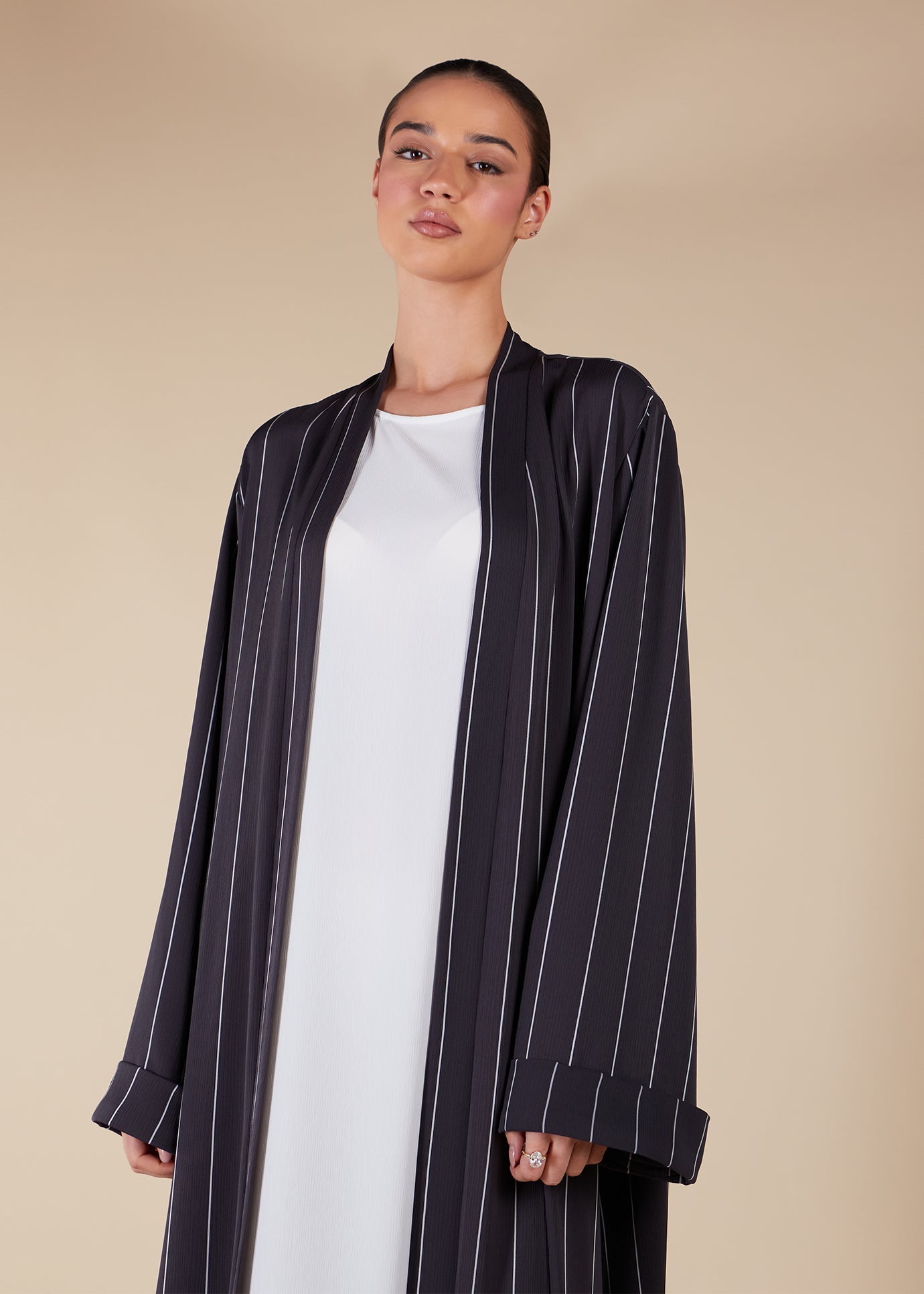 The Pinstripe Grey Open Abaya is now available in pinstripe and three classic colours - Navy, Grey, and Plum. This two-piece includes a full sleeve slip, making it a versatile option for both work wear and a holiday nautical look. It's the perfect addition to your collection of smart basics.