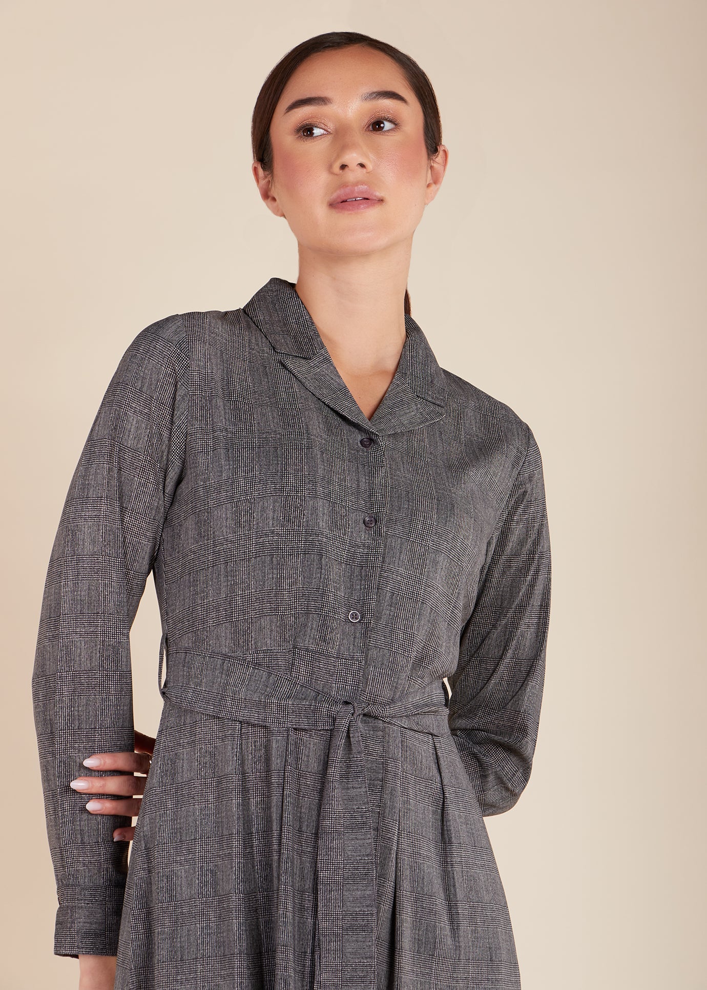 This plaid maxi dress is versatile for both work and formal occasions. It includes a notched collar, buttons along the front, and discreet side pockets. An optional belt is included, or you can pair it with your own.