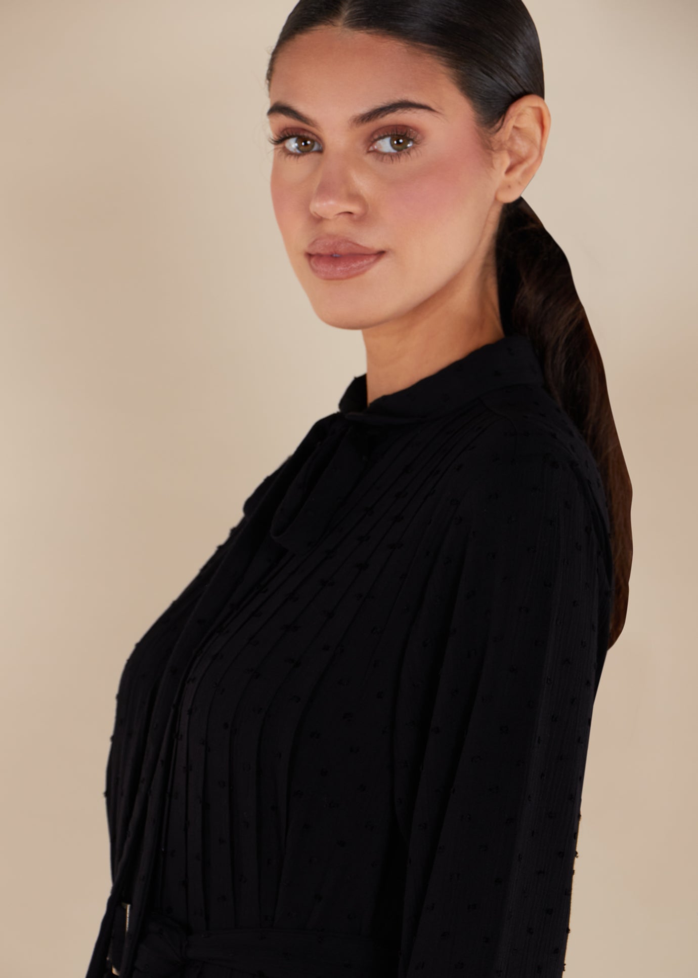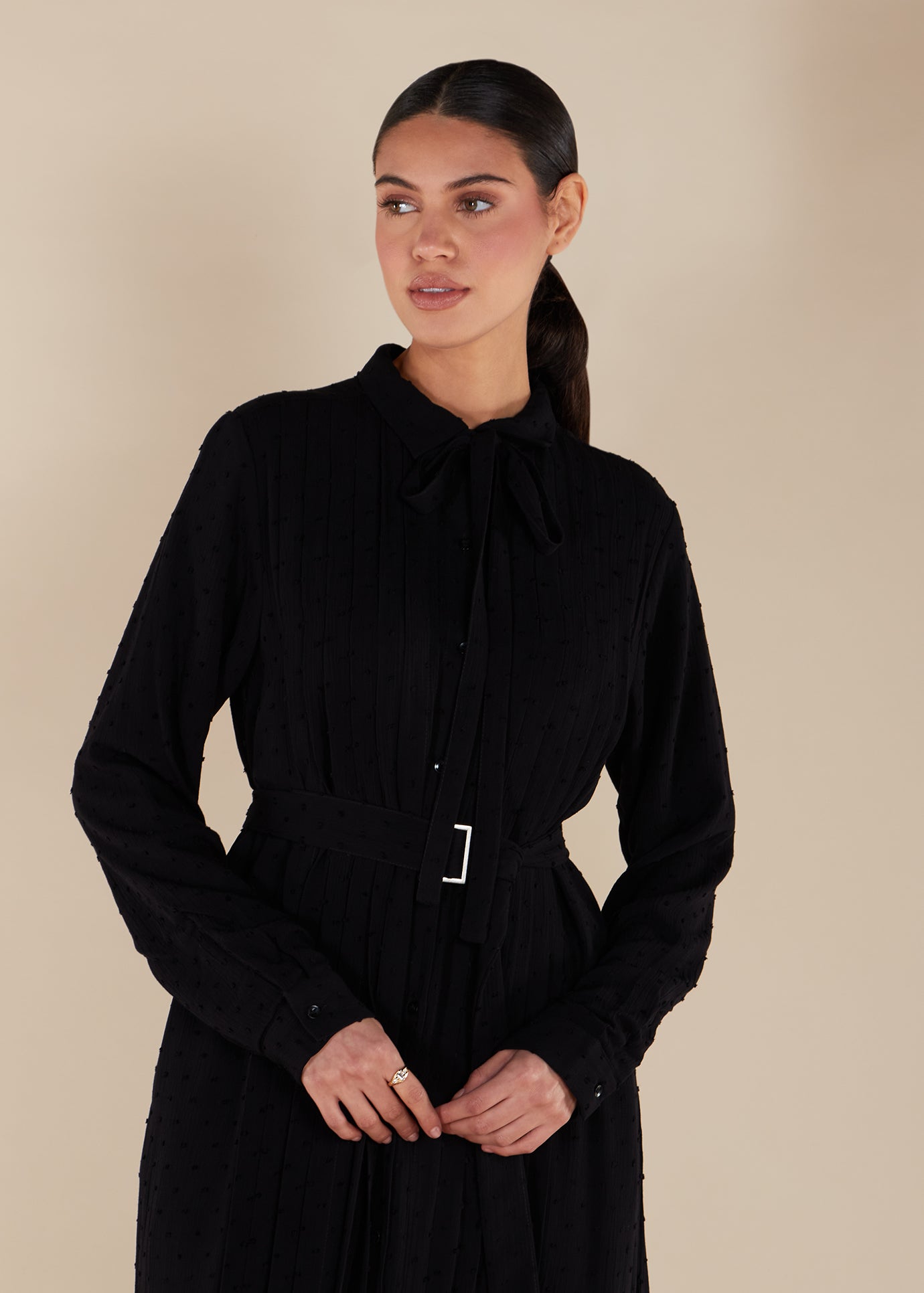 This fully lined maxi has a streamlined silhouette and features pleating detail. The neck features standard collars with a charming necktie, and it even comes with a belt for cinching at the waist. Additional qualities include discreet side pockets, buttoned cuffs, and a button opening that extends all the way through. The ideal choice for any formal occasion.