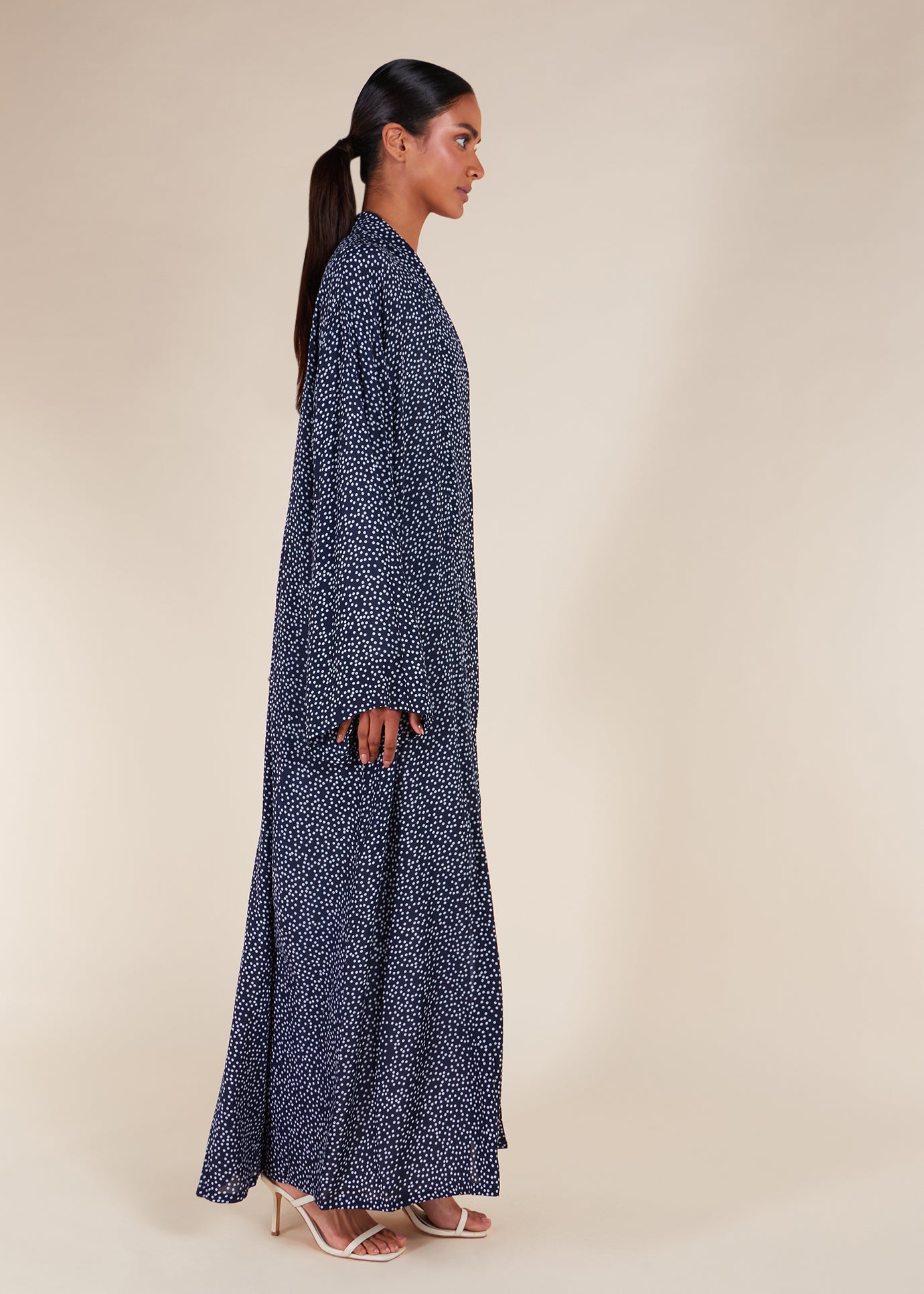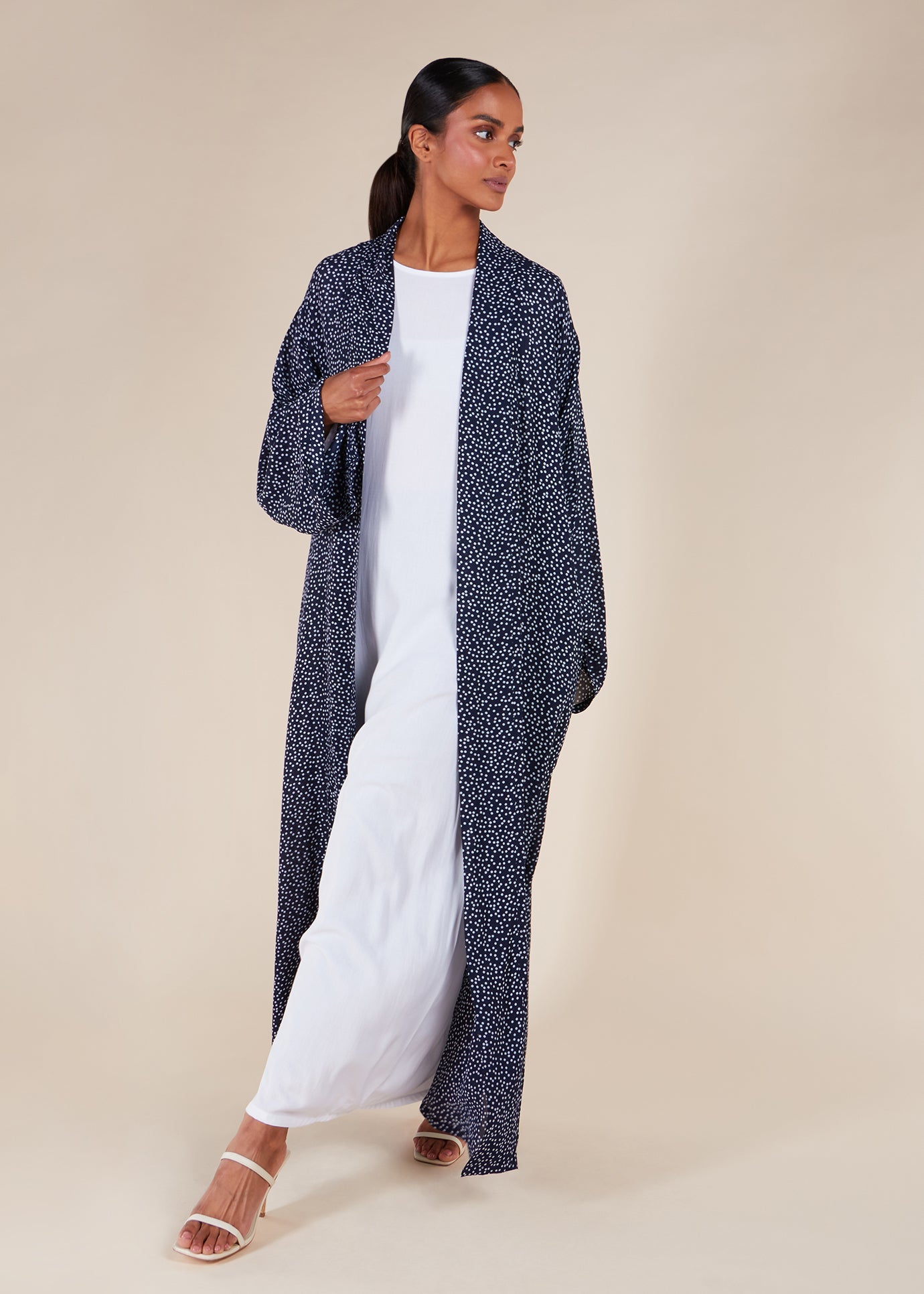 Polka Kimono has a classic polka dot pattern in essential navy, made from lightweight, wrinkle-resistant chiffon. Its regular fit and relaxed silhouette offer versatility, making it an ideal complement to your summer wardrobe. For a polished ensemble, style it with our Full Slips.