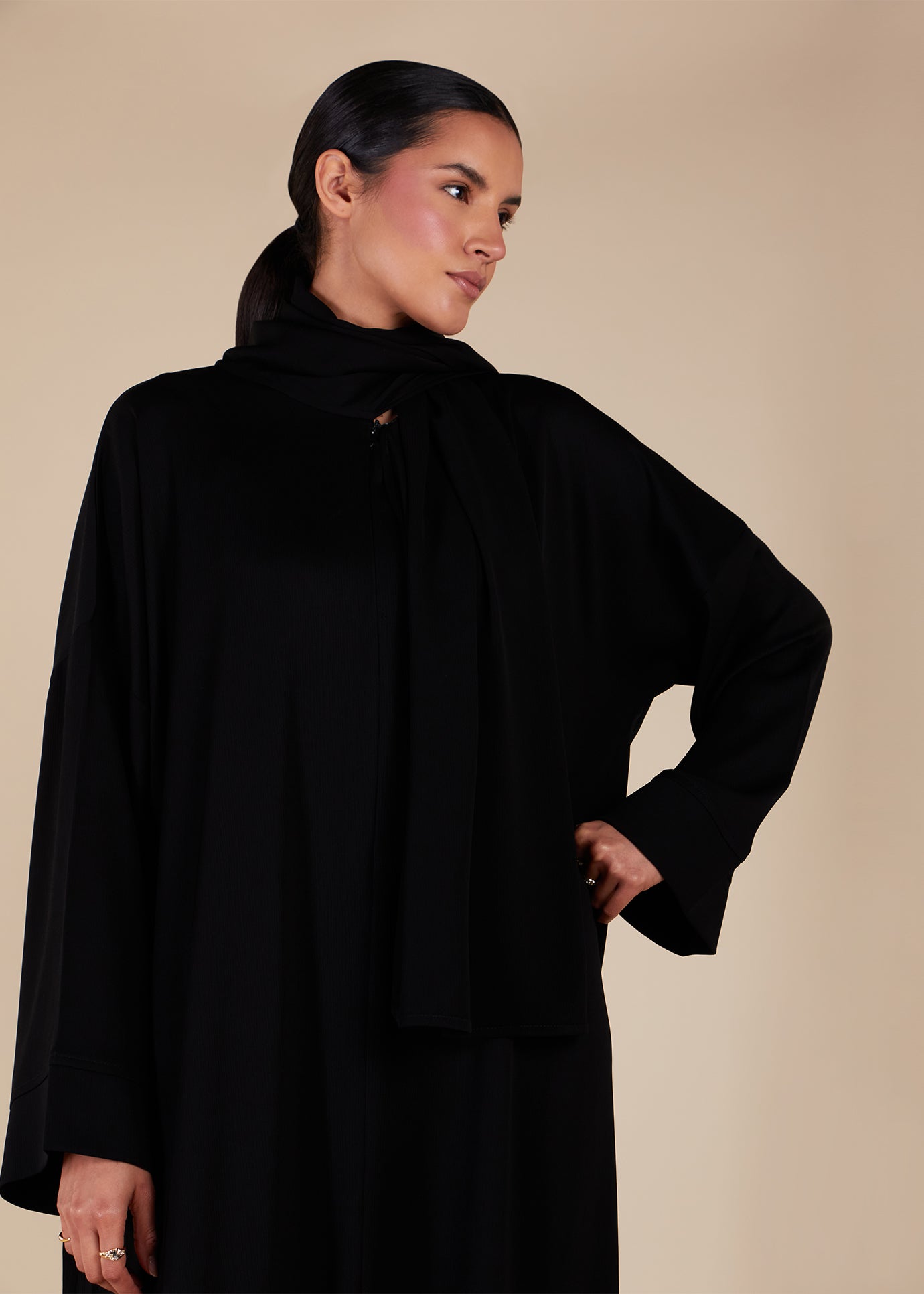 The Abaya is made from a soft crinkle material that has a satin-like texture with a convenient zip-front opening and attached scarf. The scarf can be worn in a relaxed style, or for complete coverage, use our effortless hijab magnets. This piece comes in five colours, making it ideal for gatherings and night prayers, providing unparalleled comfort and ease.
