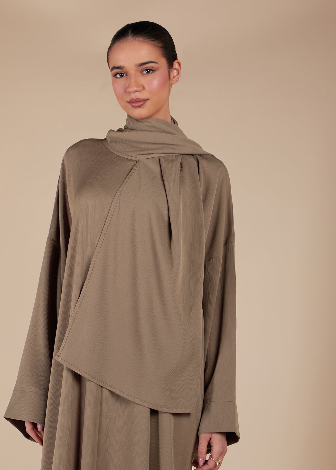 The Abaya is made from a soft crinkle material that has a satin-like texture with a convenient zip-front opening and attached scarf. The scarf can be worn in a relaxed style, or for complete coverage, use our effortless hijab magnets. This piece comes in five colours, making it ideal for gatherings and night prayers, providing unparalleled comfort and ease.