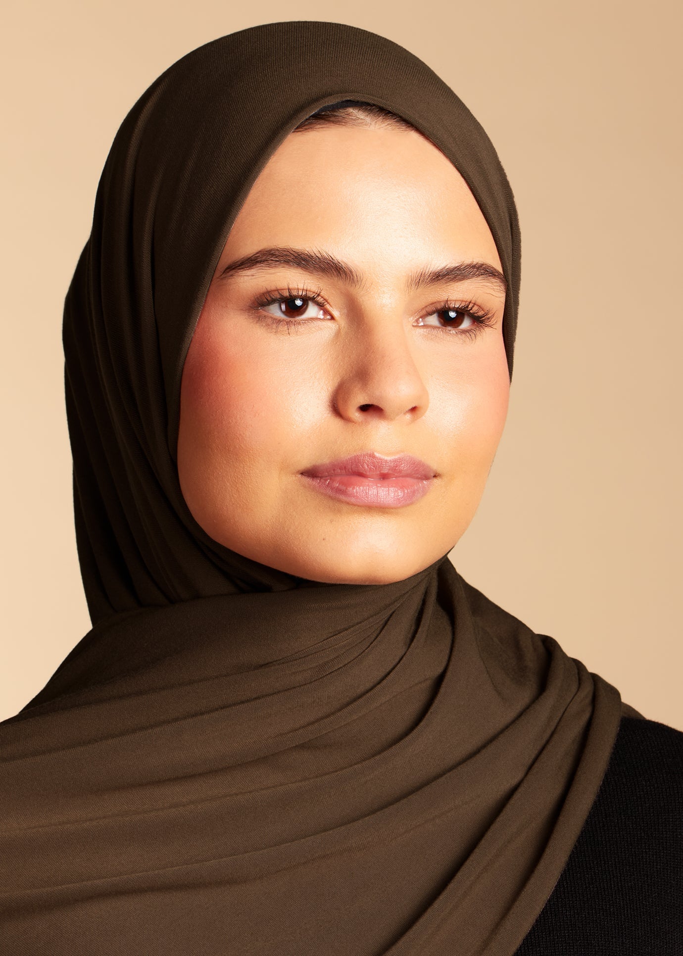 Effortless to style and incredibly comfortable to wear, with a subtle sheen. The medium-thick weight is soft, breathable, fully opaque and durable. Jersey works well in all climates, can be worn without an under scarf or pins, and makes a great option for working out.