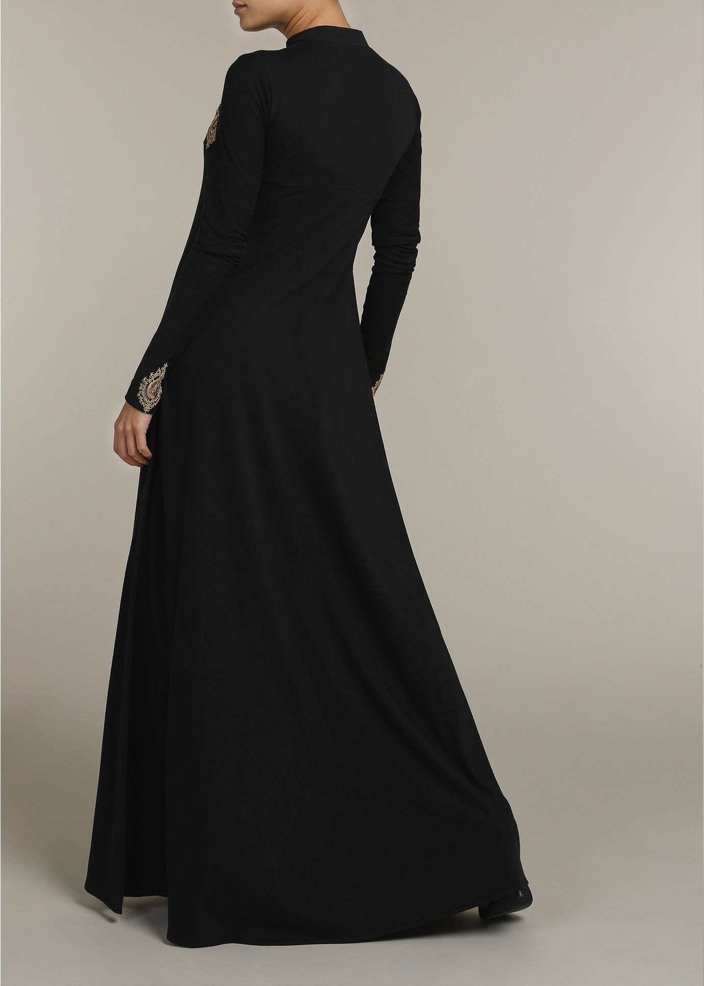 A classic black abaya featuring a v neck collar & detailed embroidery on the bodice & sleeve cuffs. Cut in a line silhouette providing you with lots of movement whilst you walk. Style with our selection of chiffon silk hijabs for a luxurious finish.