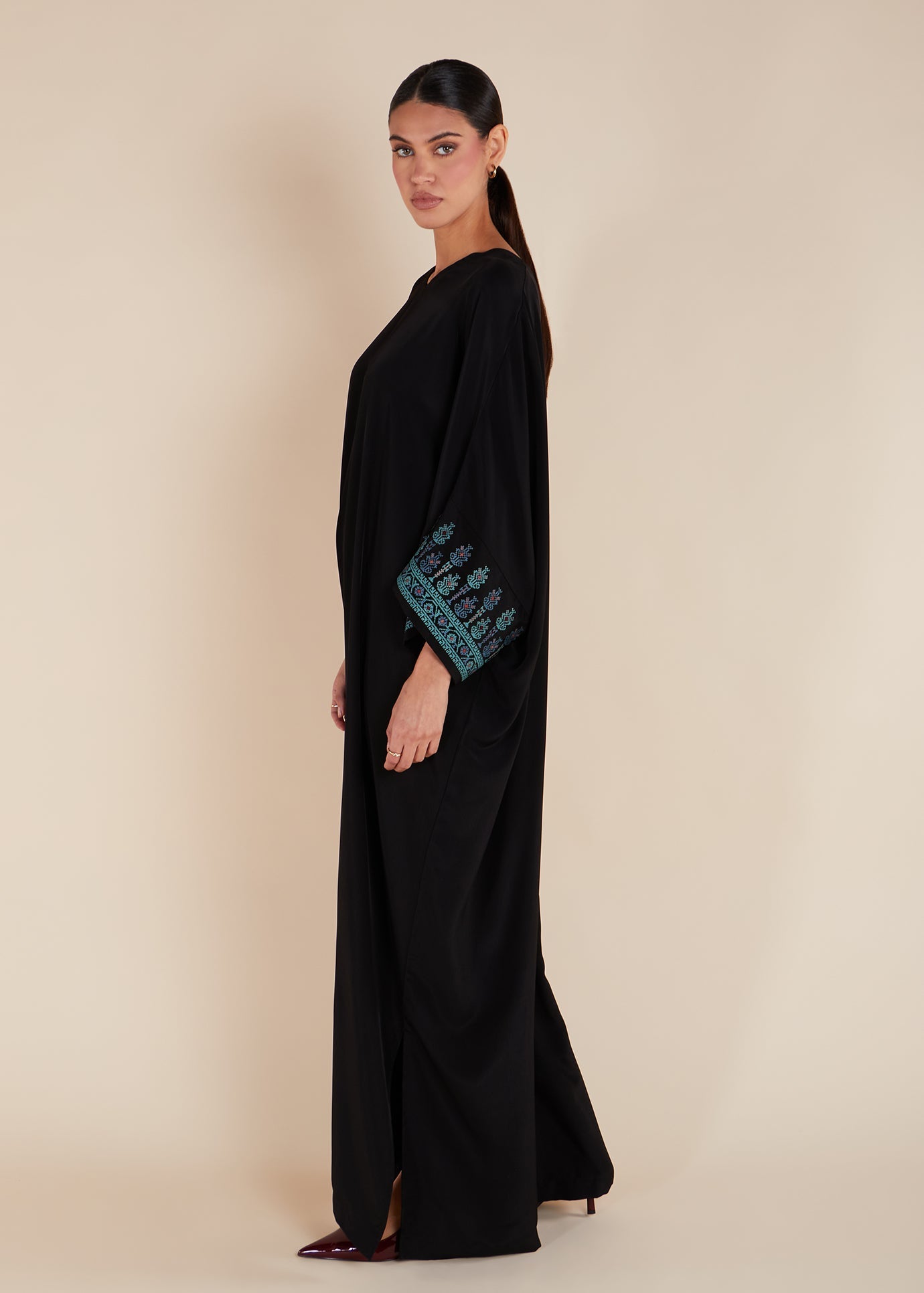 Featuring a subtle V-neck and side slits for comfortable movement, this kaftan offers a loose fit and stunning, heavily cross-stitched embroidered sleeves. Vibrant turquoise blue is accented with eye-catching pops of red and pink for a truly striking look.