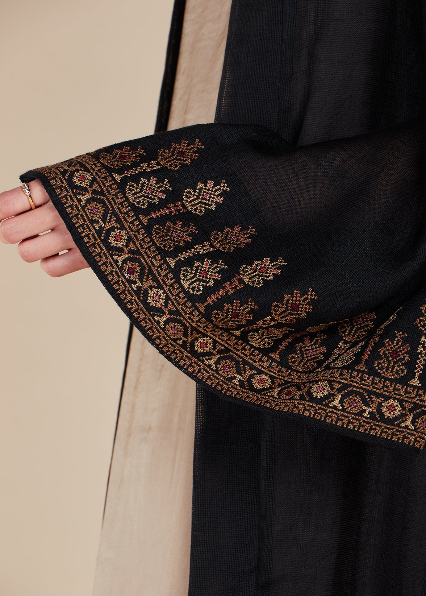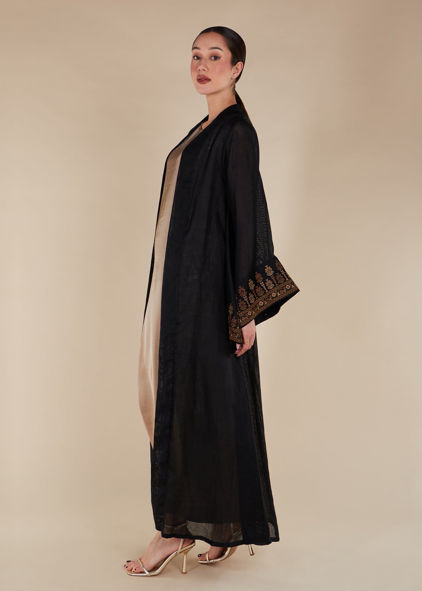 Made from a cotton jute fabric, the Qowara Kimono features a modest cut with cross stitch embroidery on the sleeves. Due to the fabric's natural properties, the kimono has a sheer look. For complete modesty, we recommend pairing it with one of our full sleeve slips.