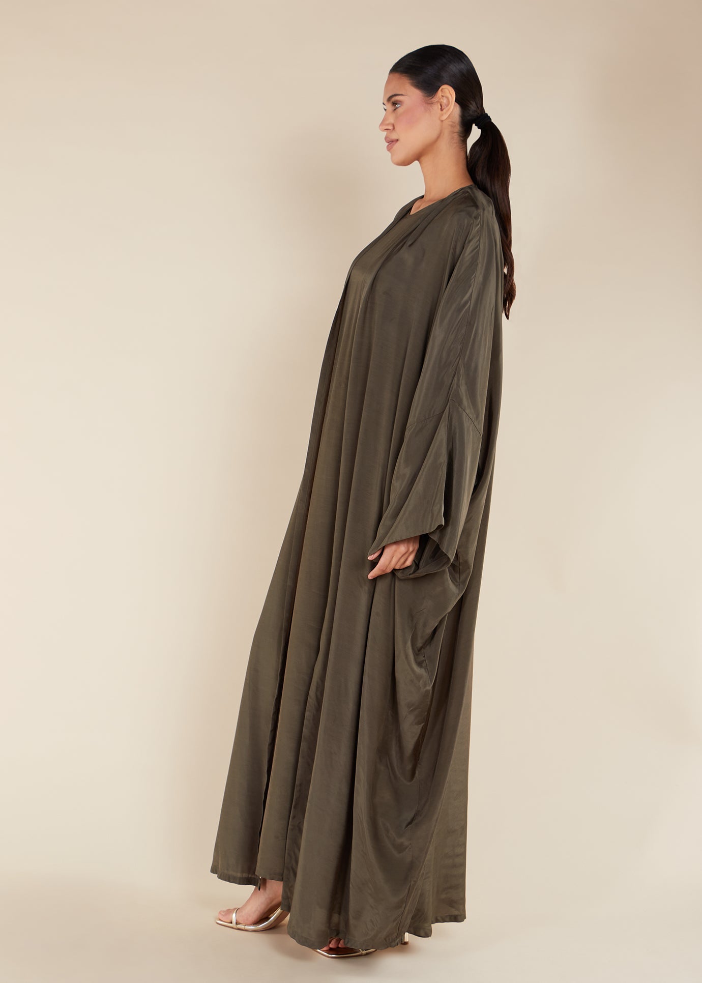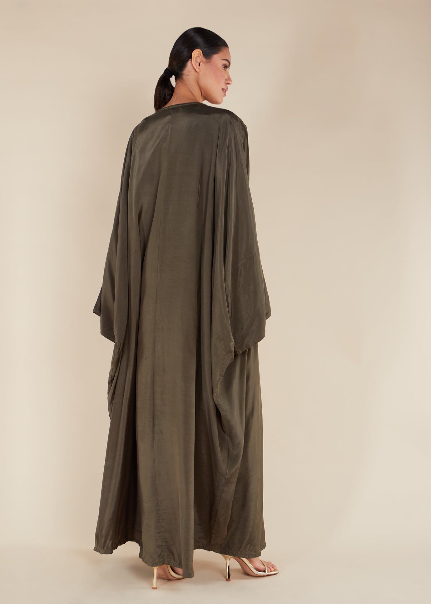 This elegant open abaya comes in a rich olive tone and has a fluid silk feel touch. For a complete look, pair it with the matching slip and accessorise with gold accessories.